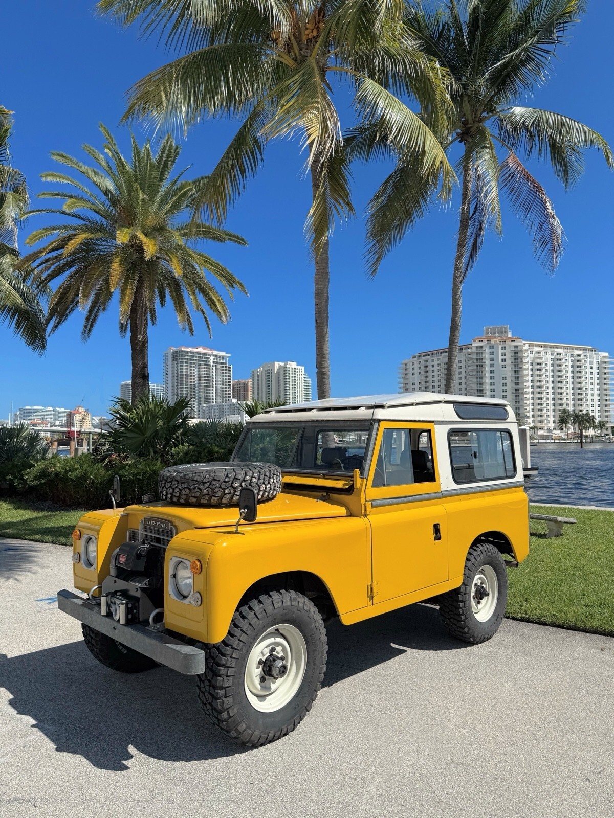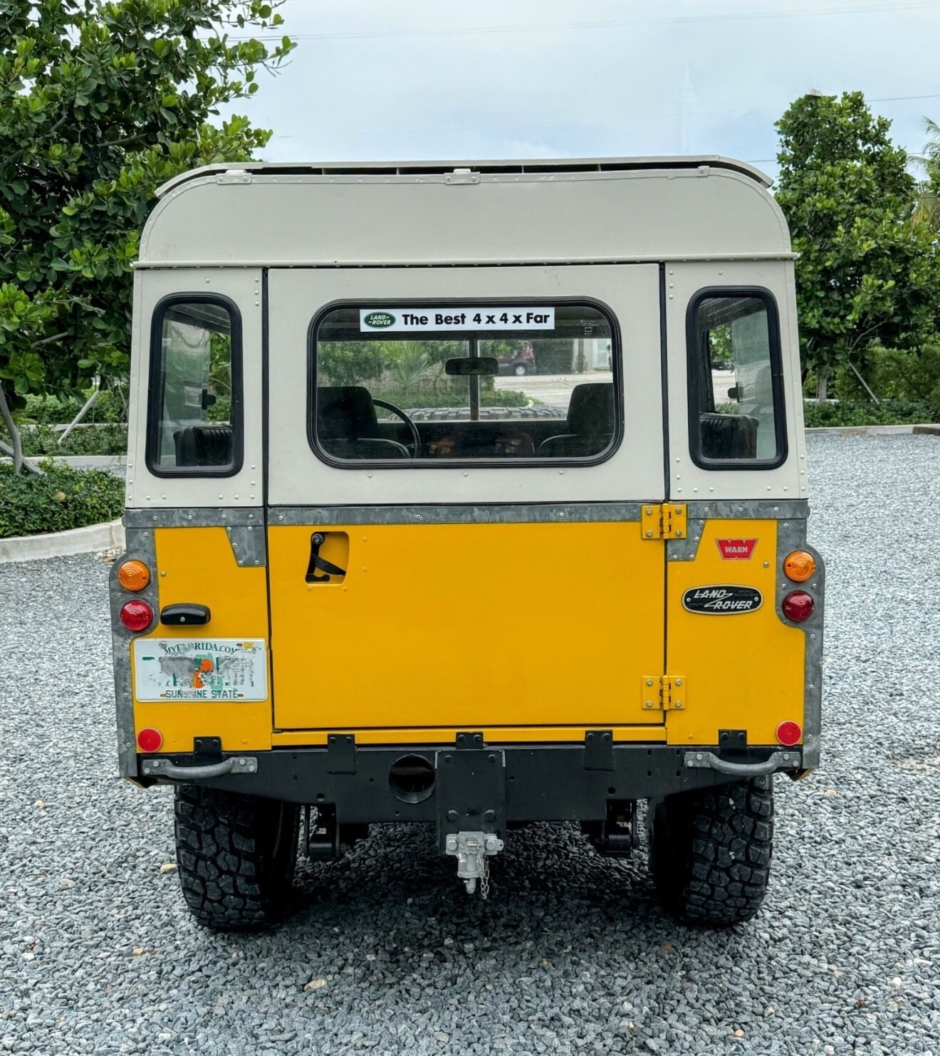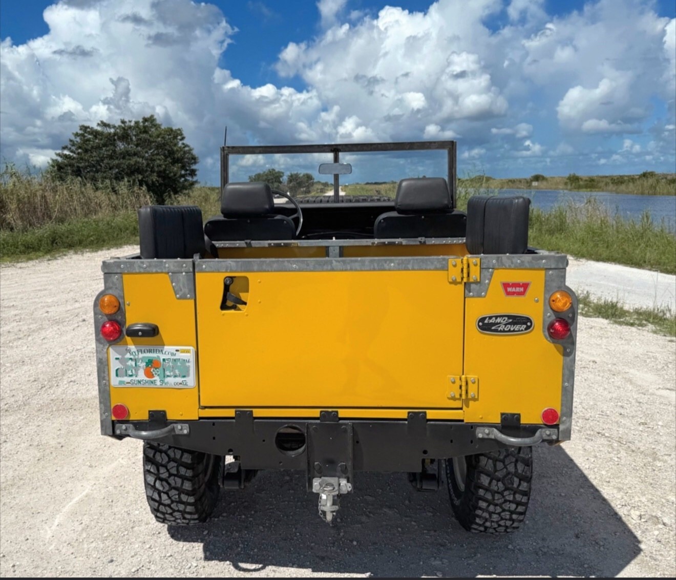 Stainless-steel exhaust system, electronic ignition, manually locking front hubs, removable tropical roof, swing away split tailgate assembly that allows easy acces for the rear passengers, removable door tops, two-speed transfer case, 8000 pounds Warn winch, folding windshield, NOS BF Goodrich KM2 tires with less than 300 miles, 16″ steel wheels, hood mounted spare tire, rear recovery hitch, lifting/towing rings, three-point front seat belts, fender-mounted side mirrors.