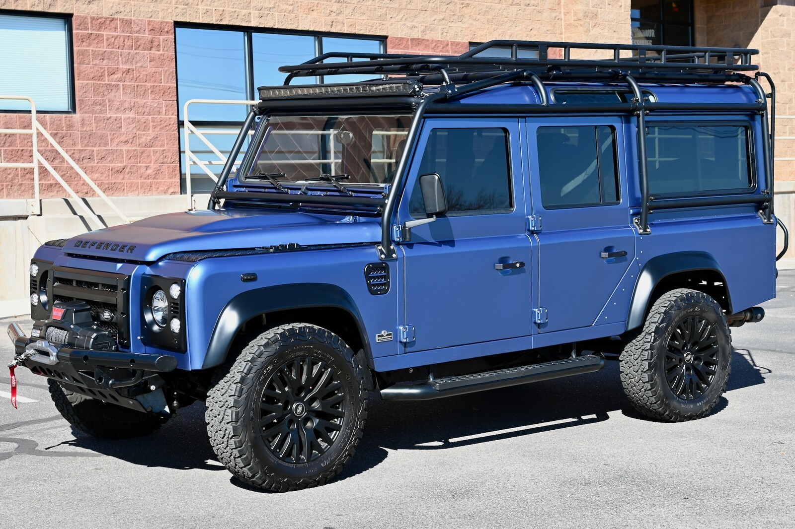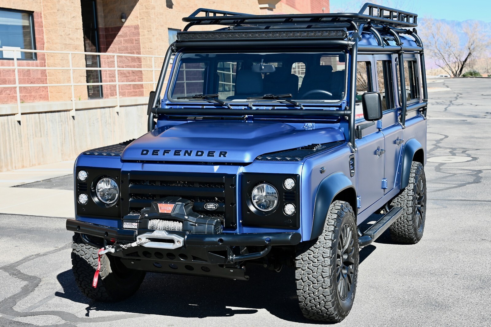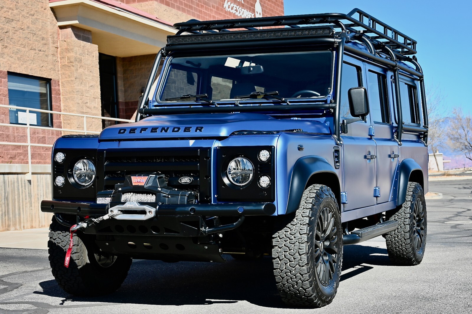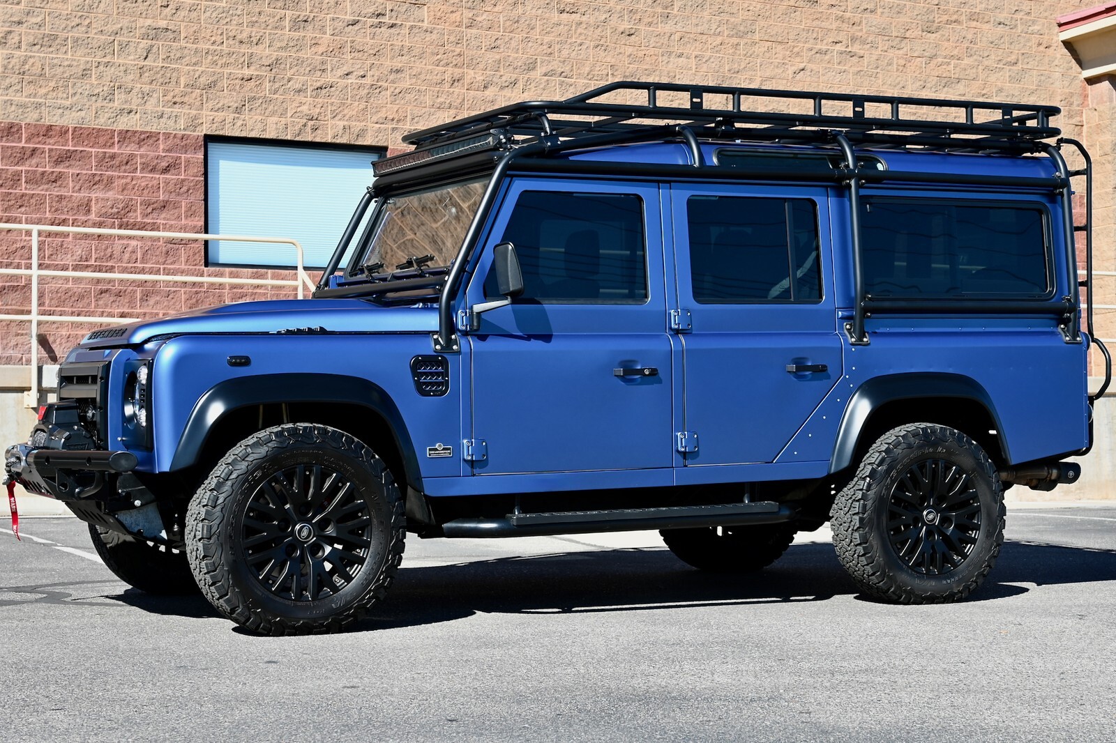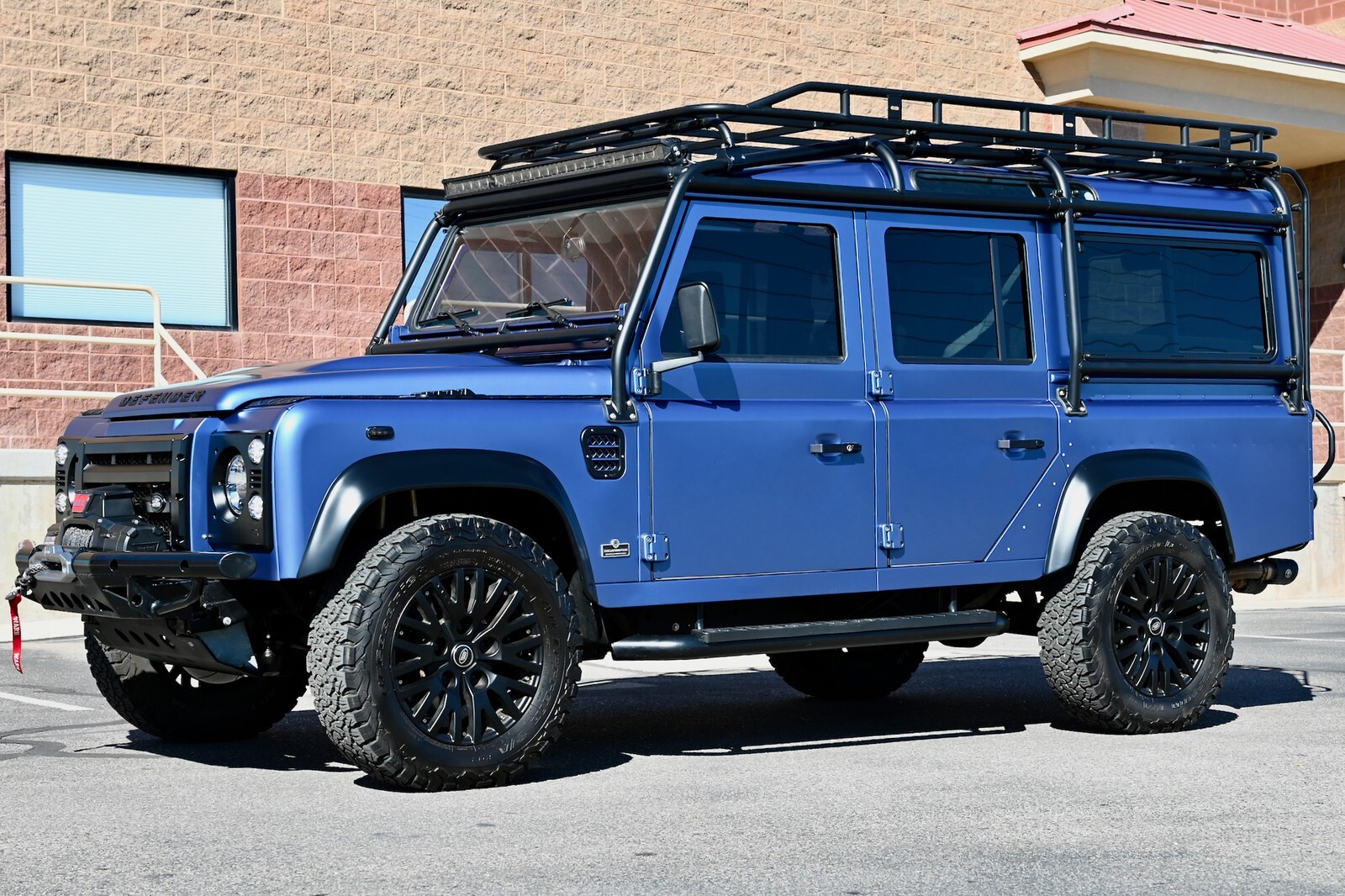 This particular build was commissioned for a high-end client here in Utah, and started w/ a 1994 Land Rover Defender 110 4-Door Crew Cab donor, that was in excellent condition to start with, and 100% rust-free. It then underwent a no-expense spared body-off restoration, full nut & bolt, using all brand-new high-quality parts & components. The body was finished in Bursting Blue, using high-quality Spies Hecker paint and implementing a new multi-layer system, including aluminum primer, as well as base-coat & clear-coat. Exterior features & upgrades include: KBX nose upgrade, PUMA classic doors upgrade, Safety Devices D110 roll cage, Safety Devices roof-rack w/ ladder, metal PUMA hood w/ stainless-steel fixings, Bigfoot front bumper, Terrafirma NAS rear step-bumper, Fire & Ice step-up bars, diamond-plate exterior package, WARN ZEON 10-S remote-controlled winch, Angel Eyes 007 LED headlight & taillight package, LED light bar on top of cage up front, LED reverse lights on top of cage in the rear, swing-away spare wheel carrier, satin black high-grade billet aluminum push-button door handles and fuel filler cap, steering guard, and much more. The original frame was industrially cleaned (internally & externally), shot blasted, epoxy coated, and then completely painted. All of the suspension was upgraded w/ high performance shocks, as well as heavy-duty anti-roll bars on the front & rear. This awesome truck rolls on black 18” KAHN 1983 alloy wheels, wrapped w/ BF Goodrich All Terrain T/A K02 tires (LT265/65/R18). She has a perfect stance and looks absolutely amazing. You can walk around this truck a hundred times and you will never find a bad angle.