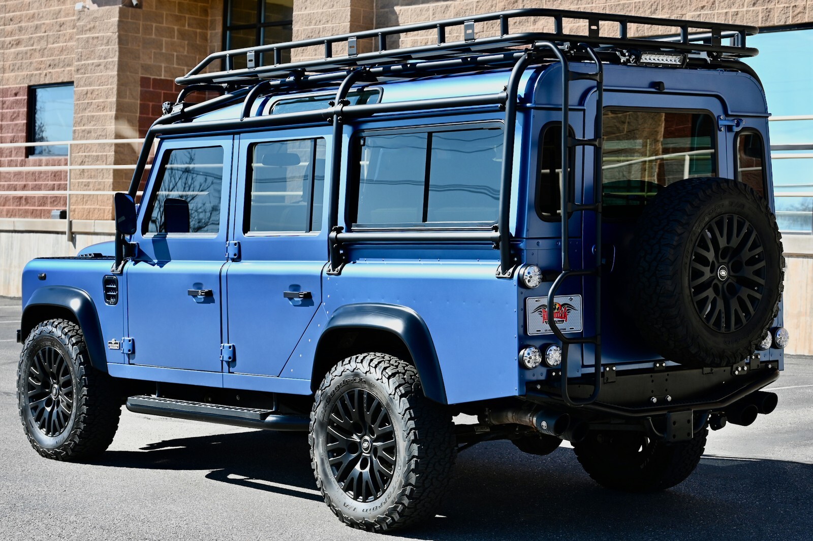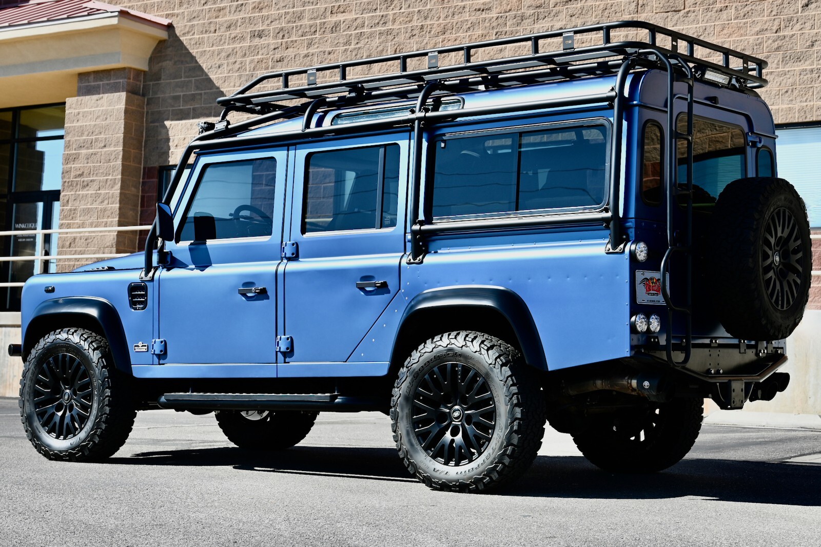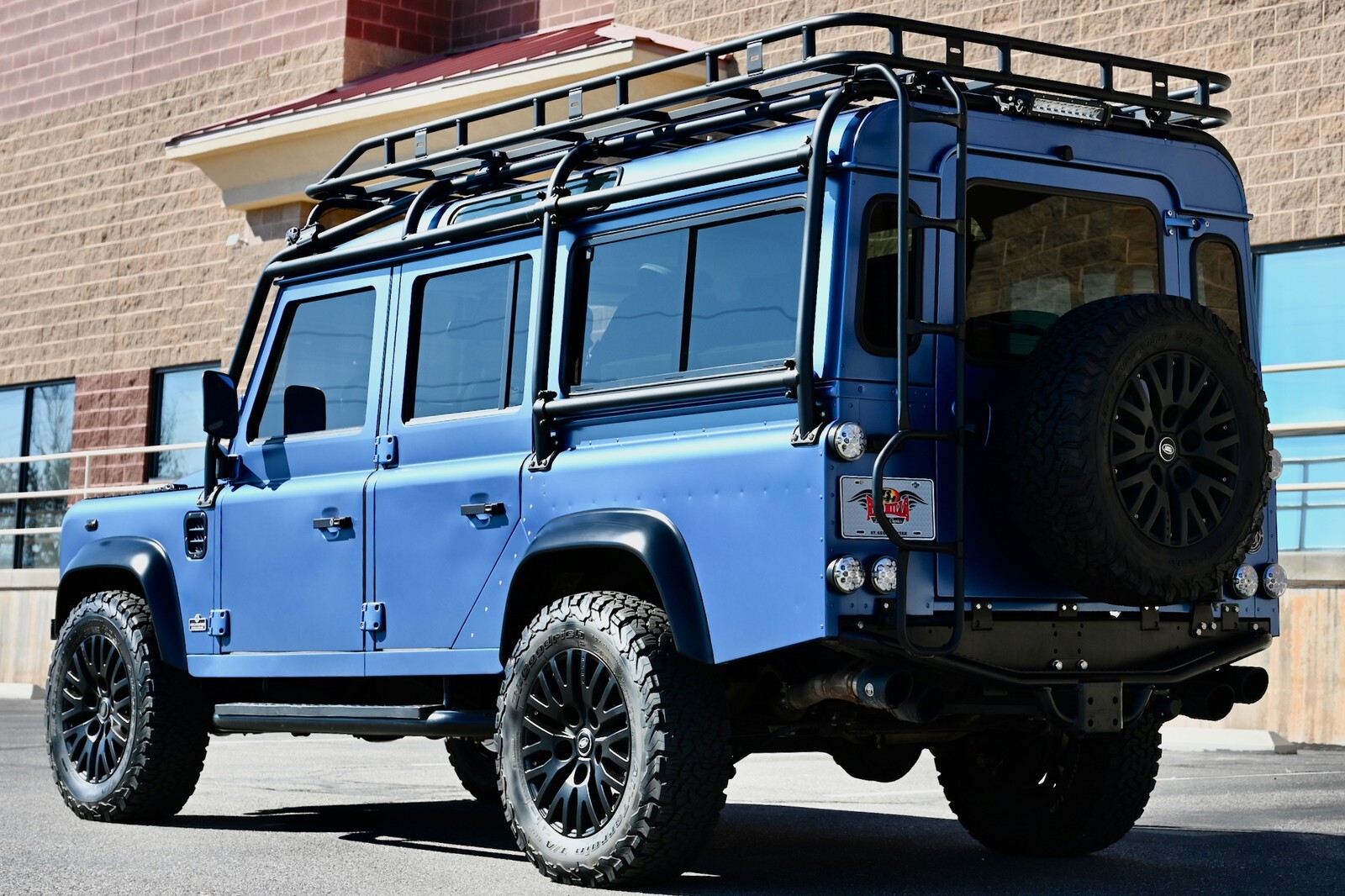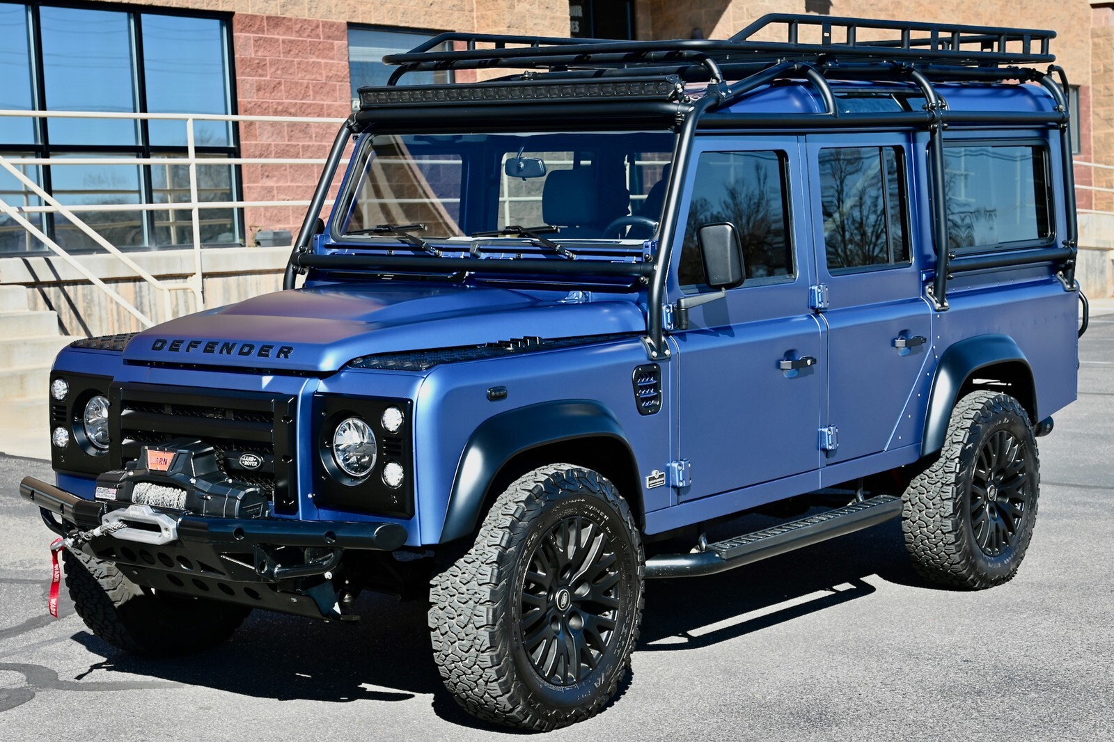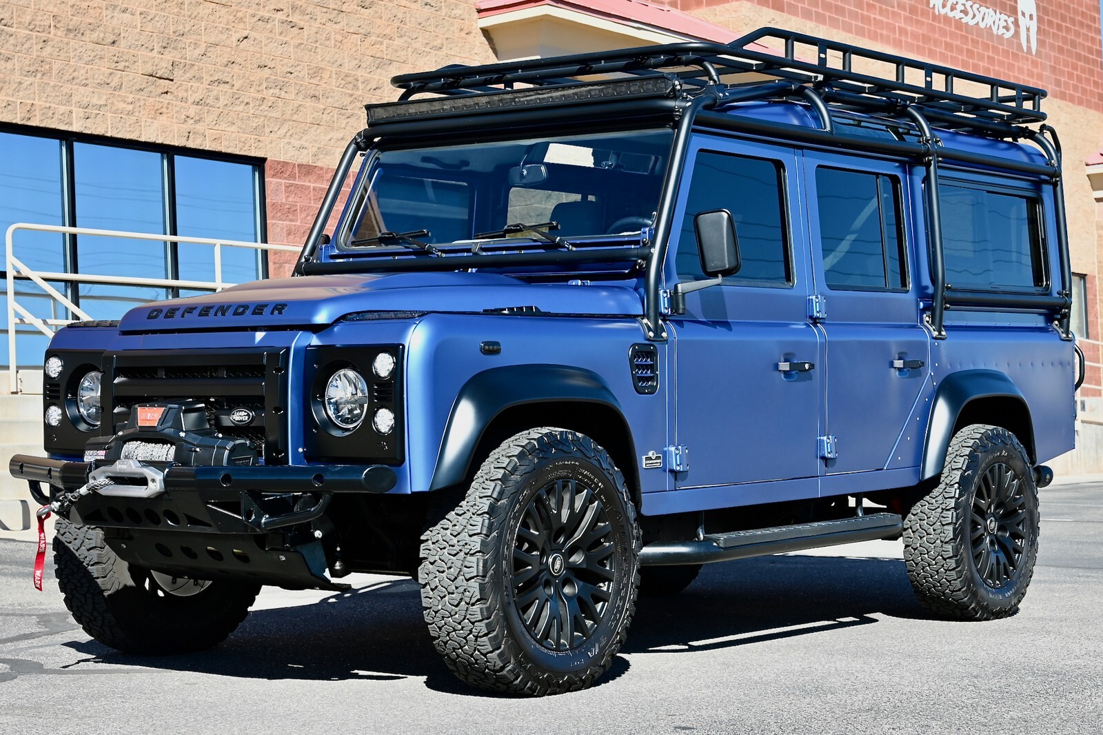 This particular build was commissioned for a high-end client here in Utah, and started w/ a 1994 Land Rover Defender 110 4-Door Crew Cab donor, that was in excellent condition to start with, and 100% rust-free. It then underwent a no-expense spared body-off restoration, full nut & bolt, using all brand-new high-quality parts & components. The body was finished in Bursting Blue, using high-quality Spies Hecker paint and implementing a new multi-layer system, including aluminum primer, as well as base-coat & clear-coat. Exterior features & upgrades include: KBX nose upgrade, PUMA classic doors upgrade, Safety Devices D110 roll cage, Safety Devices roof-rack w/ ladder, metal PUMA hood w/ stainless-steel fixings, Bigfoot front bumper, Terrafirma NAS rear step-bumper, Fire & Ice step-up bars, diamond-plate exterior package, WARN ZEON 10-S remote-controlled winch, Angel Eyes 007 LED headlight & taillight package, LED light bar on top of cage up front, LED reverse lights on top of cage in the rear, swing-away spare wheel carrier, satin black high-grade billet aluminum push-button door handles and fuel filler cap, steering guard, and much more. The original frame was industrially cleaned (internally & externally), shot blasted, epoxy coated, and then completely painted. All of the suspension was upgraded w/ high performance shocks, as well as heavy-duty anti-roll bars on the front & rear. This awesome truck rolls on black 18” KAHN 1983 alloy wheels, wrapped w/ BF Goodrich All Terrain T/A K02 tires (LT265/65/R18). She has a perfect stance and looks absolutely amazing. You can walk around this truck a hundred times and you will never find a bad angle.