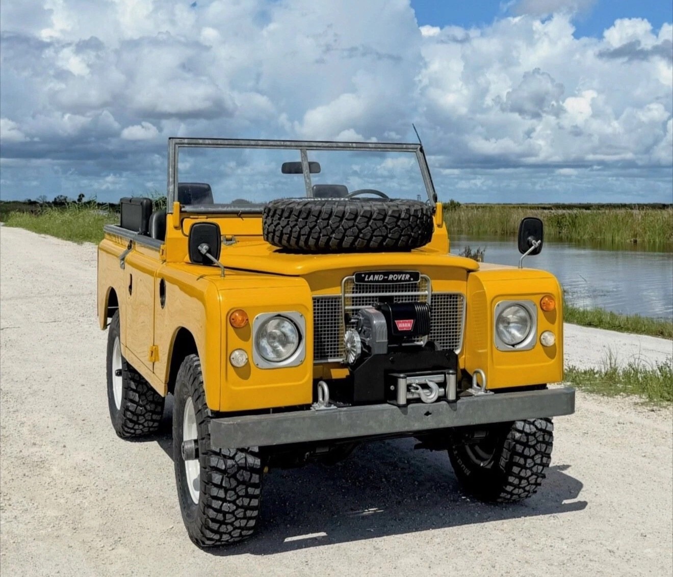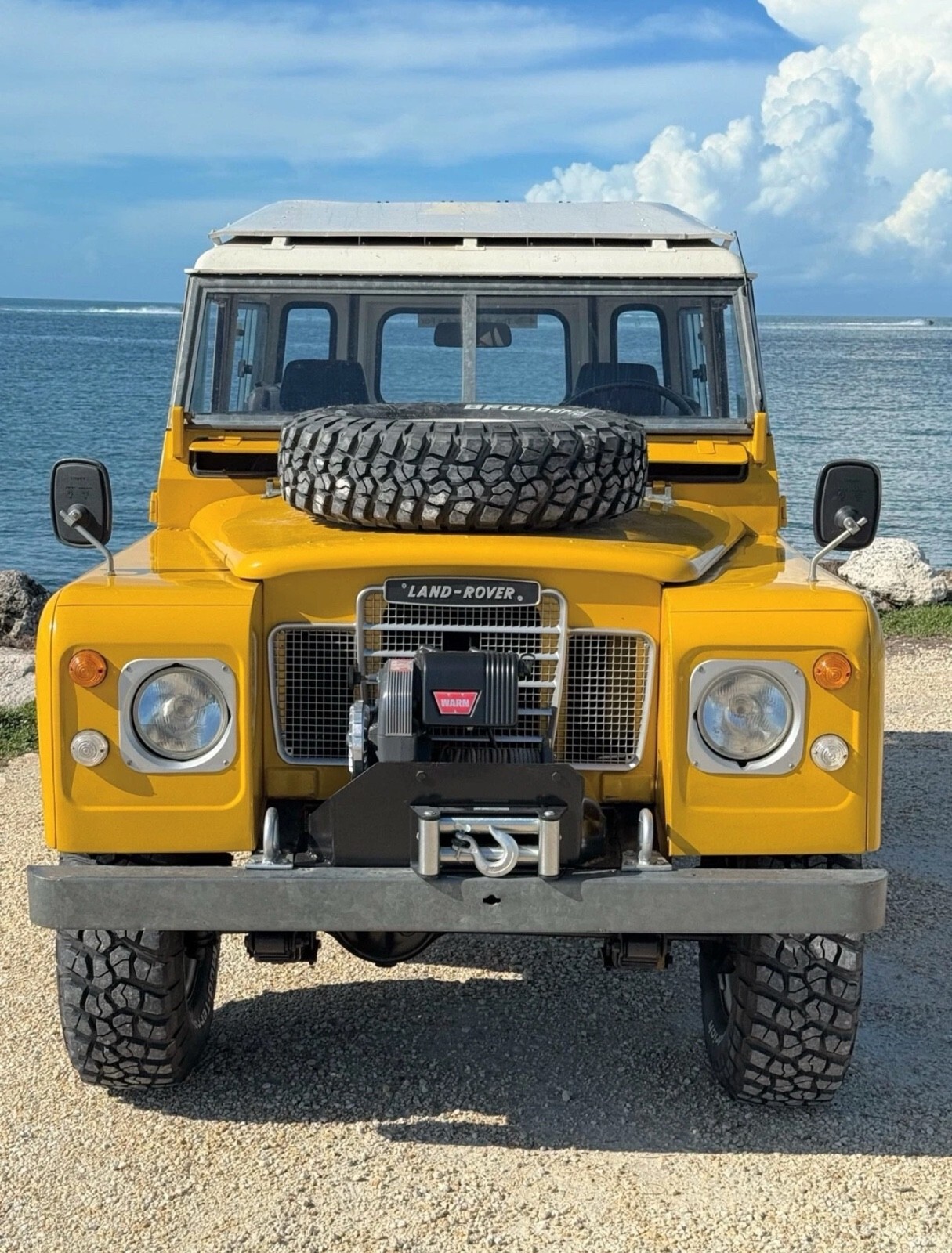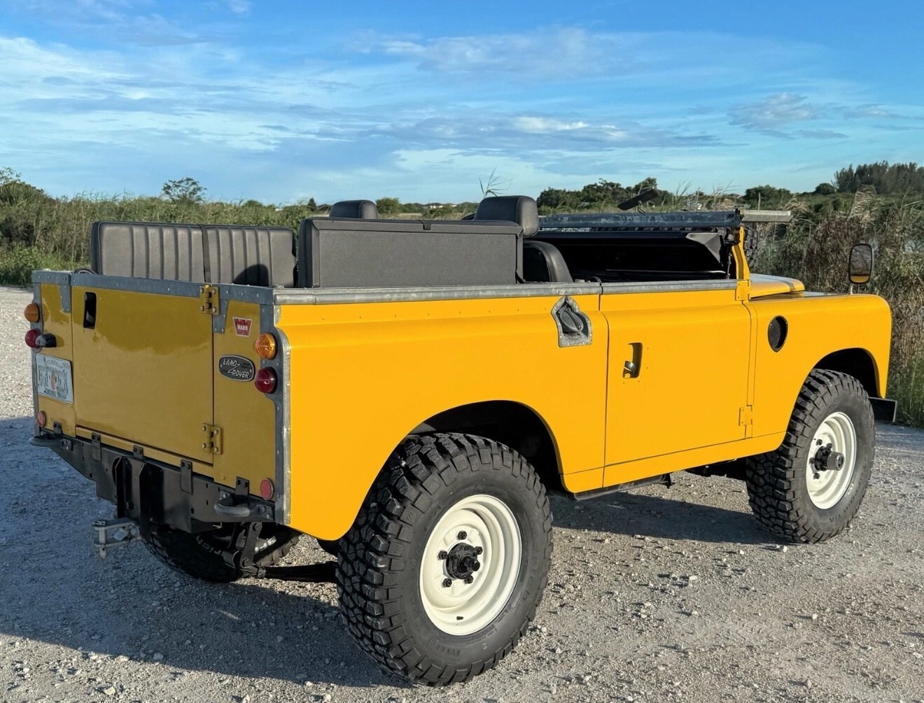 Stainless-steel exhaust system, electronic ignition, manually locking front hubs, removable tropical roof, swing away split tailgate assembly that allows easy acces for the rear passengers, removable door tops, two-speed transfer case, 8000 pounds Warn winch, folding windshield, NOS BF Goodrich KM2 tires with less than 300 miles, 16″ steel wheels, hood mounted spare tire, rear recovery hitch, lifting/towing rings, three-point front seat belts, fender-mounted side mirrors.