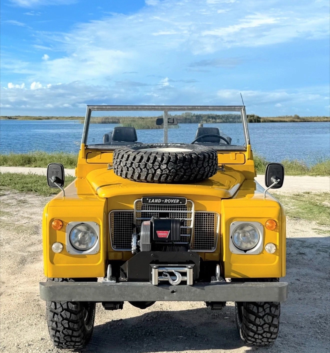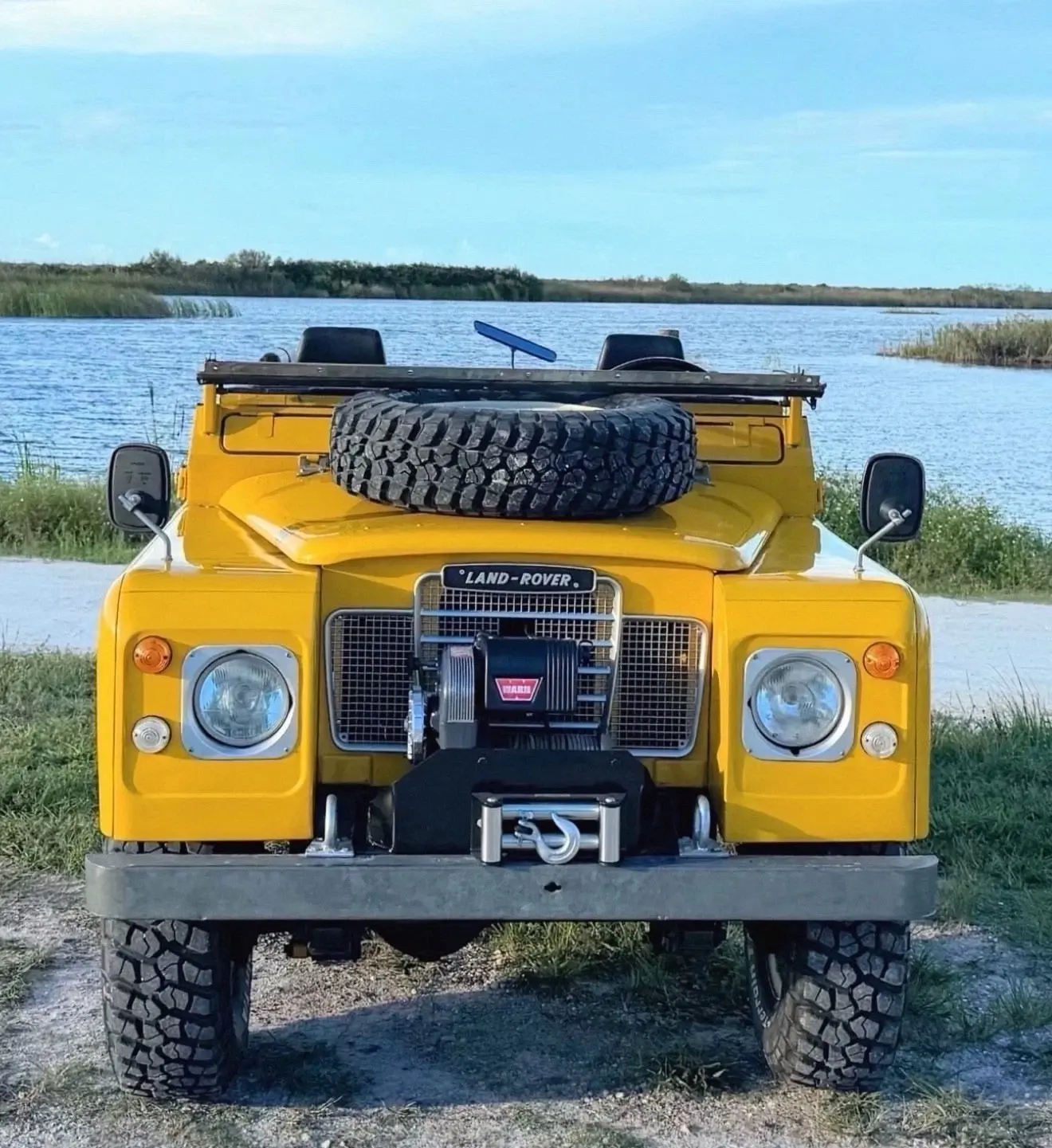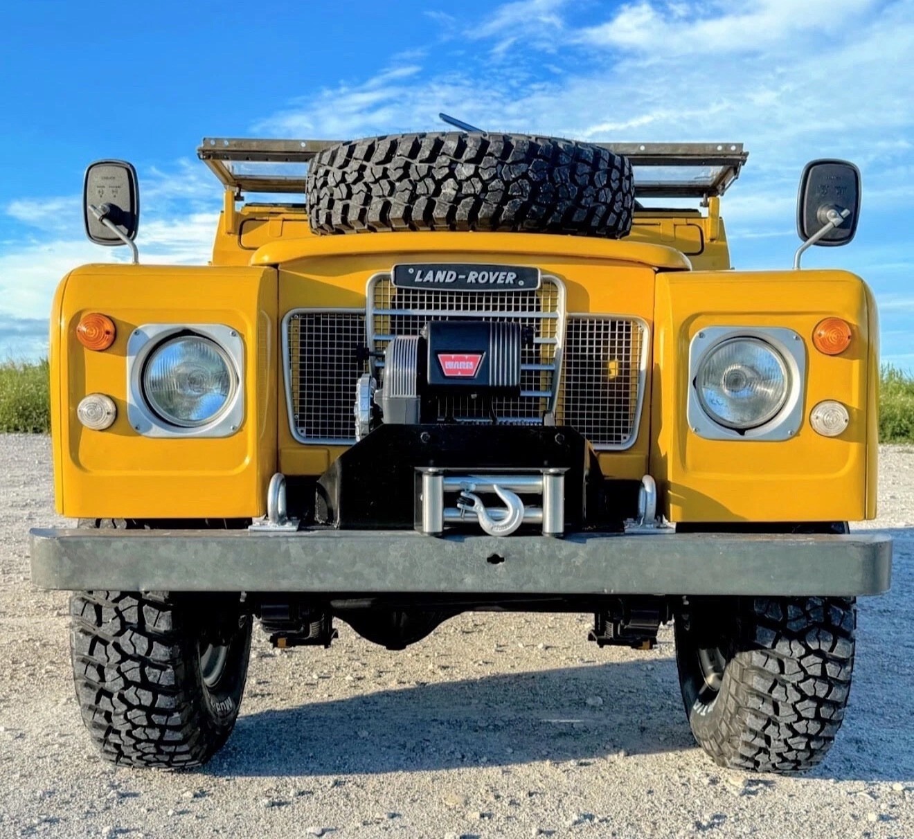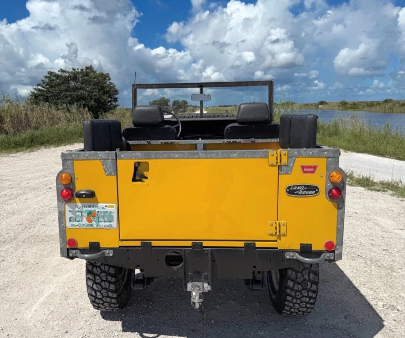 Stainless-steel exhaust system, electronic ignition, manually locking front hubs, removable tropical roof, swing away split tailgate assembly that allows easy acces for the rear passengers, removable door tops, two-speed transfer case, 8000 pounds Warn winch, folding windshield, NOS BF Goodrich KM2 tires with less than 300 miles, 16″ steel wheels, hood mounted spare tire, rear recovery hitch, lifting/towing rings, three-point front seat belts, fender-mounted side mirrors.