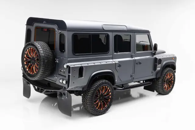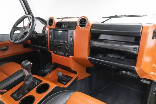 The exterior of this Defender is a striking blend of Corris Gray and Satin Black, accented with Firemist Copper highlights. The Kahn wide track body kit, stainless steel bolt kit, and custom perforated stainless steel side faux air venting add a bold and aggressive stance. The Kahn Model 1983 10 split-spoke powder-coated Satin Black alloy wheels, with GM Firemist Copper accents and Land Rover logo center caps, further enhance its commanding presence. The custom Kahn front fascia, perforated stainless steel insert, and upgraded LED exterior lighting, including heated front headlights with 3-position adjustable height, ensure that this Defender is as functional as it is stylish.