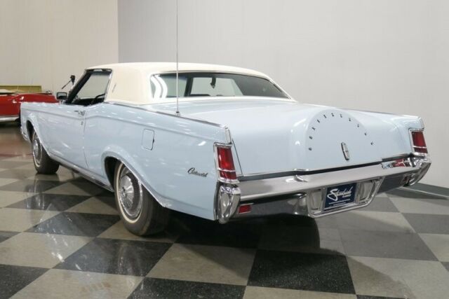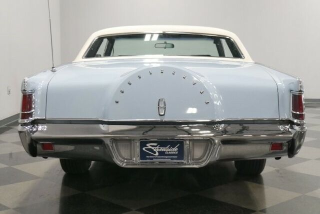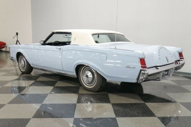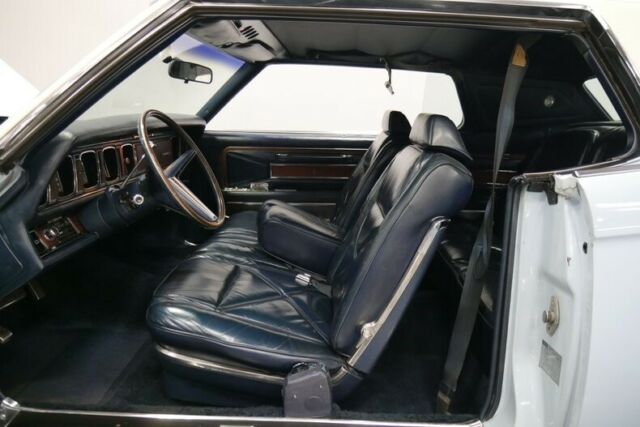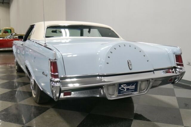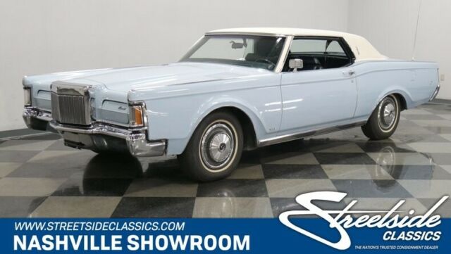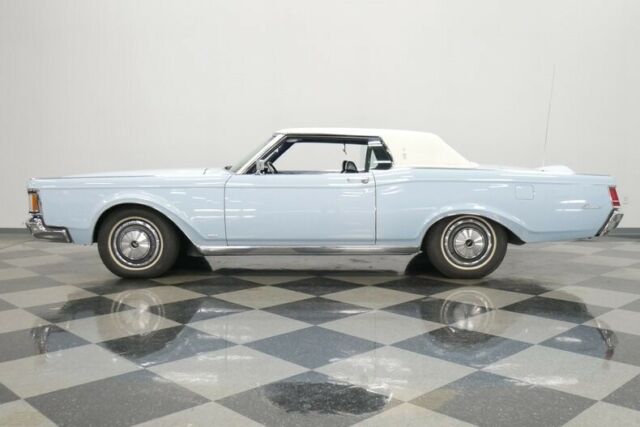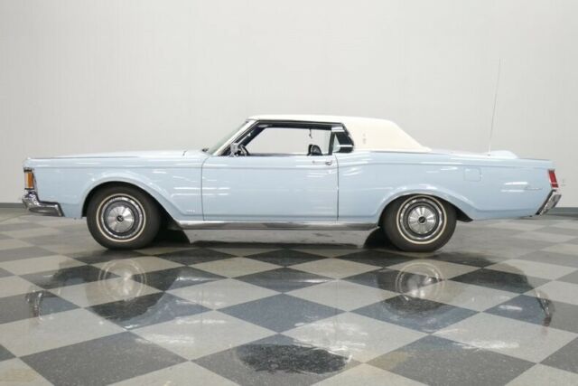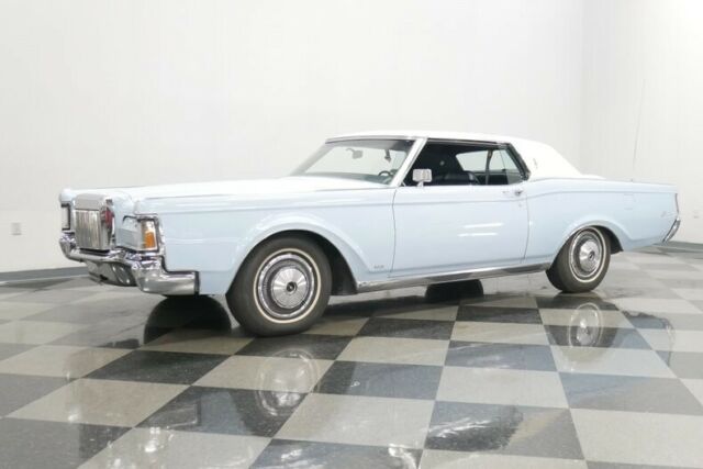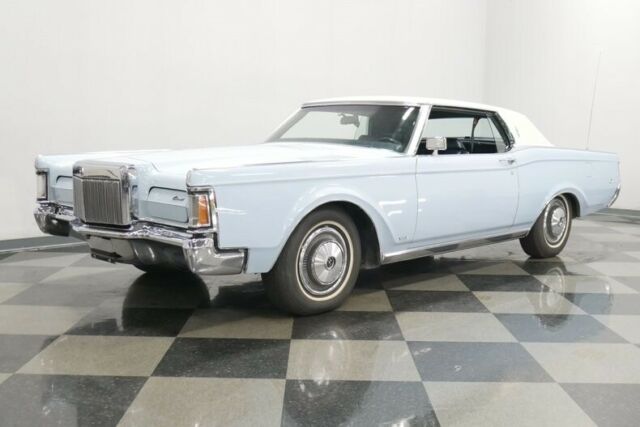 Hopefully someone will clue me in as to why the Lincoln Continental Mark III hasn't caught on with collectors. Big engine, leather-lined interior, classic proportions, and that American big car ride, what's not to love? This 1970 Lincoln Continental Mark III offers a great color combination and given all the power and style built into it, how can it still be so affordable? There's no mistaking a Continental from any angle: up front there's the gothic grille... and hidden headlights, from the side it has a roofline that almost looks chopped, and from the back, well, the "spare tire" has been a Continental trademark since Day One. And dressing it in light blue only makes all those things more effective. This is American land yachting at its finest. Original paint means no surprises underneath and it is indeed well-kept; aside from the usual signs of age it still looks expensive. The doors fit well, probably because they aren't quite as giant as they would get with the Mark IV and Mark V and ornamentation is kept to a minimum, quite unusual for a luxury car maker in the early 1970s. Classic styling elements like the vertical parking lights at the leading edges of the fenders and the stainless strips running along the tops of the fenders were Lincoln trademarks for years and remain in excellent condition here. The chrome that is on the car, including the heavy bumpers, shines up beautifully and the white vinyl top is in very good shape. Inside any Continental, you're treated to the finest that the era had to offer. In 1970, that was plush blue leather bench seats and room for six in a giant 2-door coupe. Familiar styling abounds here, too (nobody can accuse Lincoln of forgetting tradition), including squared-off gauges, tastefully applied wood appliques, and all the power amenities. The driver gets most of the interesting stuff, with the A/C controls to his left and the AM/8-track stereo to his right, and there are power windows and locks in the doors. The leather is original and in good condition with light signs of age and wear but nothing serious, and the black carpet keeps a sense of style inside, offering just the right contrast. Door panels are in good shape, the headliner doesn't sag, and if there's a perfect car for a road trip, this is it. The trunk is cavernous and will-lined, including a cover for the spare tire. Lincoln's 460 cubic inch V8 purrs smoothly and pulls the big coupe around with effortless ease thanks to big torque numbers. The engine bay is quite stock and very, very clean, dominated by the big A/C compressor that looks big enough for a 4-bedroom house, as well as the original factory air cleaner. A 4-barrel carburetor makes this luxury car feel smaller than it is and power steering and brakes are probably mandatory on something this size. A sturdy C6 3-speed automatic fees a 9-inch rear with 3.00 gears inside, making this car just about silent on the highway save for some light wind noise around the A-pillars, and the dual exhaust system gives it just the right sound, neither too loud nor totally silent. It's fairly original underneath, but obviously this car has lived someplace warm and dry its whole life, and with 235/75/15 whitewall radials it looks right. Great looks, great colors, great power, and a great price, this Continental Mark III just has to be the next big thing, right? Call today!