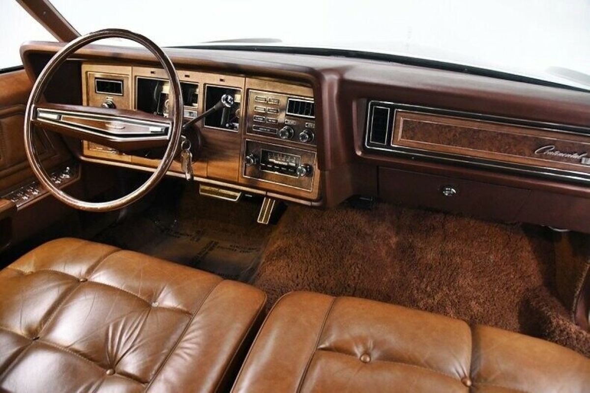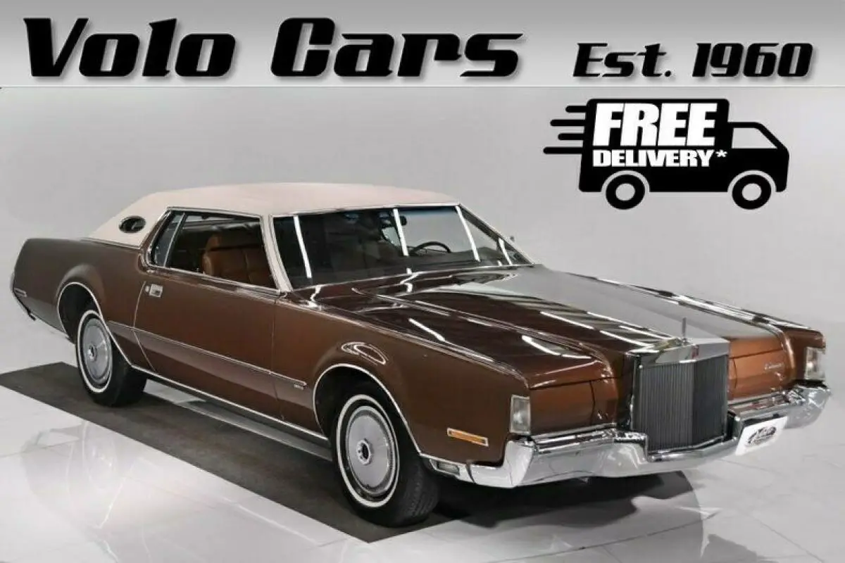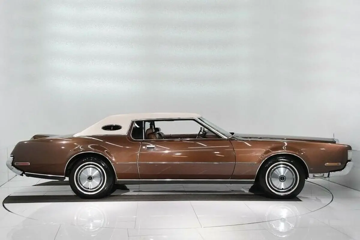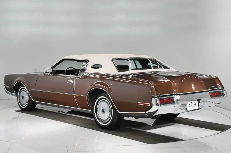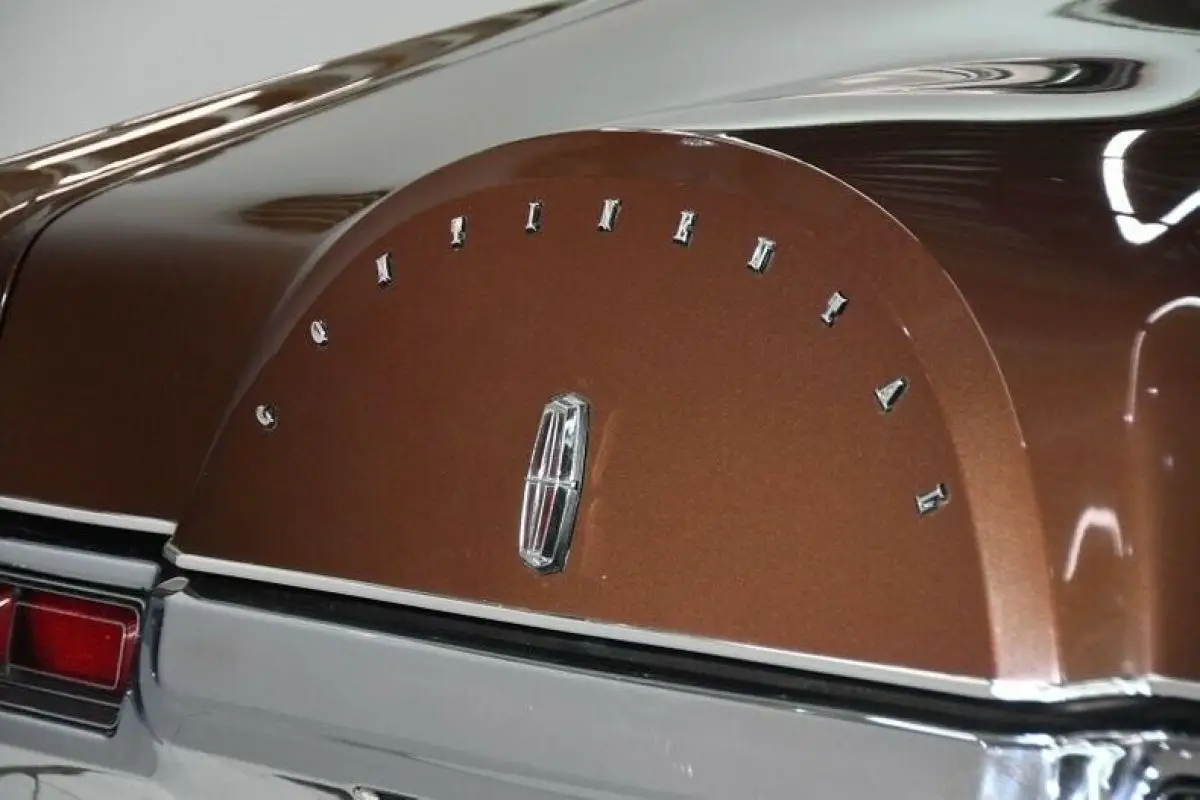 EXTERIOR: It shows really well. The body is clean and straight. Not dinged up, it fits right, no rust. Believed to be original paint- ginger moondust metallic. It looks great, has a very glossy finish. Has some minor rock chips. Still has painted on original pinstripe. Jambs still look clean, original trim sticker is still attached. The white vinyl top cleaned up like new. The chrome and stainless trim is bright and straight. Glass is crystal clear. Has the iconic opera window, big Rolls Royce style grill and continental tire on the trunk lid.