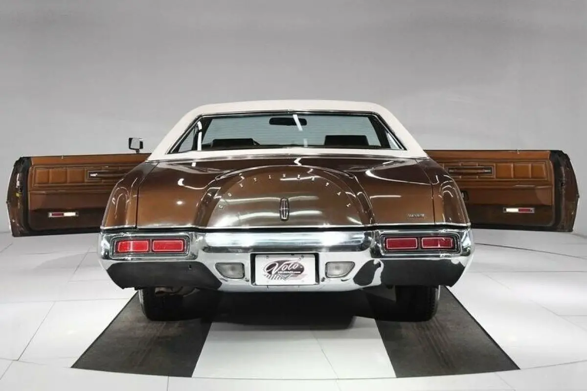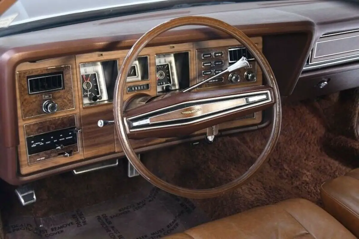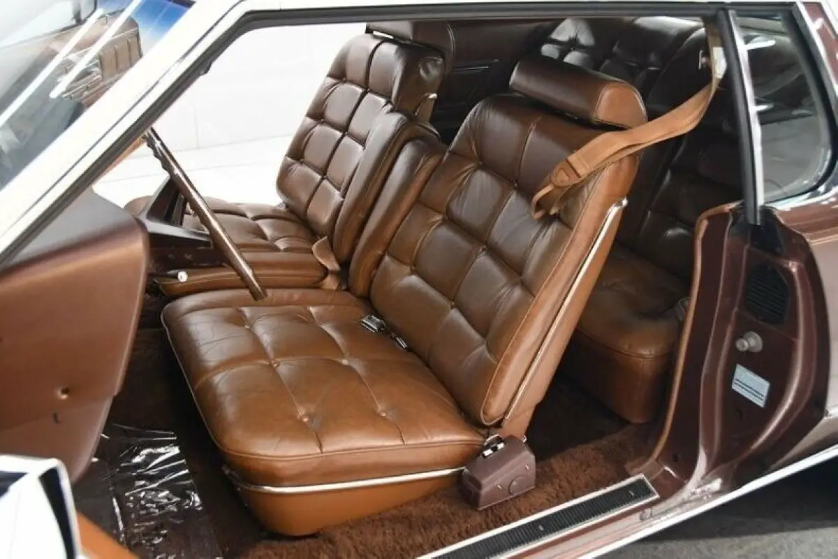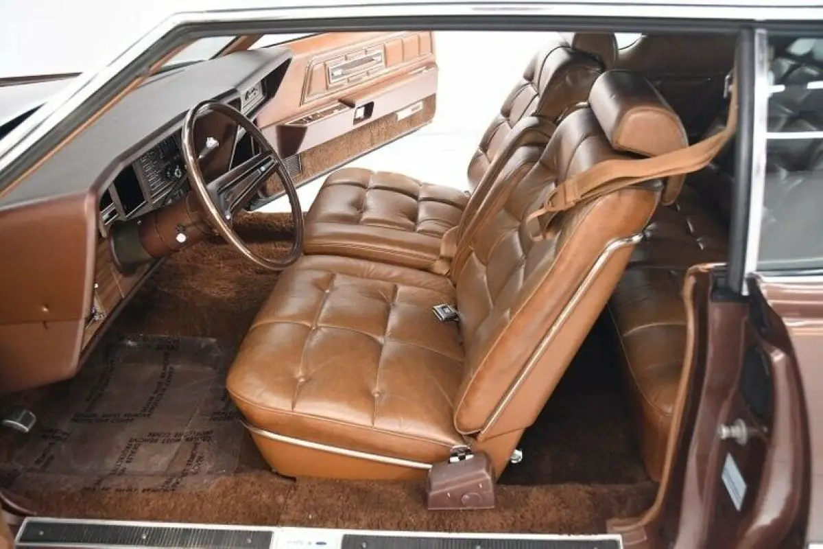 EXTERIOR: It shows really well. The body is clean and straight. Not dinged up, it fits right, no rust. Believed to be original paint- ginger moondust metallic. It looks great, has a very glossy finish. Has some minor rock chips. Still has painted on original pinstripe. Jambs still look clean, original trim sticker is still attached. The white vinyl top cleaned up like new. The chrome and stainless trim is bright and straight. Glass is crystal clear. Has the iconic opera window, big Rolls Royce style grill and continental tire on the trunk lid.