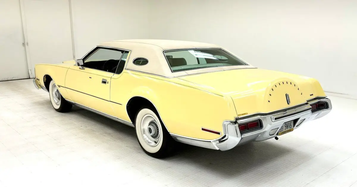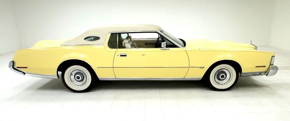 Approaching the car from the side, the astounding features include a long hood, with body creases to match the shape of the Rolls style grille, the low roofline, the amazing opera window, and the faux Continental kid bulge on the trunk lid. The single stage Yellow paint and wide white wall tires conjure up memories of Huggy Bear and Rooster from 70's detective shows, however neither of them drove a Lincoln! There is a sleekness to this car and when it says, "I've arrived" it means the hood got there an hour before the rest of the car. The hidden headlights add to the mystique and that front bumper does extend to absorb crashes, however the chrome here is in great shape and connects to a polished rocker panel trim that connects, visually, with the rear bumper, also in fine condition. At first, the tail lights seem like simple affairs, until you realize they are contoured with the bumper in which they are embedded, and curve around to join the outermost protrusions. An arrow headed double pinstripe runs parallel to the side body molding, both common features of the era. The white vinyl top shows some discoloration and bubbling under numerous areas. Other imperfections include scuffs on one of the wheel covers and another on a bumper.
