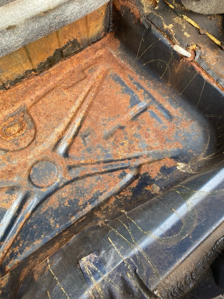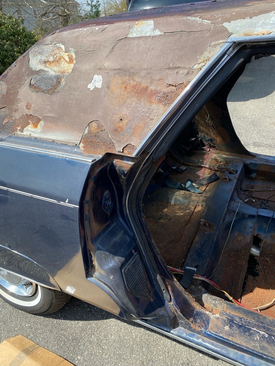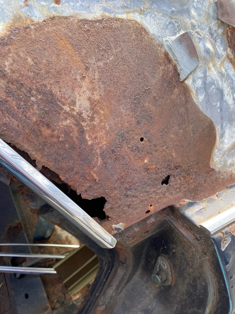The frame is solid but needs welding work in the rear floor pan and trunk pan (left front corner). The roof also has rust holes as well as rear doors and quarter panels.