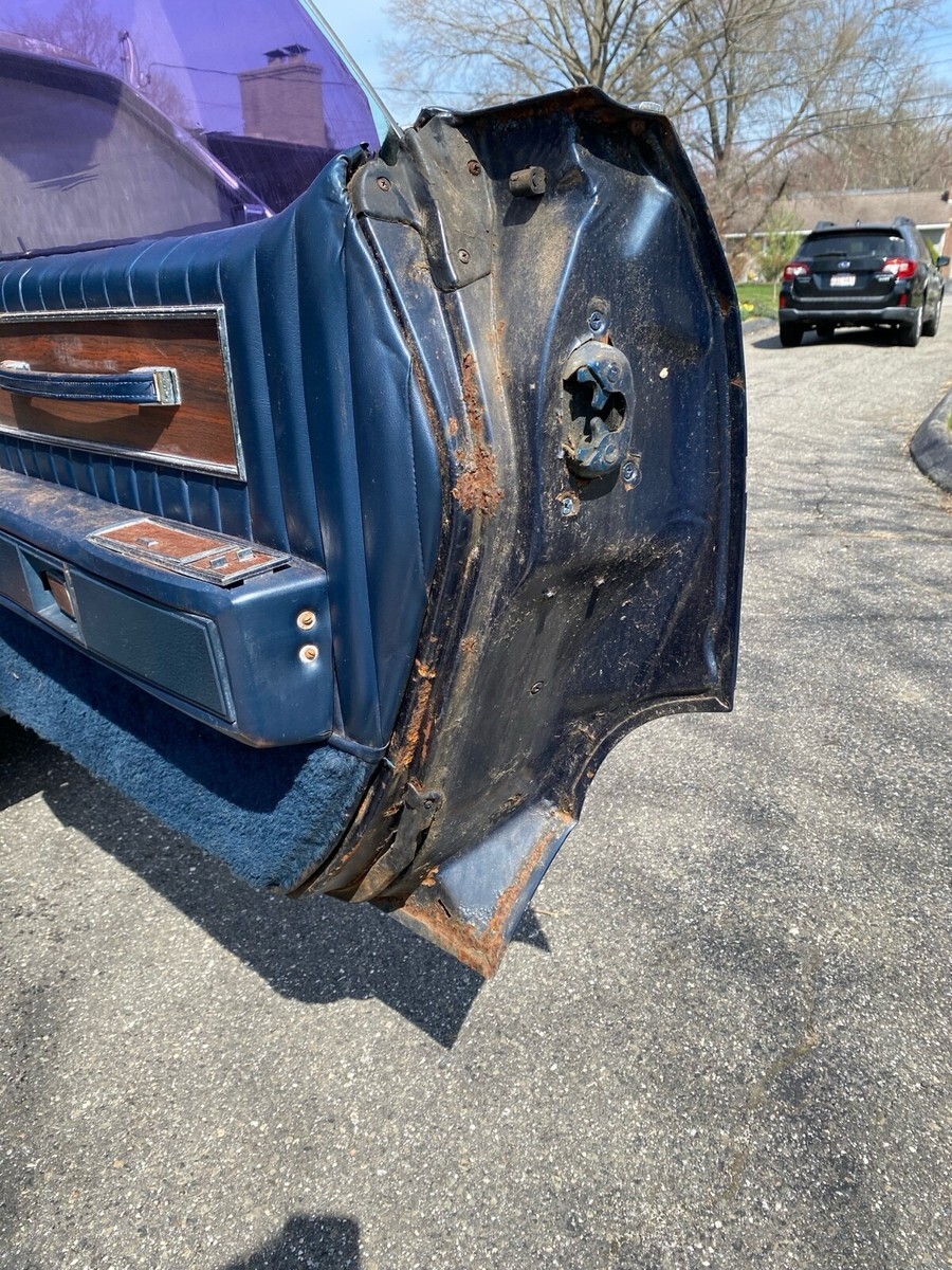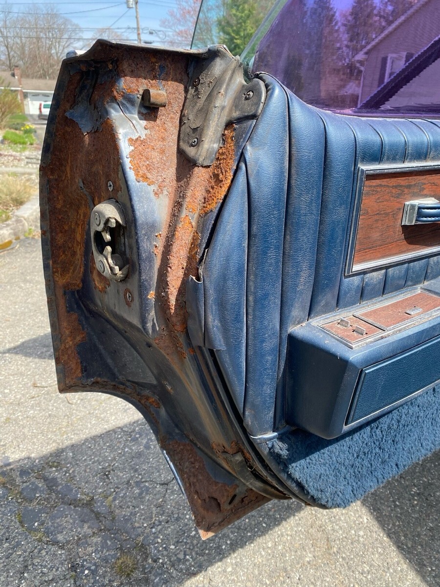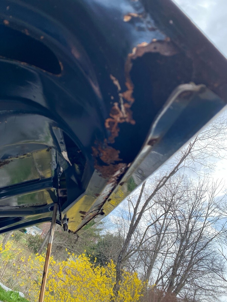The frame is solid but needs welding work in the rear floor pan and trunk pan (left front corner). The roof also has rust holes as well as rear doors and quarter panels.
