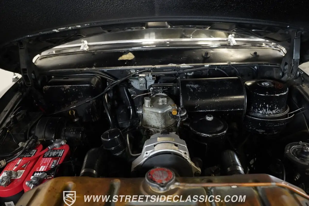 The green cloth interior offers ample space with bench seating that exemplifies the luxury standards of the early 1950s. Door panels match the seating surfaces while presenting thoughtful design elements throughout the cabin. The dash retains its factory configuration with clear instrumentation that gives vital information at a glance. Adding modern convenience to this classic package, an AM/FM/AUX stereo allows for connectivity without compromising the original aesthetic. The column-mounted shifter maintains the uncluttered floor space, maximizing comfort for all passengers.