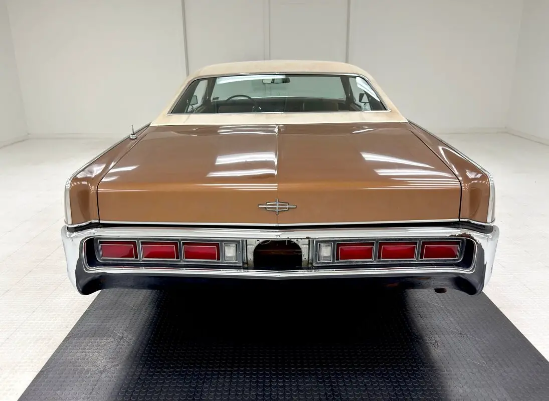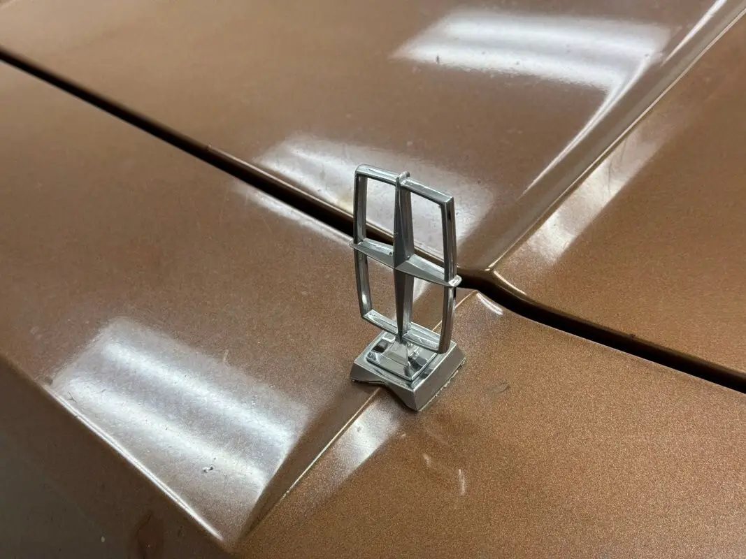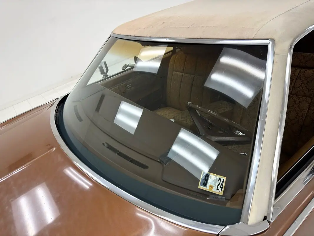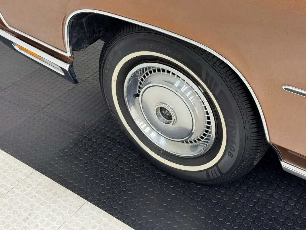t goes without saying, measure your garage, this relic of the swinging 70's is nineteen feet of slab sided goodness. Here in Light Ginger Moondust Poly, a name befitting the period still discovering tie dye and macrame. Right angles abound here with squared corners and vertical ends and a trunk lid so large, you might have to pay real estate taxes on it. Front grates on the grille are repeated as ornamental trim on the headlight covers and the massive hood contours with bends in the steel that funnel wind over the brick but don't worry, fender skirts are on board to smooth out the turbulence. In back, three part tail lights anchor the tail, embedded in a large chrome bumper. Wheel covers obscure the 15-inch steel wheels which carry 235/75R15 tires with an early 2023 date code. The single stage paint and metal are fantastic, while the white vinyl top has some discoloration, the only exterior imperfection we could find.