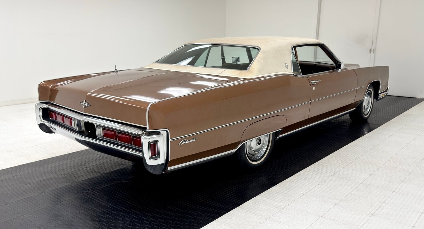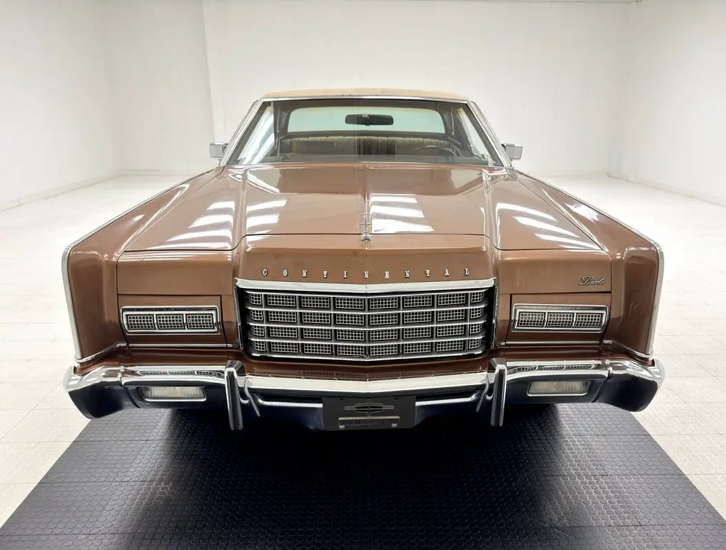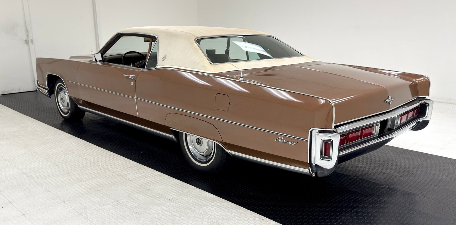 The handsome ginger doors include a brocade cloth insert under the door pulls and the long doors include electric switches in a woodgrain faceplate and carpeted kick panels. We note some of the armrest trim on the passenger side is loose but the doors otherwise present cleanly. Brocade cloth washes over the split bench in front, a dramatically luxurious floral pattern you're more likely to see in a living room, here with vinyl sides and piping, and a large, fold down armrest. The rear bench is dressed in the same, includes an armrest of its own, and barely looks used. Both front and back are in great shape. Browns dominated the front beginning with the steering wheel, showing some cracks and patina adorned with cruise control buttons and a woodgrain insert. The horizontal speedometer tops inset gauges in square bezels, a holdover from earlier Lincolns but on a smaller scale. An AM/FM radio with Realistic 8-track player is in the middle of the dash, under a brown pad that has a taped crack on top. Plush brown carpet covers the open floor with plenty of legroom for all occupants and the endless trunk is nicely finished with gray cloth panels.