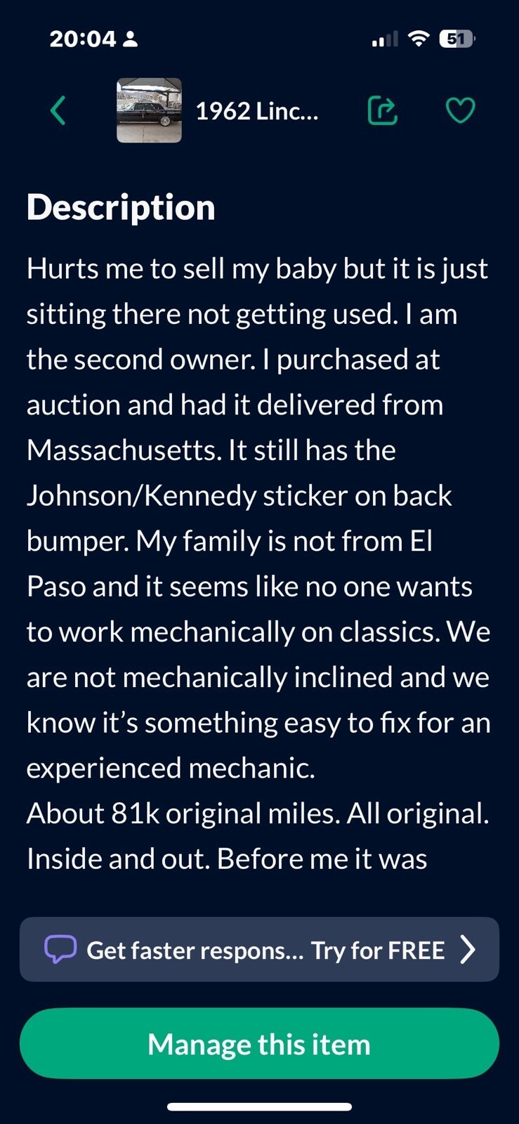 I am the second owner. I purchased from the original owner who lived in Massachusetts and kept it in his garage. Please look at all pictures. Will need to pick up or arrange shipping. Will need a trailer. Please ask if you have questions. Hard to find these and even better in this condition.