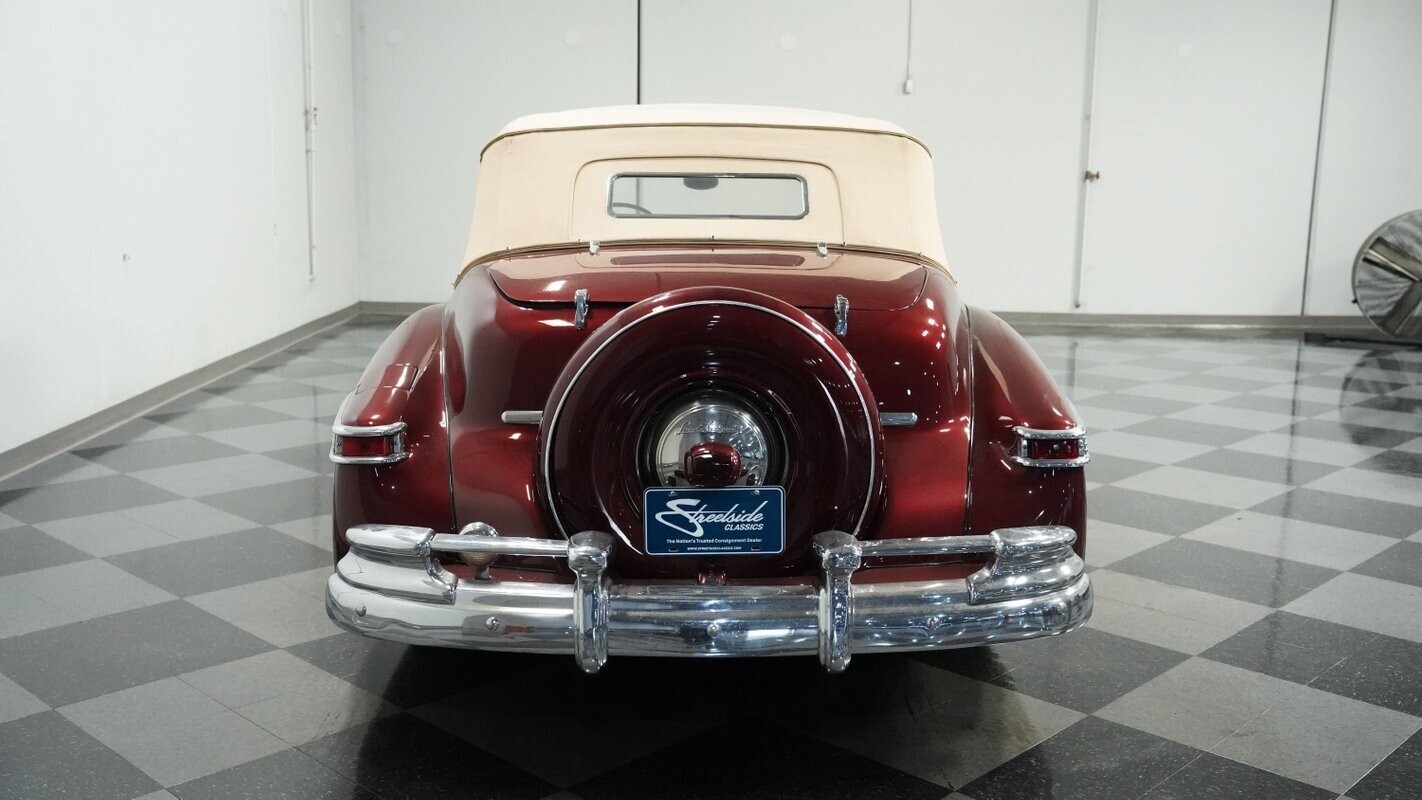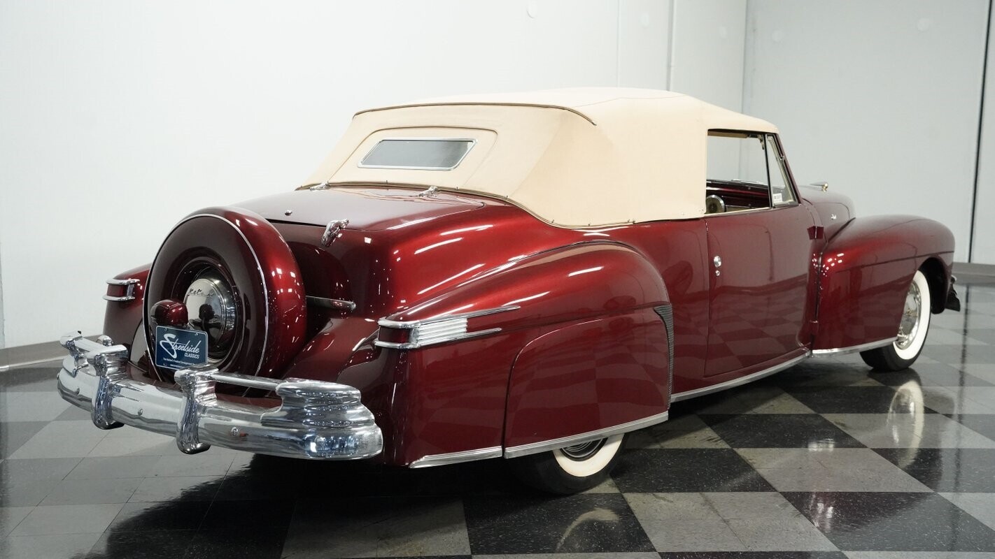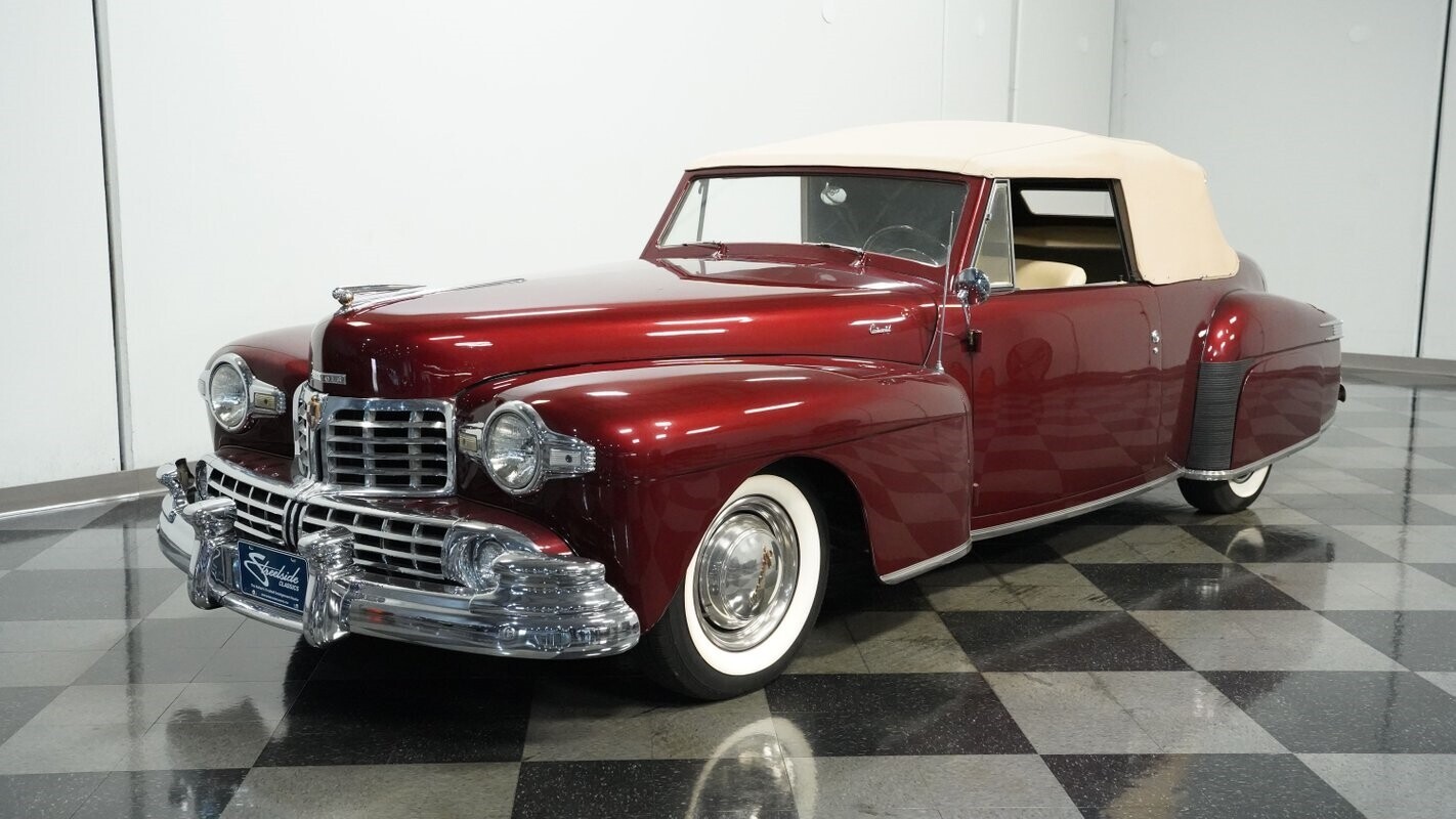 With production limited to just 738 units in 1947, this Lincoln Continental Convertible exists as one of the rarest post-war luxury cars ever made. This Continental features Burgundy Metallic paint that accentuates its long, flowing body lines and elegant proportions. The cashmere canvas convertible top provides excellent contrast against the rich burgundy, while the polished chrome trim and bumpers highlight the Continental's luxury status. Its 15" wheels fitted with 215/75R15 wide whitewall tires complete the period-correct appearance, enhancing the authentic stance that made the Continental the ultimate expression of American automotive luxury in the 1940s.