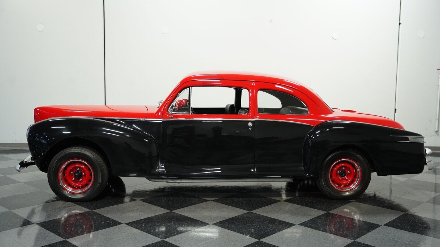 This 1940 Lincoln Zephyr Restomod showcases an intriguing blend of old and new, featuring doors from a '46 Lincoln and a custom butterfly grille that adds unique flair. The sleek black paint contrasts perfectly with red accents, while the chrome trim and bezels amplify its street presence. Rolling on 15-inch wheels wrapped in 215/70R15 rubber, this Zephyr's modified stance creates an aggressive look, topped off with polished side pipes that exit dramatically along the bodywork.