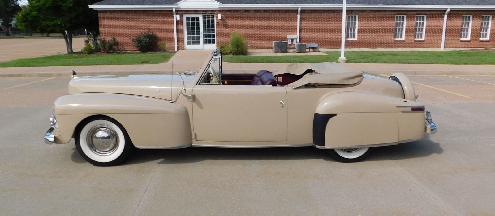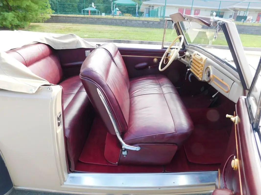 The automobile offered here is one of only a few 1942 Lincoln Continental Cabriolets that are thought to survive. The subject of an older ground up restoration, the car presents beautifully today. Finished in Victoria Coach Maroon paint, with a tan leather interior and tan top, the condition of the leather is very good showing only very slight signs of use on the driver's side. The paint quality is very good, with nice panel fit and finish. The fully restored dashboard is pure 1940s glamour, trimmed in proper gold accents that gleam in elegant compliment to both the exterior and the interior. Being a very prestigious car in its day, it is well-equipped with a radio, heater, power windows, power operated convertible top, clock, and full instrumentation. The wheels are finished with correct chrome hubcaps and trim rings that are in very good condition and the polished chrome trim on the exterior is also in very good condition