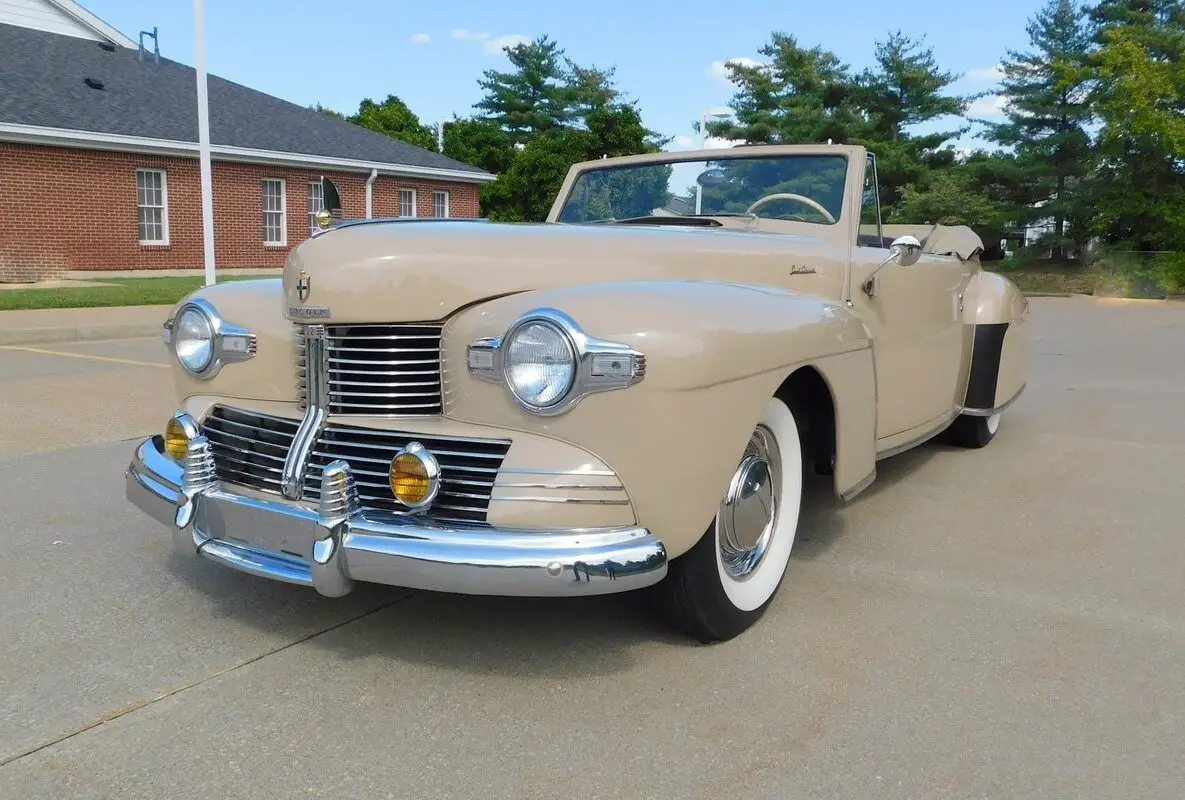 Restored to magnificent condition, this majestic 1942 Lincoln Continental Convertible is one of only 136 produced in that shortened production year and is believed to be one of just 27 left in existence. It was refreshed in the correct Cheswyn Beige and features a burgundy leather-upholstered interior with the gold interior bright trim and accents seen only in 1942 models. The two-spoke steering wheel, Bakelite switchgear and other non-metal trim are colored to match the gold interior plating, drawing a visual link to the hydraulically-controlled tan soft top and matching top boot.