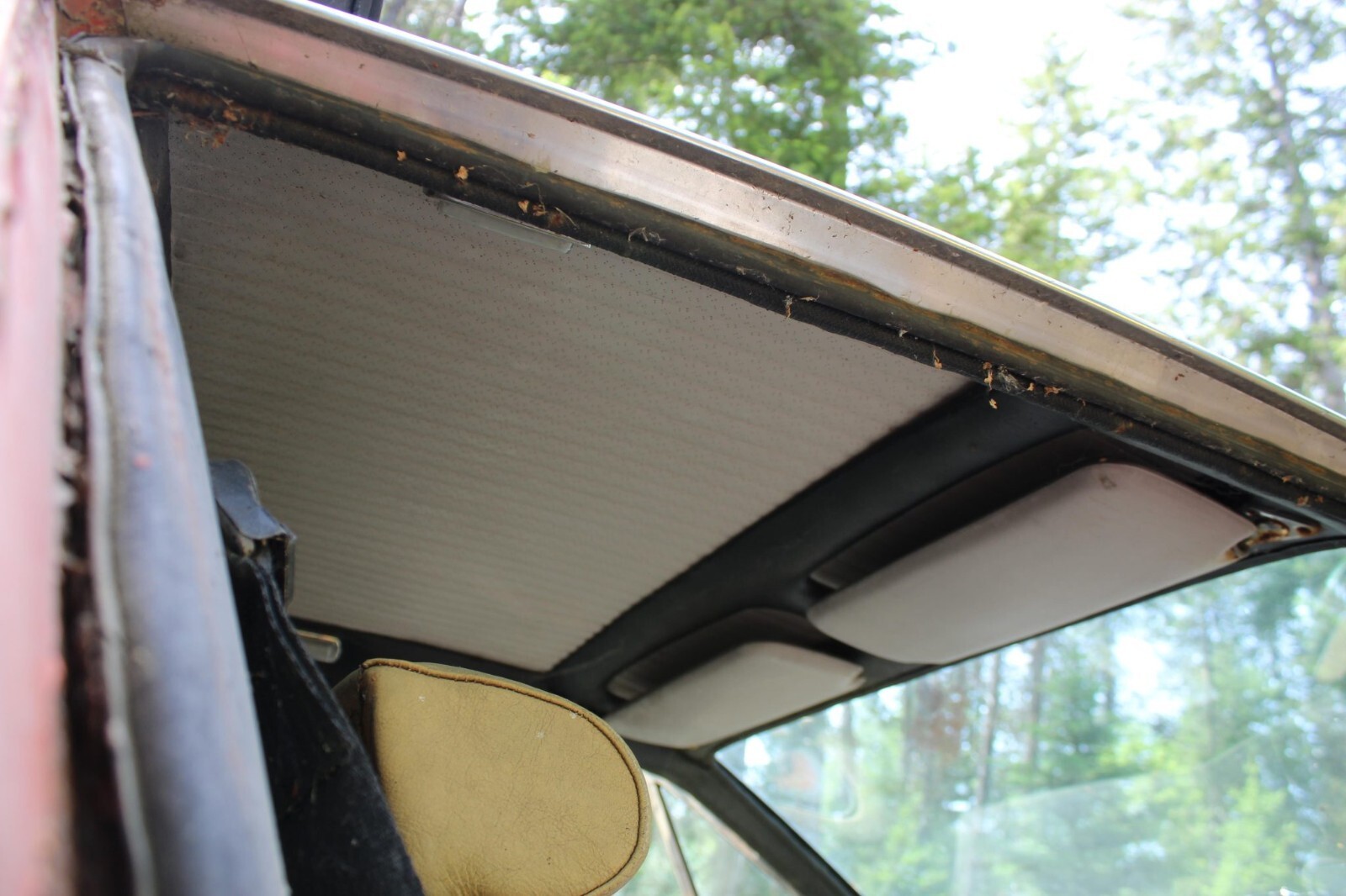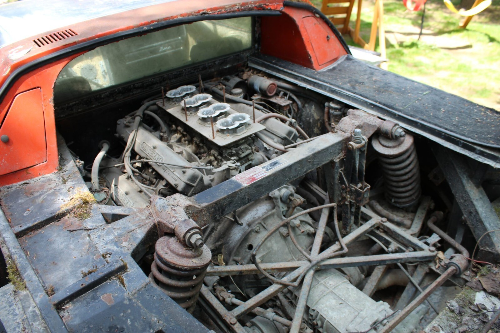 This example was delivered from the factory in Celeste Chiaro and was repainted orange under previous ownership. Equipment includes a non-vented lower valance, a rectangular hood vent panel, rounded headlight bucket corners, and a stainless-steel roof and A-pillars. There are dents on the nose, and rust is present throughout. The front bumper and taillights are missing, and the hood does not open.