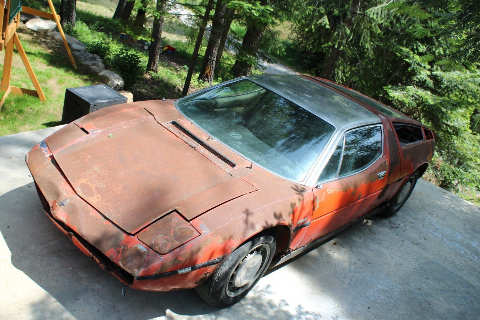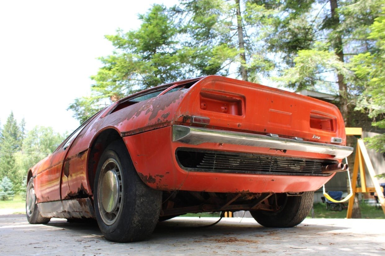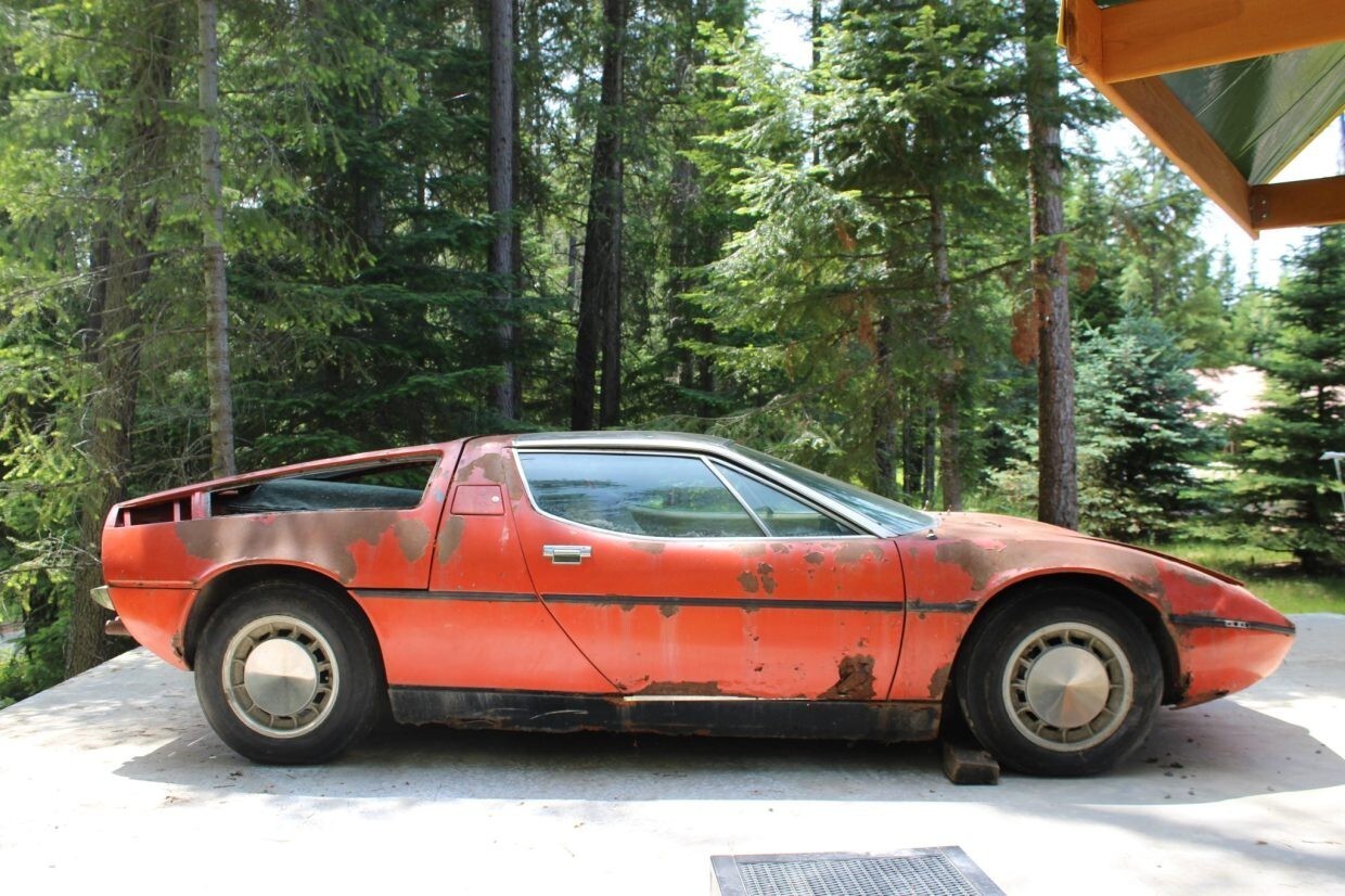 This 1972 Maserati Bora is reportedly #100 of 564 examples produced over a seven-year production run, and it left the factory finished in Celeste Chiaro over Senape upholstery. Chassis 204 was reportedly sold new in Rome, Italy, and underwent a color change to orange as well as an engine replacement at some point under previous ownership. After being brought to the US, it was moved to Alaska and spent a claimed four decades parked in a field before it was purchased by my father in law in 2025 and relocated to Montana. The car retains a 4.7-liter DOHC V8 fitted with four Weber carburetors and mated to a five-speed manual transaxle. Further equipment includes 15” Campagnolo alloy wheels, Veglia Borletti instrumentation, and a Blaupunkt cassette stereo. It is unknown when the car last ran, and rust is present throughout. This non-running Bora project is now offered at no reserve