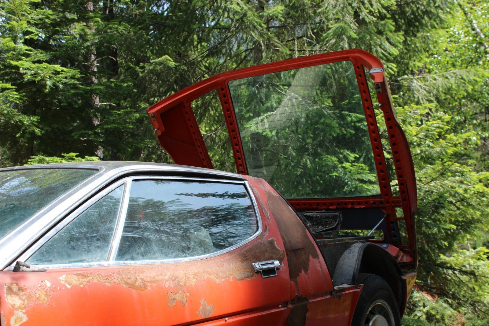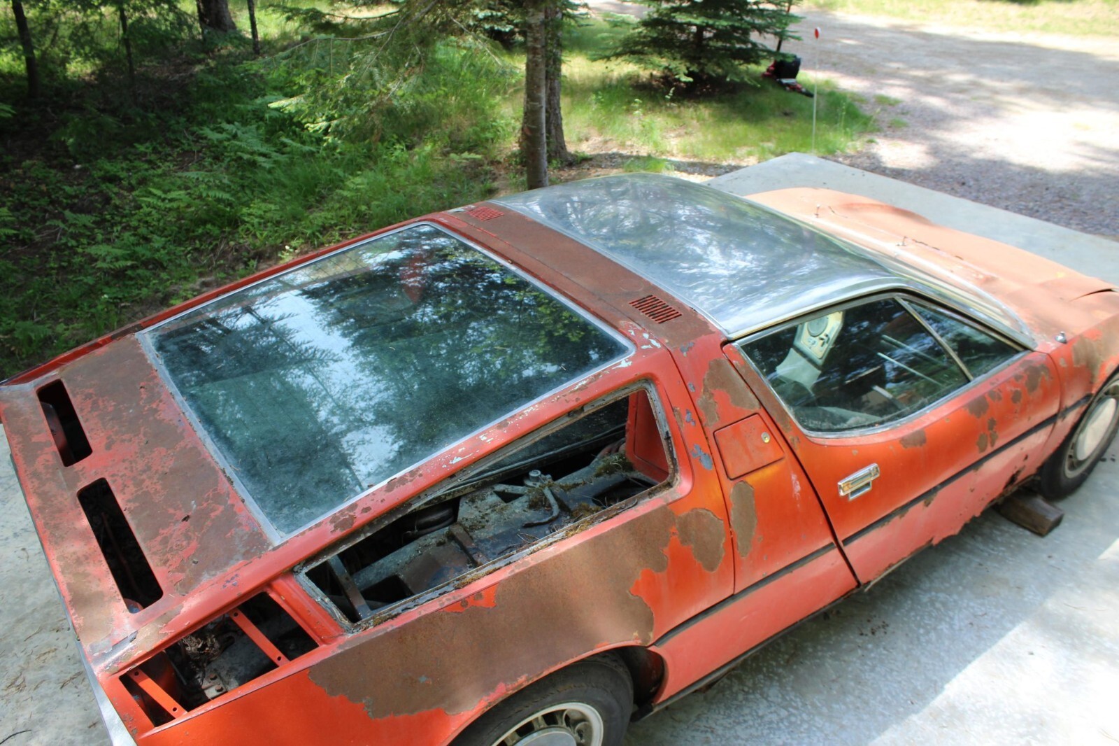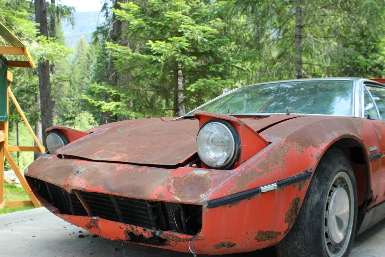 This 1972 Maserati Bora is reportedly #100 of 564 examples produced over a seven-year production run, and it left the factory finished in Celeste Chiaro over Senape upholstery. Chassis 204 was reportedly sold new in Rome, Italy, and underwent a color change to orange as well as an engine replacement at some point under previous ownership. After being brought to the US, it was moved to Alaska and spent a claimed four decades parked in a field before it was purchased by my father in law in 2025 and relocated to Montana. The car retains a 4.7-liter DOHC V8 fitted with four Weber carburetors and mated to a five-speed manual transaxle. Further equipment includes 15” Campagnolo alloy wheels, Veglia Borletti instrumentation, and a Blaupunkt cassette stereo. It is unknown when the car last ran, and rust is present throughout. This non-running Bora project is now offered at no reserve