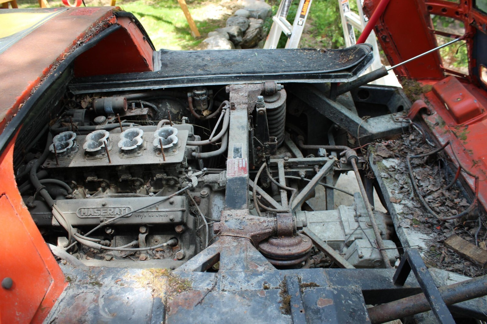 The 4.7-liter DOHC V8 is a replacement unit that was reportedly installed in the 1970s. It retains four Weber carburetors as well as Maserati-branded valve covers and is mated to a ZF five-speed manual transaxle. The driver-side carpeted engine trim is missing.