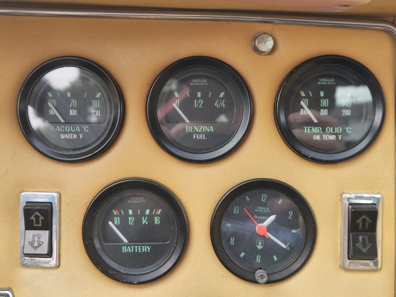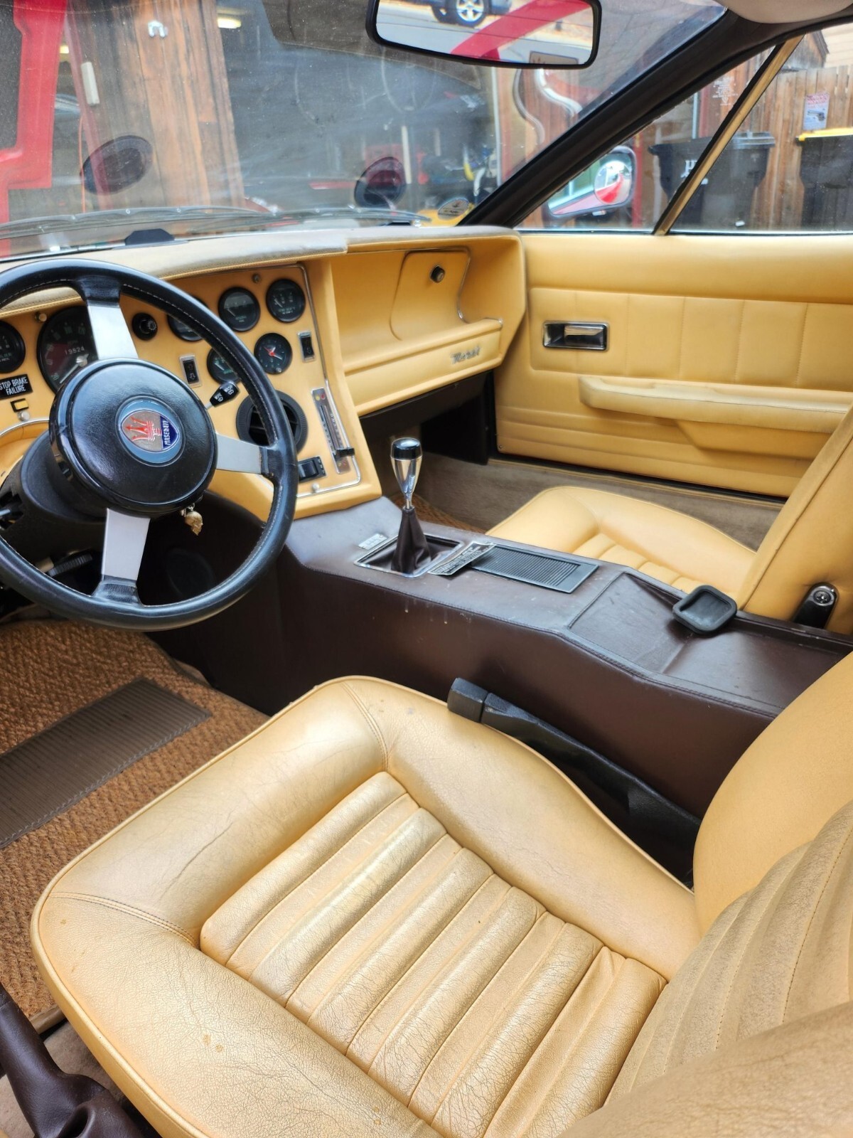 The beige Connolly leather shows signs of wear, and the seller recommends upholstery repairs. The 2+2 cabin is equipped with a Bora-style dashboard, a lockable glovebox, power windows, fiber floor mats, an aftermarket radio, and air conditioning.The three-spoke steering wheel frames Veglia Borletti instrumentation including a 200-mph speedometer, an 8k-rpm tachometer, and auxiliary gauges. The five-digit odometer shows 20k miles, approximately 12k of which were added under current ownership.