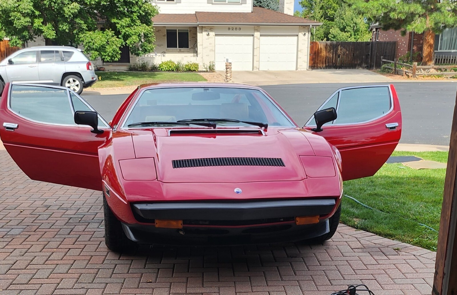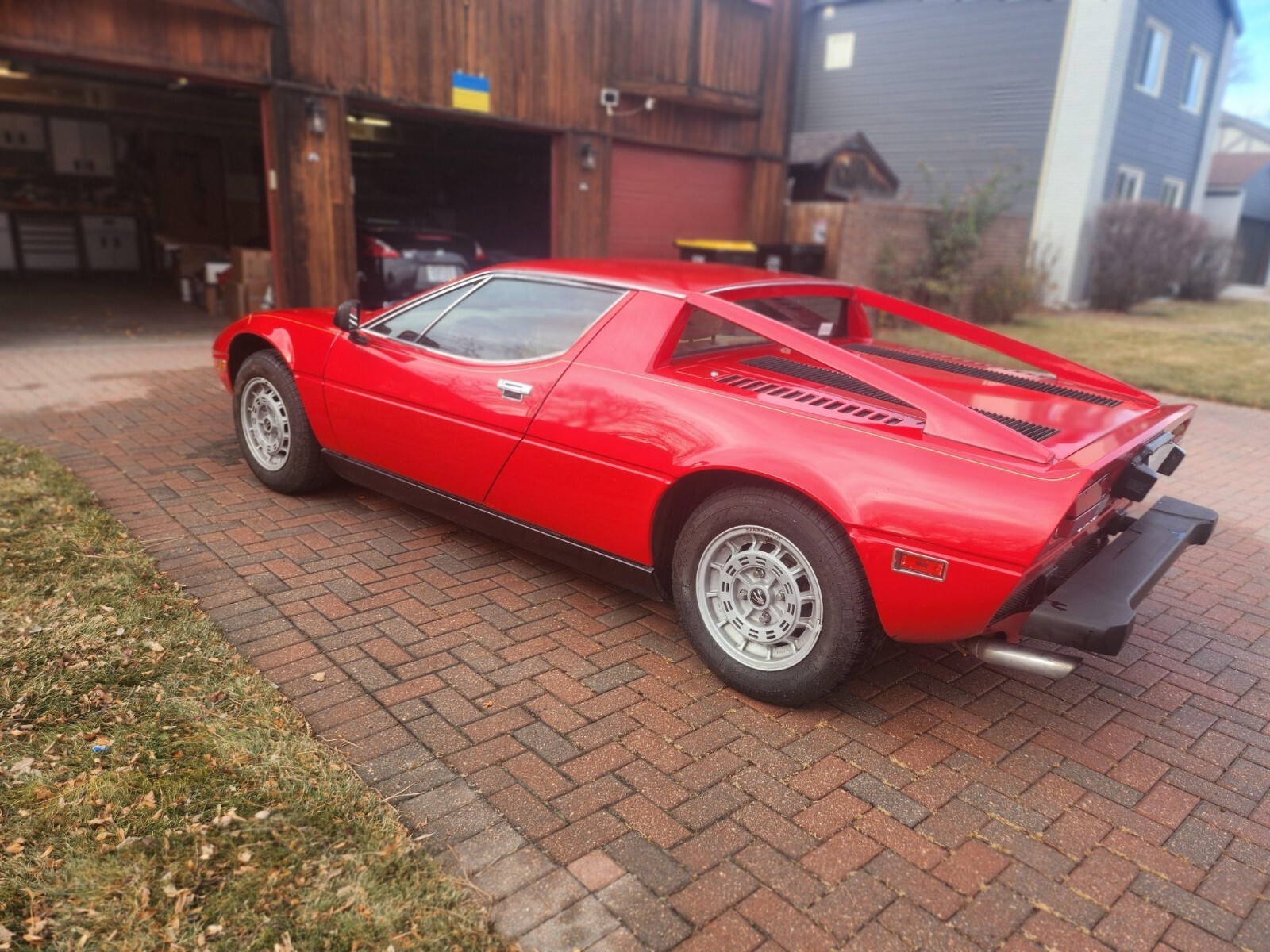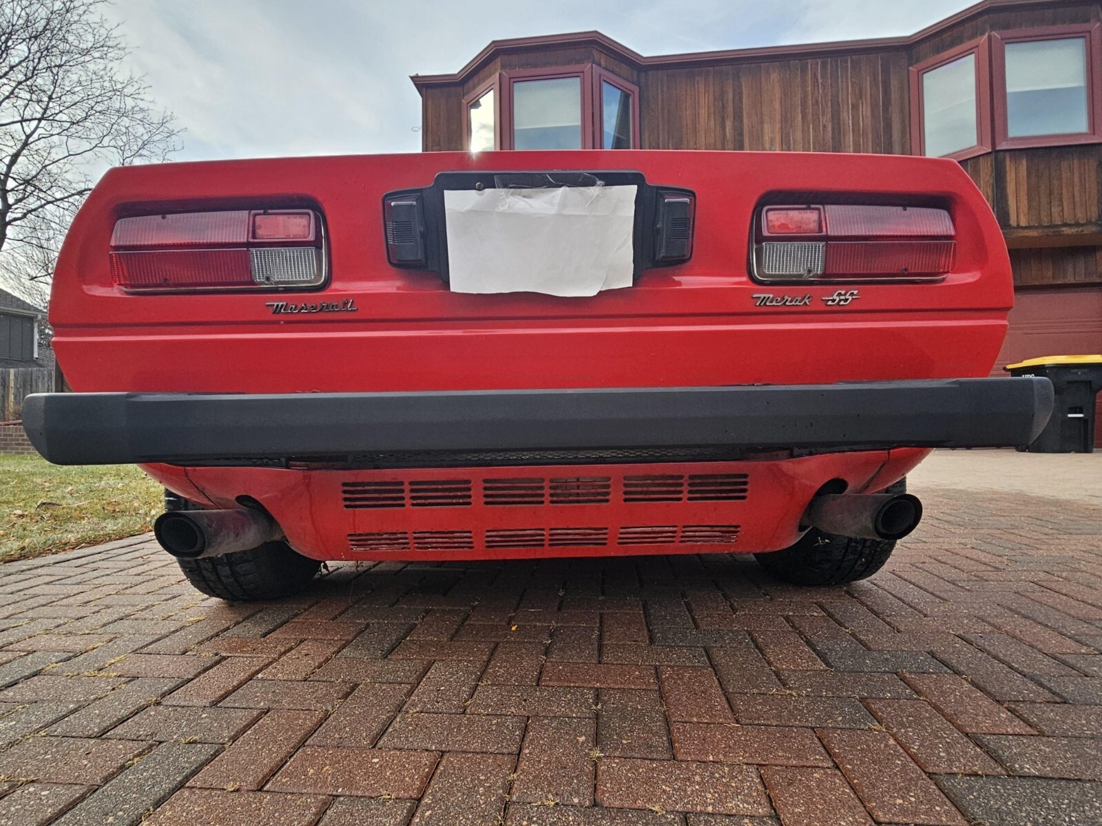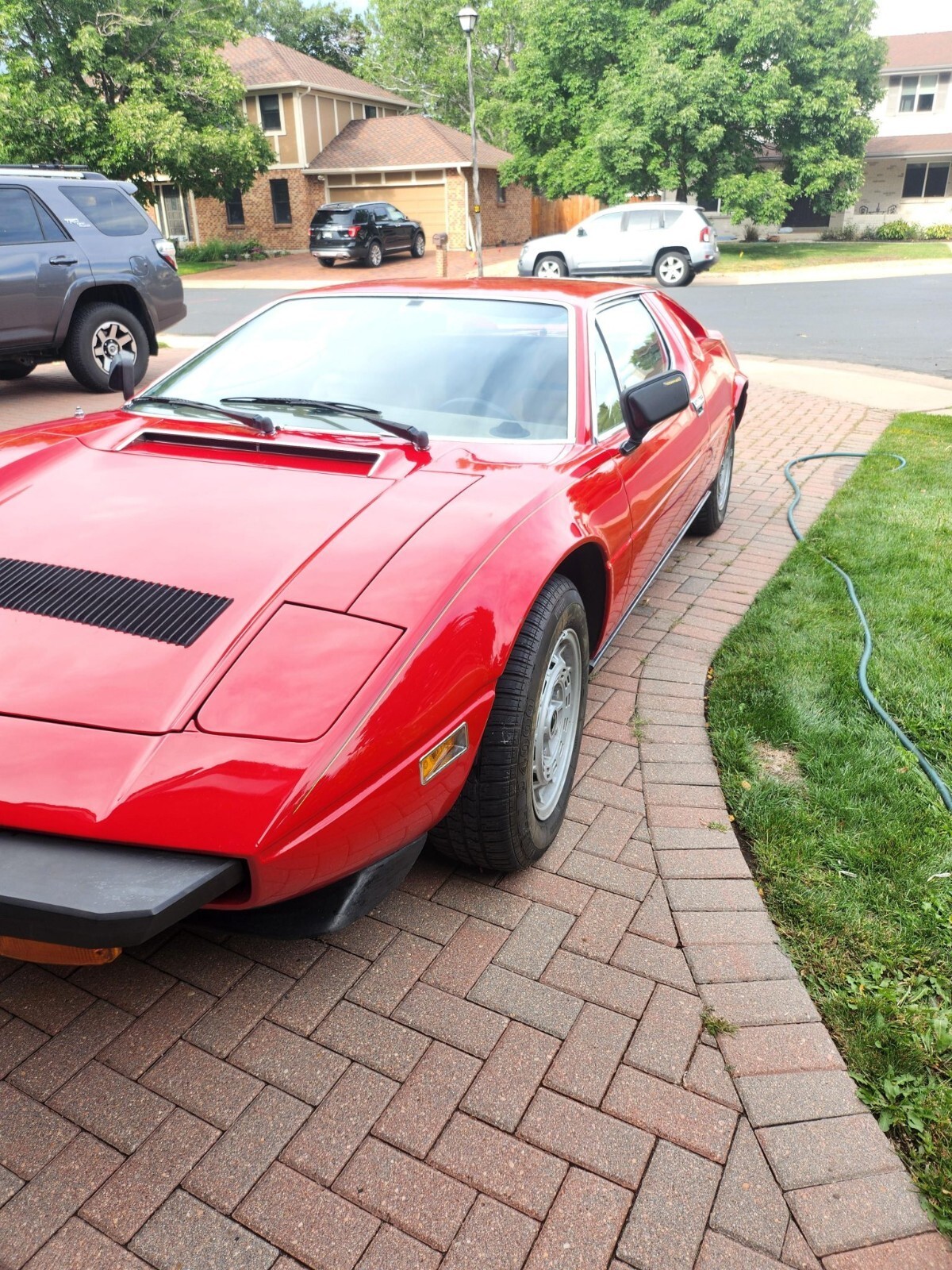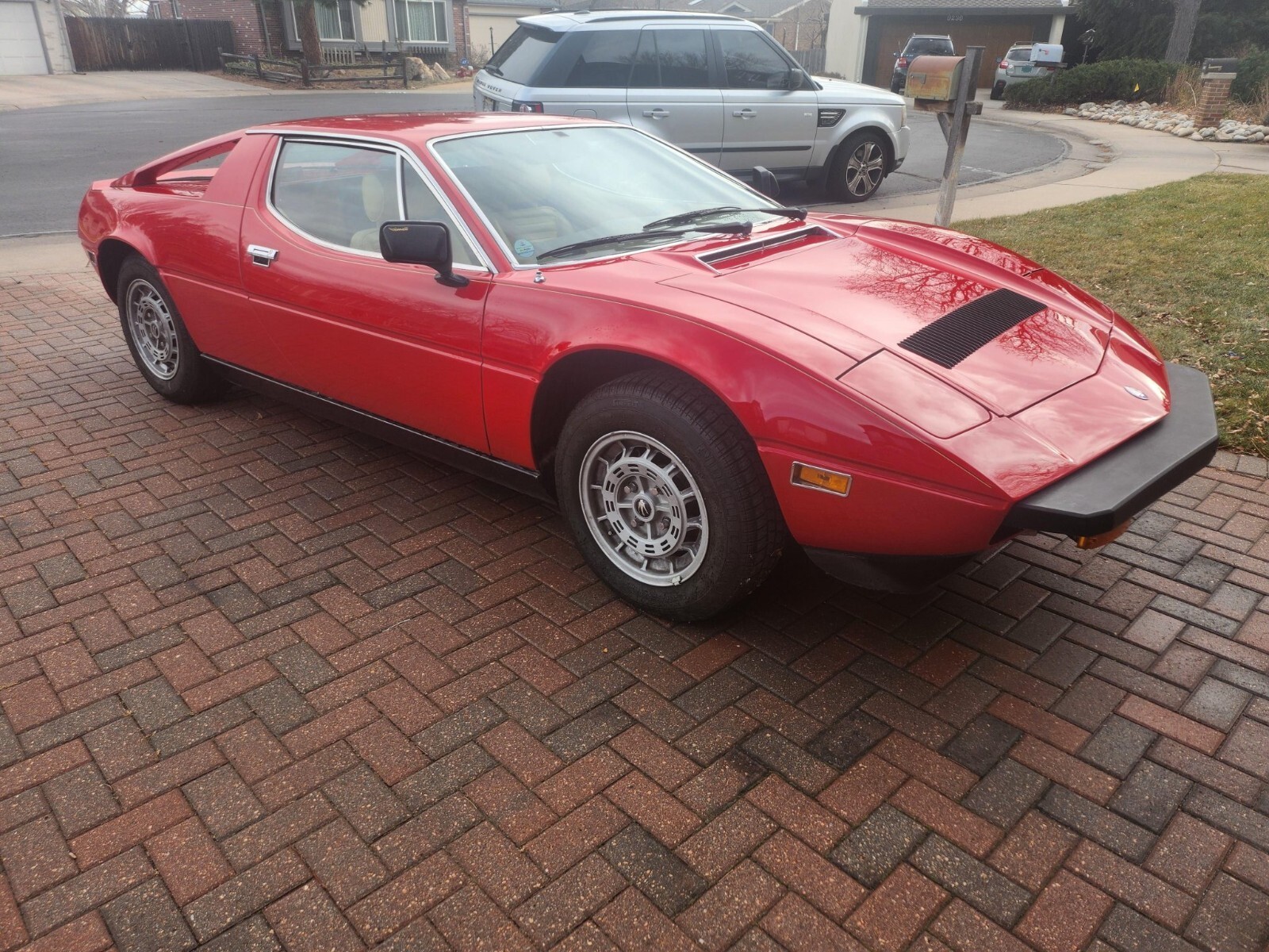 Styled by Giorgetto Giugiaro at Italdesign, the Merak was first revealed at the 1972 Paris Motor Show as a lower-cost alternative to the contemporary Bora, with which it shared its styling from the doors forward but featured a vertical rear window and a louvered horizontal engine cover flanked by flying buttresses. An updated Merak SS model followed in 1975, which featured a revised front hood with a black grille. This example is finished in red, and the hood and right-side fender were refinished following dent repair.