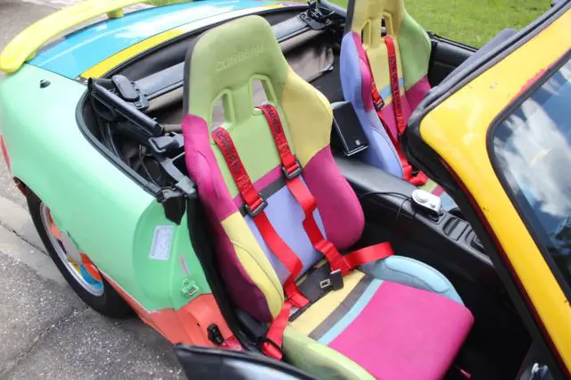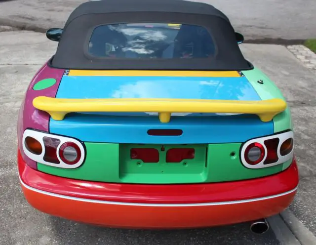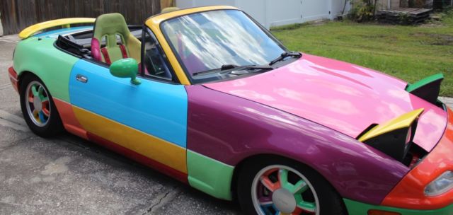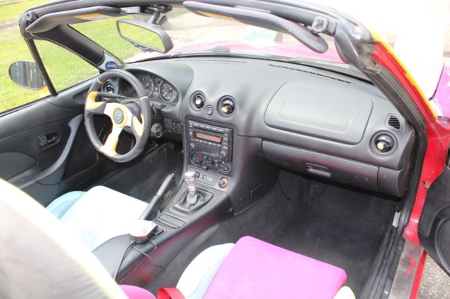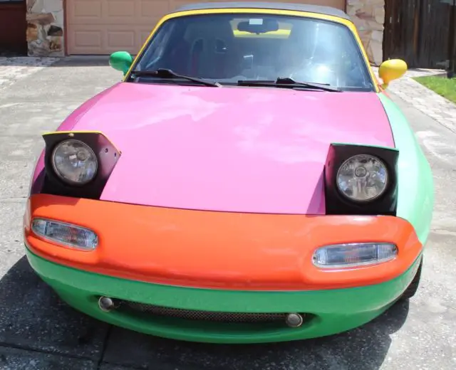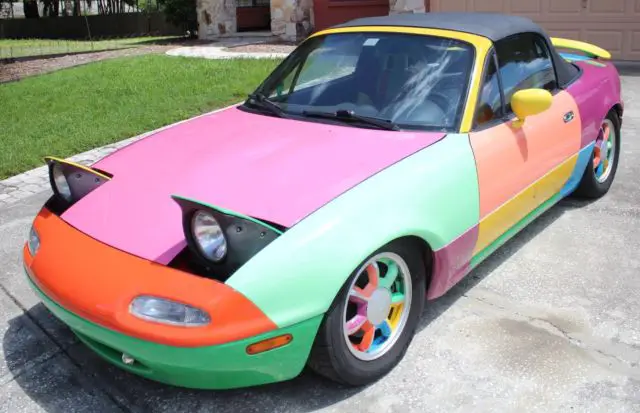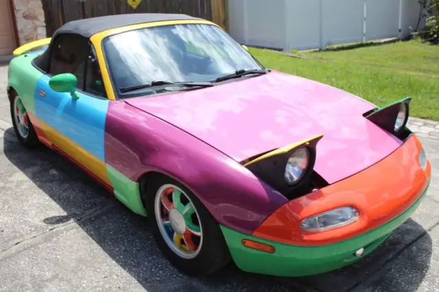 I started this car as a project a few years ago and have enjoyed every moment of it. It is one of a kind Miata that is definitely a "neck breaker." People love it whenever I take it out for a spin! I painted it different colors to separate me from all the other boring cars out on the road. This car would be great to attract attention outside of a business, to use at special events, or to just race around town with! It's a 1993 exterior with a 2001 interior along with racing seats.It has a modified turbo engine, special stainless still Racing Beat exhaust,also low ajustable suspension and halogen headlights/taillights.The radio need to be hoocked up. If you're looking to add a little "color" in your life...this might be the car for you. If not, continue living your dull, boring, just existing life....I've been dealing with Miata's as well as parts for over 20 years. To those who purchase a miata off of me, I will discount any parts in my inventory 50% off as long as I have it in stock.