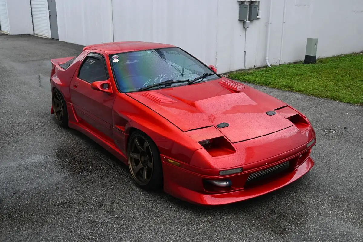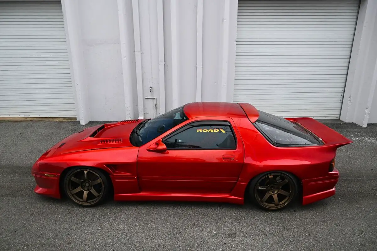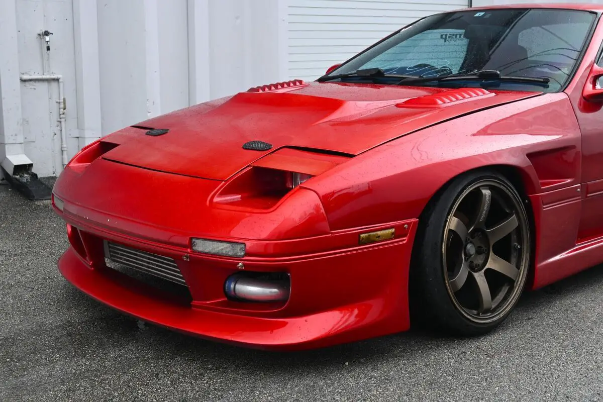 Complementing the aggressive look, the car features full polycarbonate rear glass, significantly reducing weight and contributing to improved performance. A rear window spoiler finishes off the sleek profile, ensuring this RX-7 stands out both on the street and the track.