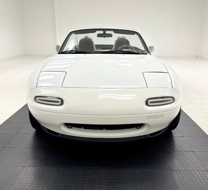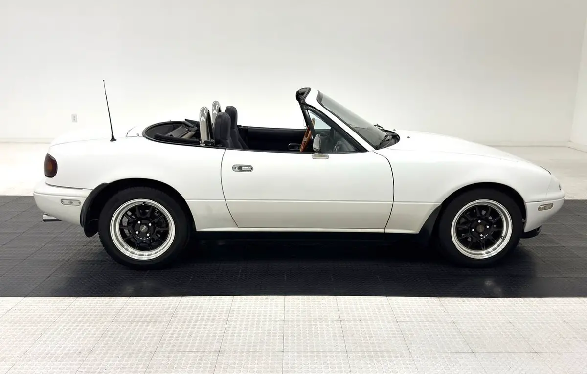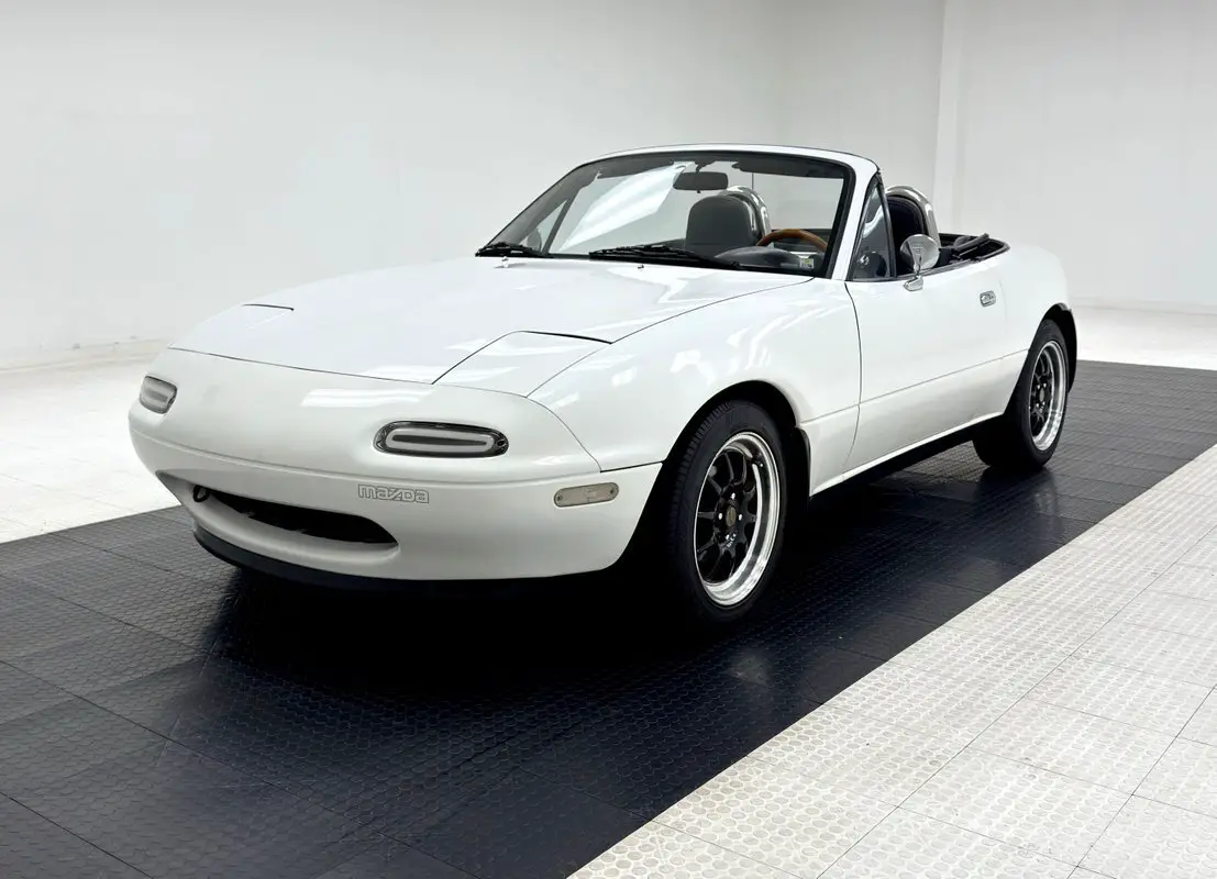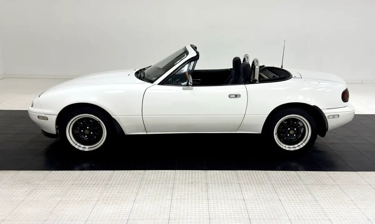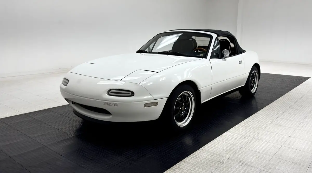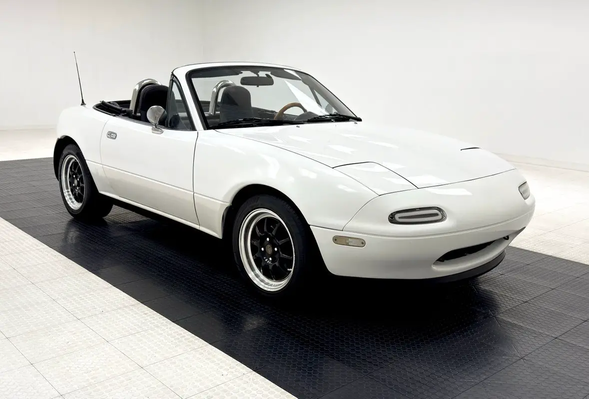 1992 Mazda Miata MX-5 For consignment, a 1992 2 owner Mazda Miata with a title verified 29,957 actual miles. Continually regarded as one of the finest automotive endeavors in history, not only are first gen Miatas classic, but well maintained versions like this one are desirable and the perfect gateway drug into the collector and sports car market. This one has some tasteful cosmetic mods that help it stand out from the crowd. Exterior Here the Crystal White two stage paint is enhanced with clear lens marker lights and polished metal retro side mirrors, giving the car a more monochromatic profile. There's a consistent use of pill shaped ovals on the car, a conscious design decision, and includes the tail lights which fit flush on the rear corners, the marker lights, the door handles, and the gaping air intake under the nose of the car. 15-inch aftermarket wheels create a sharp contrast in black, rimmed in silver, and wrapped in 55 series tires. The black canvas top shows a touch of wear and some cloudiness to the plastic window, along with some tape over a crack. Fitted mud flaps keep dirt off the clean body on which we could not find any glaring imperfections. There are a few incidences of curb rash on the wheels. Interior Black door panels and the recurrence of oval door handles make up the inner doors with crank windows giving you two less electric motors to worry about! Tall cloth bucket seats now rise to meet the chrome roll bars behind them while in front a perhaps a bit more British influence with an added wood rimmed Momo sport steering wheel that frames the standard black instrument cluster topped by a shift light. Chrome rings around the vents also harken to Austin Healey like accoutrements and chrome levers have been added to the A/C panel that is mounted over the AM/FM/Cassette radio and cubby hole storage. In the center console, a wood handled shifter in a stitched black boot and a Nismo shift diagram for even more cross pollination of makes and models. The black loop carpet on the floor is in good shape, and the driver's mat has taken most of the abuse and shows it. The trunk is clean and lined and holds a fire extinguisher and spare tire. Drivetrain Under the hood, a clean, driver quality 1.6 liter DOHC inline four cylinder pumping out 116 horsepower and motivated forward by a 5-speed manual. In true sports car style, power is sent to the rear axle where 4.30 gears are found. Power disc brakes are employed at each corner. An aftermarket shock tower brace has been added for extra stability. Undercarriage Driver quality underneath with typical surface rust but no oil anywhere, clear knuckles, and all the boots look intact. The single exhaust flows back to encounter a stock style muffler before exiting with a chrome tip at the right rear. Coil spring suspension is found front and rear and both ends are independent. Drive-Ability Comfortable seats and a cabin that you become a part of makes for an easy drive around the test loop where the car shifts cleanly, scoots into acceleration, and handles like the proverbial go kart it is! Only the radio and reverse lights don't work on our car, and the airbag light is on because of the steering wheel switch, but all other functions on board operate as they should. While Classic Auto Mall represents that these functions were working at the time of our test drive, we cannot guarantee these functions will be working at the time of your purchase. Its small size, nimbleness and surprisingly quick drivetrain is what made the first gen Miatas such a success, and they only got better from there! Just as there's nothing quite like a vintage British sports car, early Miatas represent Japan's golden egg. Like Easter eggs, future Miatas would be gussied up with bells and whistles, but these early iterations will always be the classic examples. Daily this low mileage example, or save it for places where car lovers gather. Everyone has a soft spot for Miatas, no matter what they drive! JM1NA3511N0329853 J-Japan M-Mazda 1-Passenger Car NA-M1 35-Convertible 1-1.6L B6P 1-Check Digit N-1992 0-Hiroshima, Japan Assy Plant 329853-Sequential Unit Number Classic Auto Mall is home to more than 1,000 classic and collectible vehicles for sale via consignment in a climate controlled 336,000-square foot showroom (that's more than 8 acres!). The largest single location consignment dealer of classic and collectible vehicles in the country is located in Morgantown, Pennsylvania, just 1-hour west of Philadelphia off Exit 298 of the I-76 Pennsylvania Turnpike. For more information visit or call us at 610-901-3804. Contact us anytime for more information or to come see the vehicle in person. There is no guarantee of mileage. A $299 Dealer Administrative fee is not included in the advertised price. With so many great cars, you know we have a lot to talk about, and we do that each week on the Classic Auto Mall Podcast with host Stewart Howden. Stewart discusses new inventory as well as trends in consignments and car prices, while interviewing celebrities and automotive professionals about amazing cars and their history. Tune in each week to the Classic Auto Mall Podcast wherever you enjoy listening. You can also watch on YouTube!