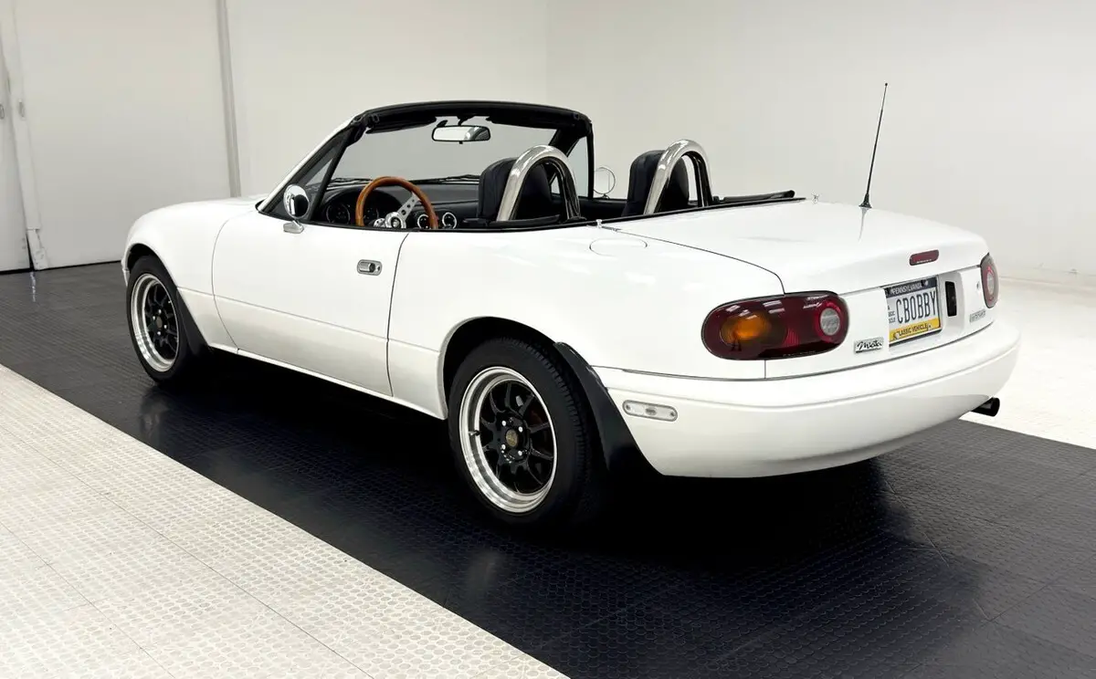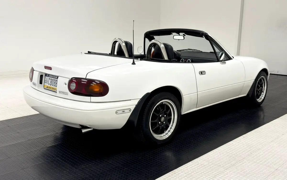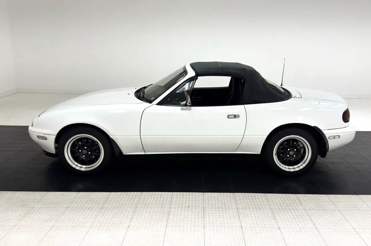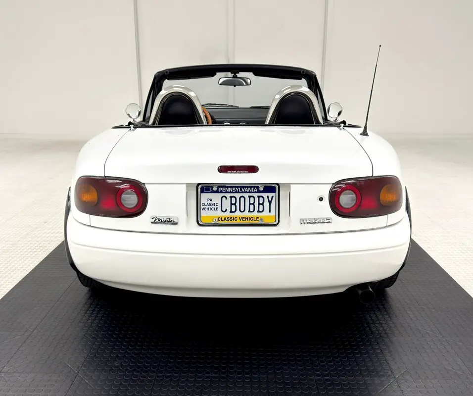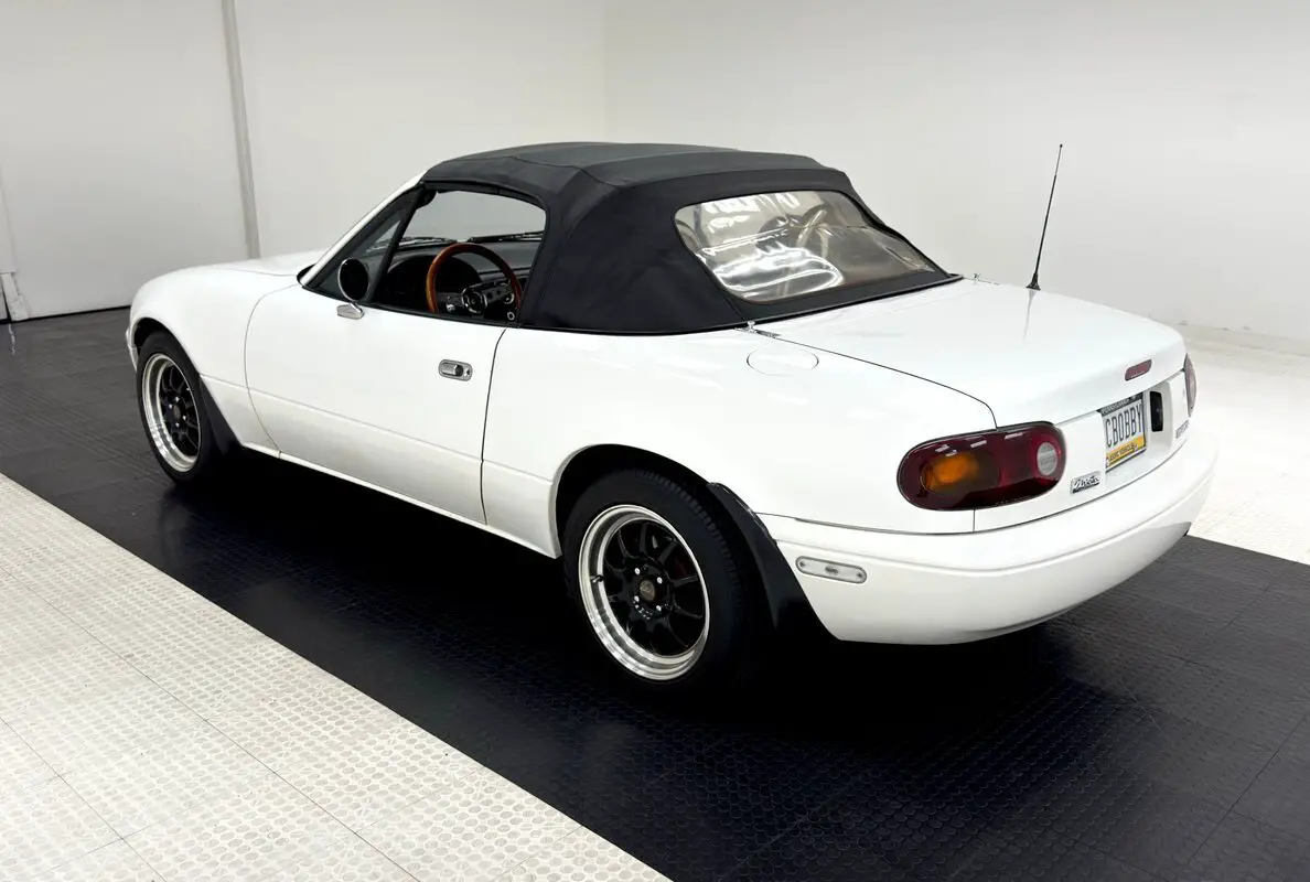 1992 Mazda Miata MX-5 For consignment, a 1992 2 owner Mazda Miata with a title verified 29,957 actual miles. Continually regarded as one of the finest automotive endeavors in history, not only are first gen Miatas classic, but well maintained versions like this one are desirable and the perfect gateway drug into the collector and sports car market. This one has some tasteful cosmetic mods that help it stand out from the crowd. Exterior Here the Crystal White two stage paint is enhanced with clear lens marker lights and polished metal retro side mirrors, giving the car a more monochromatic profile. There's a consistent use of pill shaped ovals on the car, a conscious design decision, and includes the tail lights which fit flush on the rear corners, the marker lights, the door handles, and the gaping air intake under the nose of the car. 15-inch aftermarket wheels create a sharp contrast in black, rimmed in silver, and wrapped in 55 series tires. The black canvas top shows a touch of wear and some cloudiness to the plastic window, along with some tape over a crack. Fitted mud flaps keep dirt off the clean body on which we could not find any glaring imperfections. There are a few incidences of curb rash on the wheels. Interior Black door panels and the recurrence of oval door handles make up the inner doors with crank windows giving you two less electric motors to worry about! Tall cloth bucket seats now rise to meet the chrome roll bars behind them while in front a perhaps a bit more British influence with an added wood rimmed Momo sport steering wheel that frames the standard black instrument cluster topped by a shift light. Chrome rings around the vents also harken to Austin Healey like accoutrements and chrome levers have been added to the A/C panel that is mounted over the AM/FM/Cassette radio and cubby hole storage. In the center console, a wood handled shifter in a stitched black boot and a Nismo shift diagram for even more cross pollination of makes and models. The black loop carpet on the floor is in good shape, and the driver's mat has taken most of the abuse and shows it. The trunk is clean and lined and holds a fire extinguisher and spare tire. Drivetrain Under the hood, a clean, driver quality 1.6 liter DOHC inline four cylinder pumping out 116 horsepower and motivated forward by a 5-speed manual. In true sports car style, power is sent to the rear axle where 4.30 gears are found. Power disc brakes are employed at each corner. An aftermarket shock tower brace has been added for extra stability. Undercarriage Driver quality underneath with typical surface rust but no oil anywhere, clear knuckles, and all the boots look intact. The single exhaust flows back to encounter a stock style muffler before exiting with a chrome tip at the right rear. Coil spring suspension is found front and rear and both ends are independent. Drive-Ability Comfortable seats and a cabin that you become a part of makes for an easy drive around the test loop where the car shifts cleanly, scoots into acceleration, and handles like the proverbial go kart it is! Only the radio and reverse lights don't work on our car, and the airbag light is on because of the steering wheel switch, but all other functions on board operate as they should. While Classic Auto Mall represents that these functions were working at the time of our test drive, we cannot guarantee these functions will be working at the time of your purchase. Its small size, nimbleness and surprisingly quick drivetrain is what made the first gen Miatas such a success, and they only got better from there! Just as there's nothing quite like a vintage British sports car, early Miatas represent Japan's golden egg. Like Easter eggs, future Miatas would be gussied up with bells and whistles, but these early iterations will always be the classic examples. Daily this low mileage example, or save it for places where car lovers gather. Everyone has a soft spot for Miatas, no matter what they drive! JM1NA3511N0329853 J-Japan M-Mazda 1-Passenger Car NA-M1 35-Convertible 1-1.6L B6P 1-Check Digit N-1992 0-Hiroshima, Japan Assy Plant 329853-Sequential Unit Number Classic Auto Mall is home to more than 1,000 classic and collectible vehicles for sale via consignment in a climate controlled 336,000-square foot showroom (that's more than 8 acres!). The largest single location consignment dealer of classic and collectible vehicles in the country is located in Morgantown, Pennsylvania, just 1-hour west of Philadelphia off Exit 298 of the I-76 Pennsylvania Turnpike. For more information visit or call us at 610-901-3804. Contact us anytime for more information or to come see the vehicle in person. There is no guarantee of mileage. A $299 Dealer Administrative fee is not included in the advertised price. With so many great cars, you know we have a lot to talk about, and we do that each week on the Classic Auto Mall Podcast with host Stewart Howden. Stewart discusses new inventory as well as trends in consignments and car prices, while interviewing celebrities and automotive professionals about amazing cars and their history. Tune in each week to the Classic Auto Mall Podcast wherever you enjoy listening. You can also watch on YouTube!
