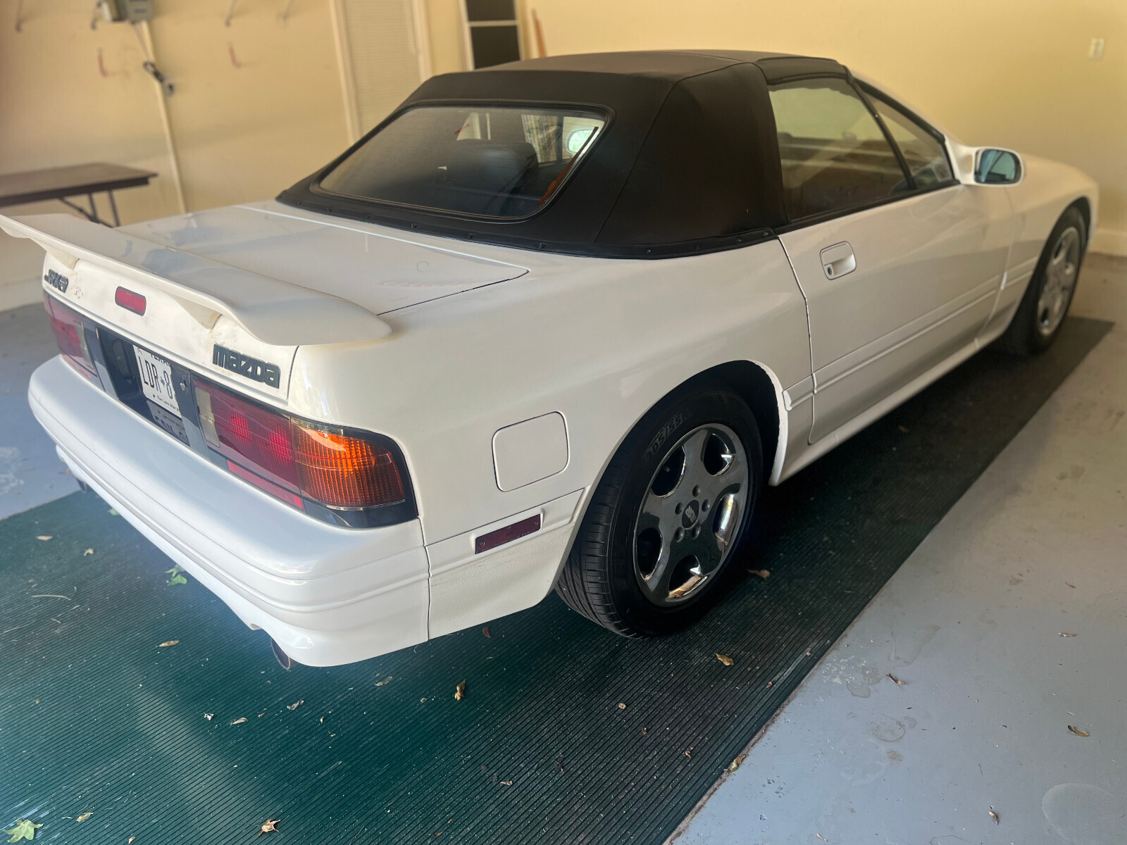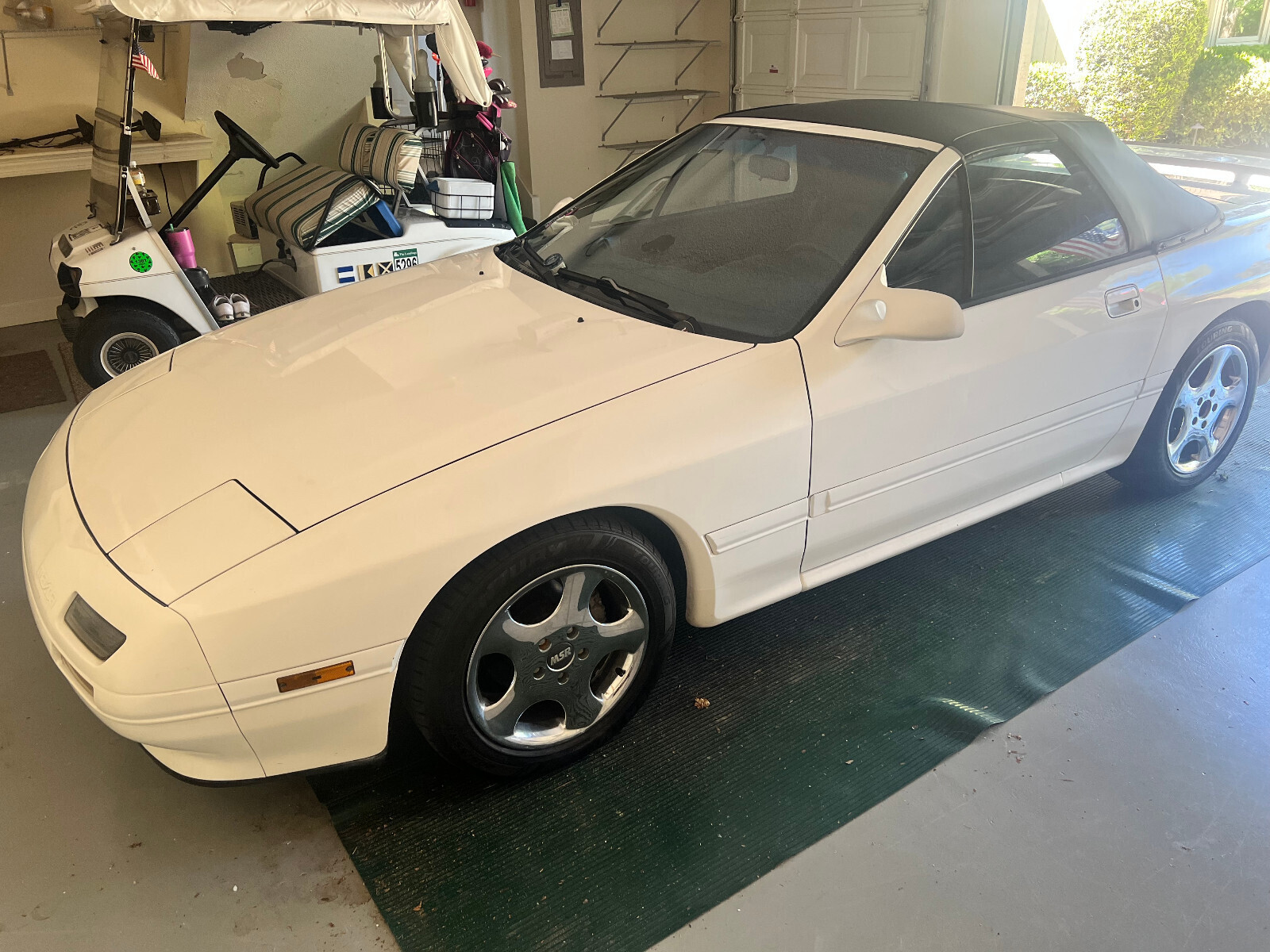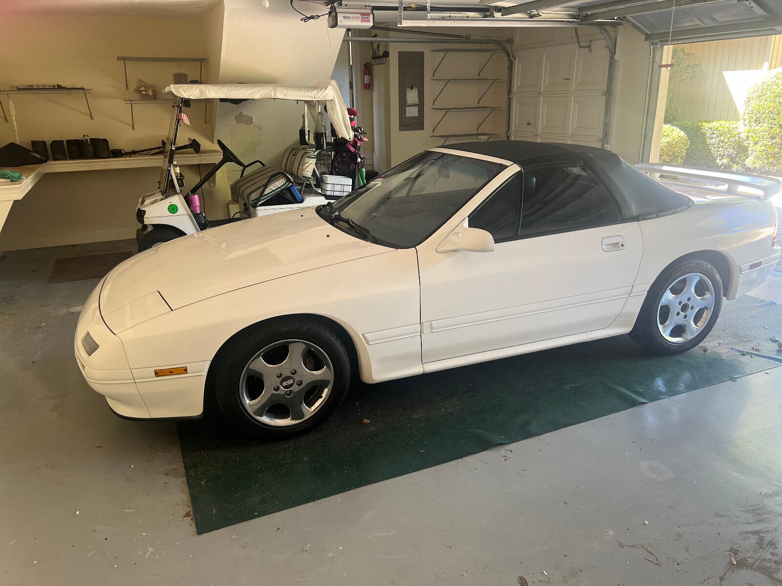 1991 Mazda RX7 Convertible, 49K Original Miles, Excellent Condition, Loaded, White Exterior, Blue Leather Interior, Black Convertible Top with Glass Rear Window and Rear Window Defroster, Cold AC, Dual Front Air Bags, Power Windows, Tilt Wheel, Cruise Control, Original AM/FM/CD Stereo, Built-in Equalizer, Stereo Headrest Speakers, Blue Matching - Tonneau Convertible Top Cover, EMC Custom Wheels & New Tires.