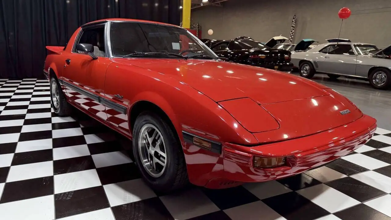 This RX-7 has a Factory-finished Sunrise Red (RH), the car features a sunroof, pop-up headlights, power-adjustable side mirrors, a rear spoiler, a rear-window wiper and louvers, with a power antenna. Four-spoke 13 alloy wheels are mounted with 185/70 Heritage Metric TR tires.