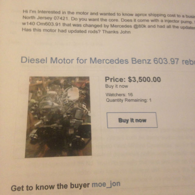 I have a almost showroom W140 300sd Diesel Mercedes sadly must go. I bought the car from an Estate and it began to use oil. I have replaced the motor with a rebuilt complete motor, 7/2016. I also replaced the A/C comp.and starter with motor install as well hoses etc.. I am very formula with all the defectives in this car and addressed all of them. The motor has all updates on the rebuild. The engine wiring harnesses were changed due to mfg defect in wiring insulation. It gave me 30+ MPG to Fla. and back, with no oil consumption or issues. The radio was replaced and rewired in as Amp failed. There is an XM radio dock,you can activate. This car is rare. New tires and brakes, Battery. I do have some spare parts that go along. The only defect is a small crack in lower left windshield. I have spent over 12k on this project but my lose your gain. The paint and interior are flawless. The car has a few dings and dongs but to few to mention on a 25 year old car. The car can be seen with an appointment. The car also has a kill switch and a car cover. Please no 0 bidder unless contact made 1st. 500.00 due at end of auction. It is for sale local and will end if sold.