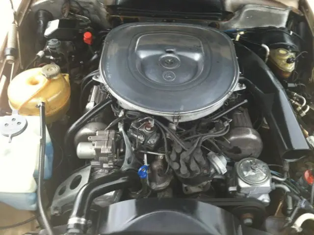 This 1981 Mercedes Benz 380 SLC is a left-hand drive. Body appears to be in original condition and shows no signs of rust or corrosion underneath body panels. Paint color is gold. The paint is in very good condition. It has the original seat covers and the interior shows minor wear. It's equipped with the optional factory automatic transmission. The windshield, side glass and rearglass are all in excellent condition.