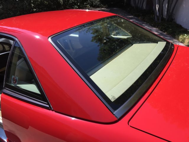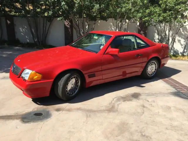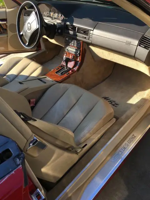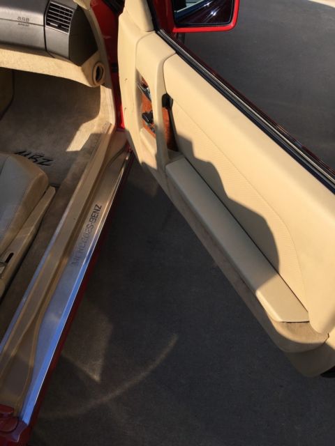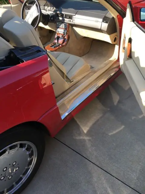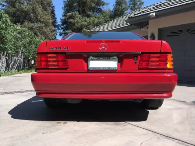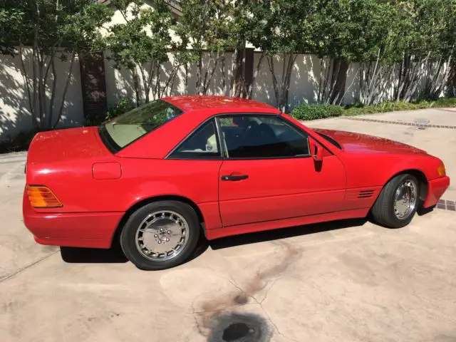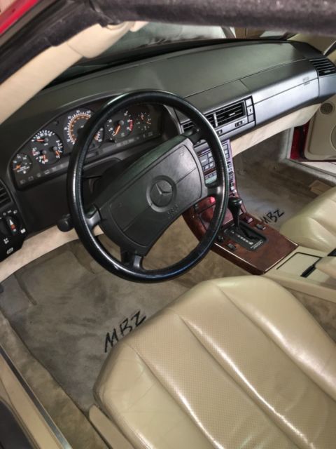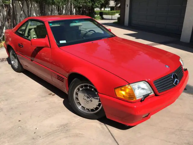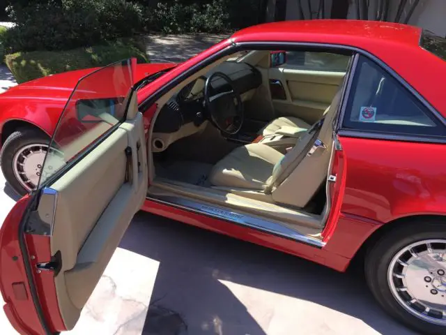Private party sale of a very good condition Used 29,138 very low mileage one-owner red 1990 Mercedes Benz 500 SL. 322-hp 32 valve V-8. This R129 chassis vehicle was purchased new in June 1990 and has remained with the original owner in Southern California ever since. Always covered while inside a garage, this dealer maintained vehicle includes the factory hardtop, original books, keys, window sticker, tools, first aid kit, etc. The vehicle was manufactured with the contrasting color lower body cladding. After purchase the cladding was immediately painted Mercedes Benz signal red to match the car.Vehicle paint is in very good condition.