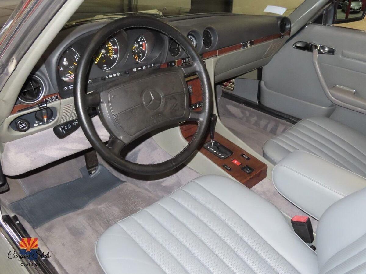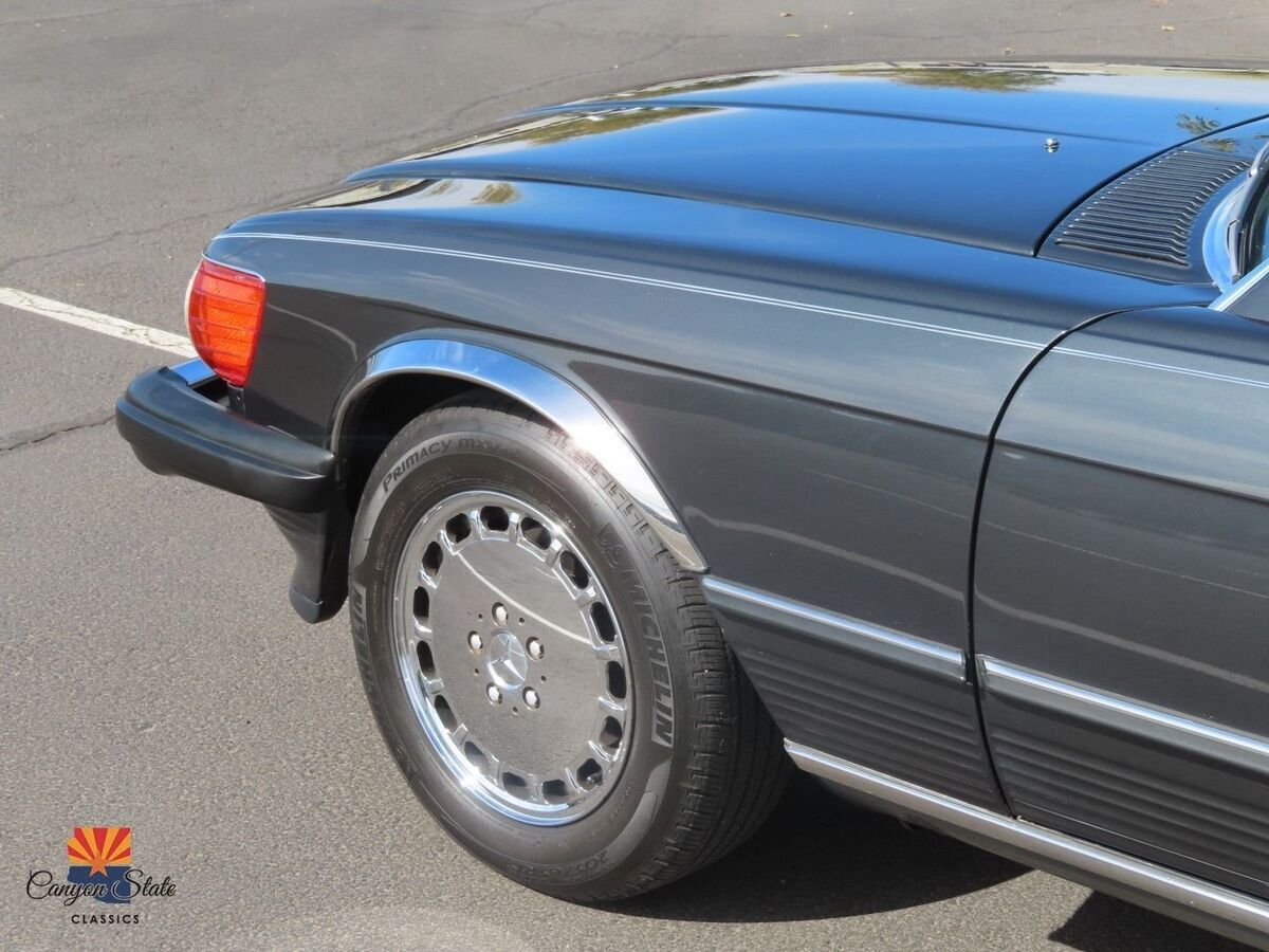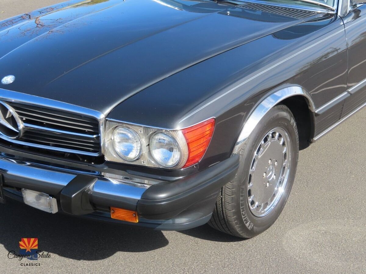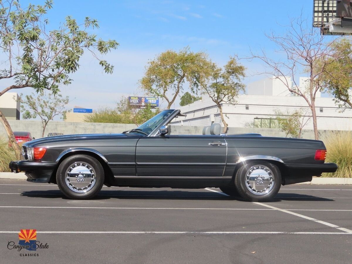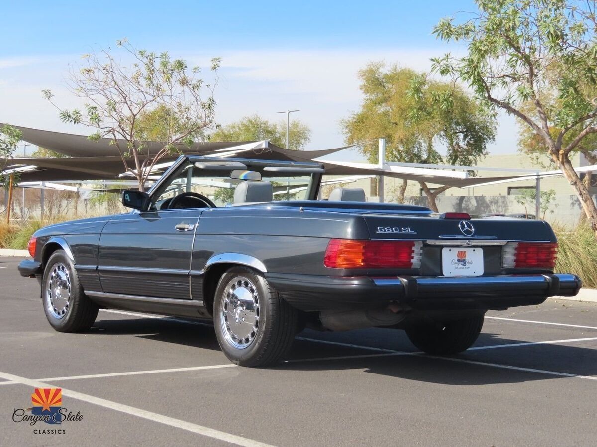 The body on the car is in pristine condition and was extremely well maintained. The car is finished in its gorgeous original Mercedes color of Anthracite Gray and is in awesome condition. The car is straight as an arrow and looks spectacular. The car has been completely inspected underneath from front to back and is solid as a rock as any collector car should be. The car is riding on the original 15" wheels with the correct size tires that are older. The windshield is like new with no chips. The black German Cloth soft top is brand new and was just installed. The hard top has good seals and the headliner is in awesome shape.The interior is in great shape all around. The dash and door panels are in like new condition. The supple original gray leather seats are all in very good condition and look very nice with no rips or ware lines, which shows the quality of leather used in this car. The carpets are all very nice are not worn or damaged. All dials and controls function as they should, power windows and antenna also are fully functional. Music is crisp and clear and not overwhelming. The sound system definitely adds to the driving experience of this roadster. All lights, gauges switches, and accessories work as they should. This interior is in immaculate condition.The trunk compartment is clean enough to eat from. The spare tire compartment is clean as a whistle and the original spare tire is present. Original jack is in place and the tool kit is even still in the unopened bag.Mechanically, this SL runs GREAT! The car starts right up and shifts smooth as silk. It drives as good now as the day it rolled of the lot. The V8 engine is surprisingly quick and responsive. It is reliable, easy to fix, and parts are readily available. The car was always regularly serviced and has been well documented SINCE BRAND NEW! Recent inspection upon arrival to AZ yields a clean bill of health. Under the hood is clean as a whistle and looks like new. I just had the oil changed, and brake fluid flushed and the car given a once over and its all ready to hit the road with the top dropped! I will put my personal stamp of approval on the mechanical excellence of the car.All in all, this is one of the cleanest and nicest SL's that I have had the privilege of being associated with. I truly feel it is one of the nicest 560sl's in existence and I will put it next to any of the lower mileage examples and it will hold its own. It has been professionally maintained and truly loved by its previous owner. This Mercedes is a fantastic car for the price and includes every option offered in this car. This is your chance to get an like new classic convertible for a fraction of the cost of its original price. The car has a clean Arizona Title. Any further questions please call Jon at 480-703-2337.