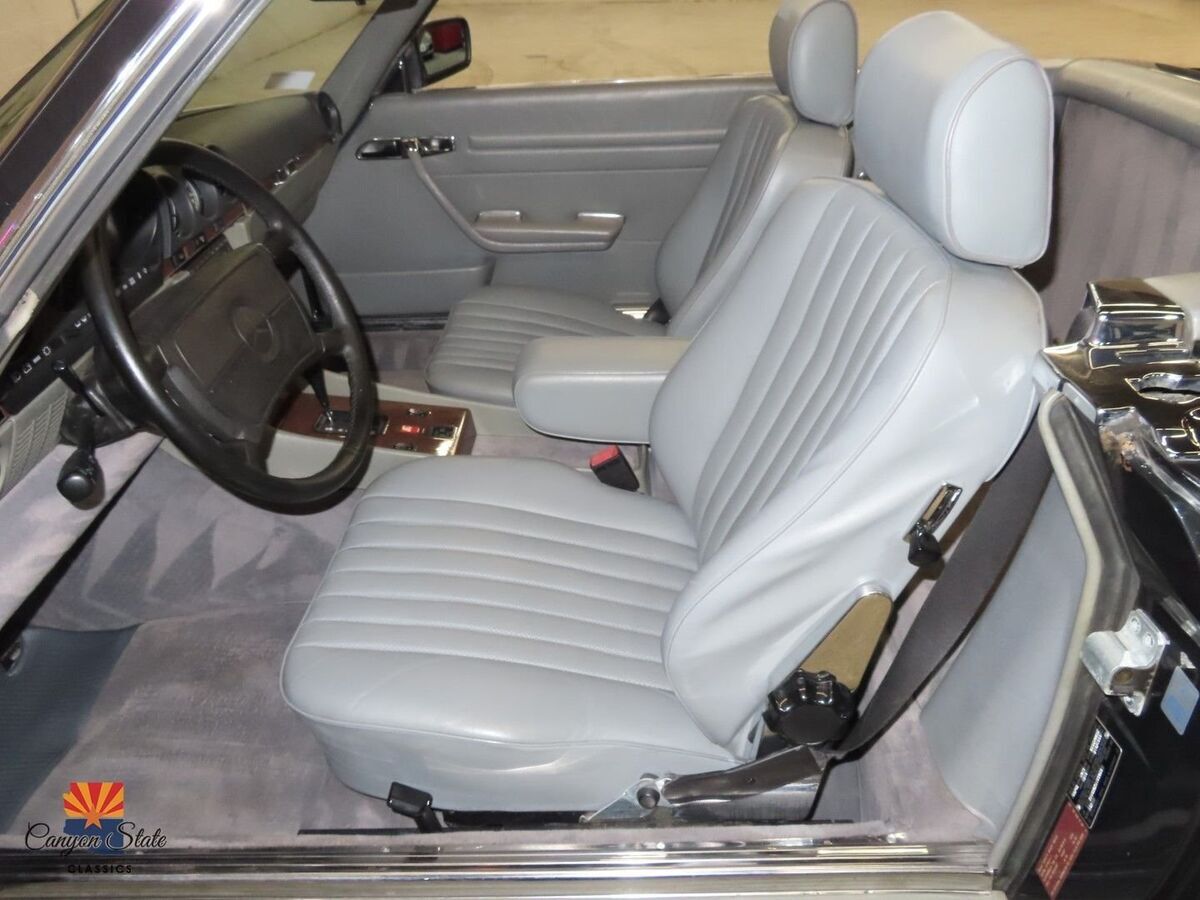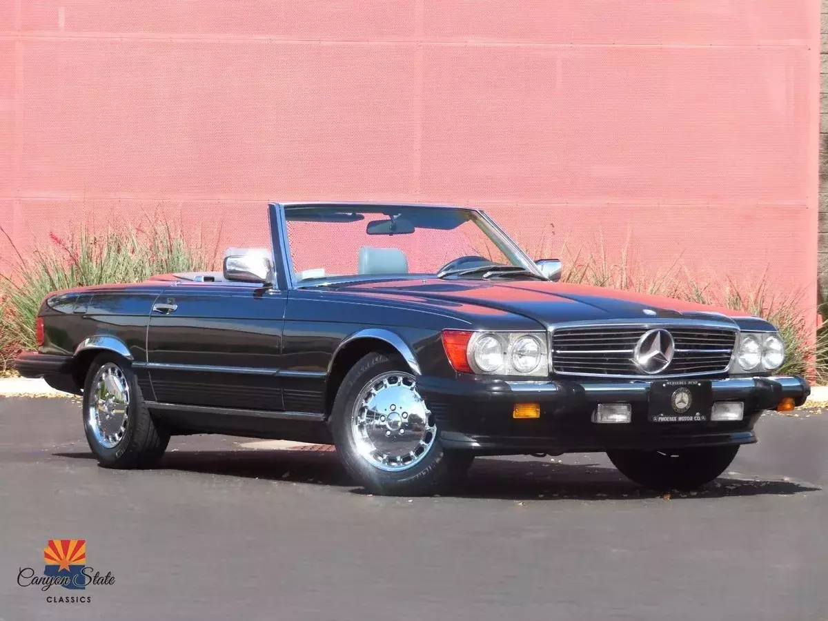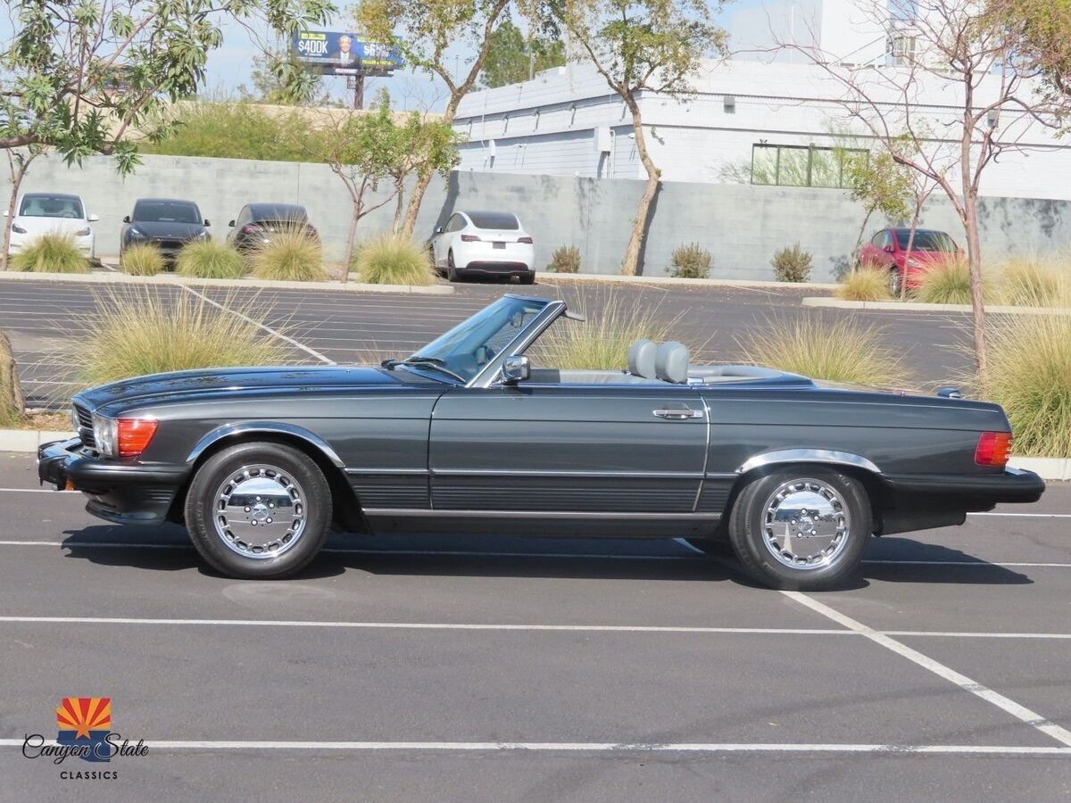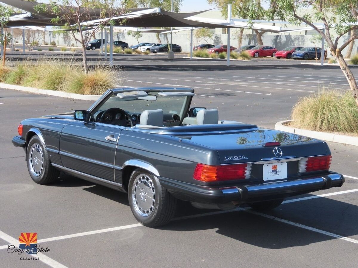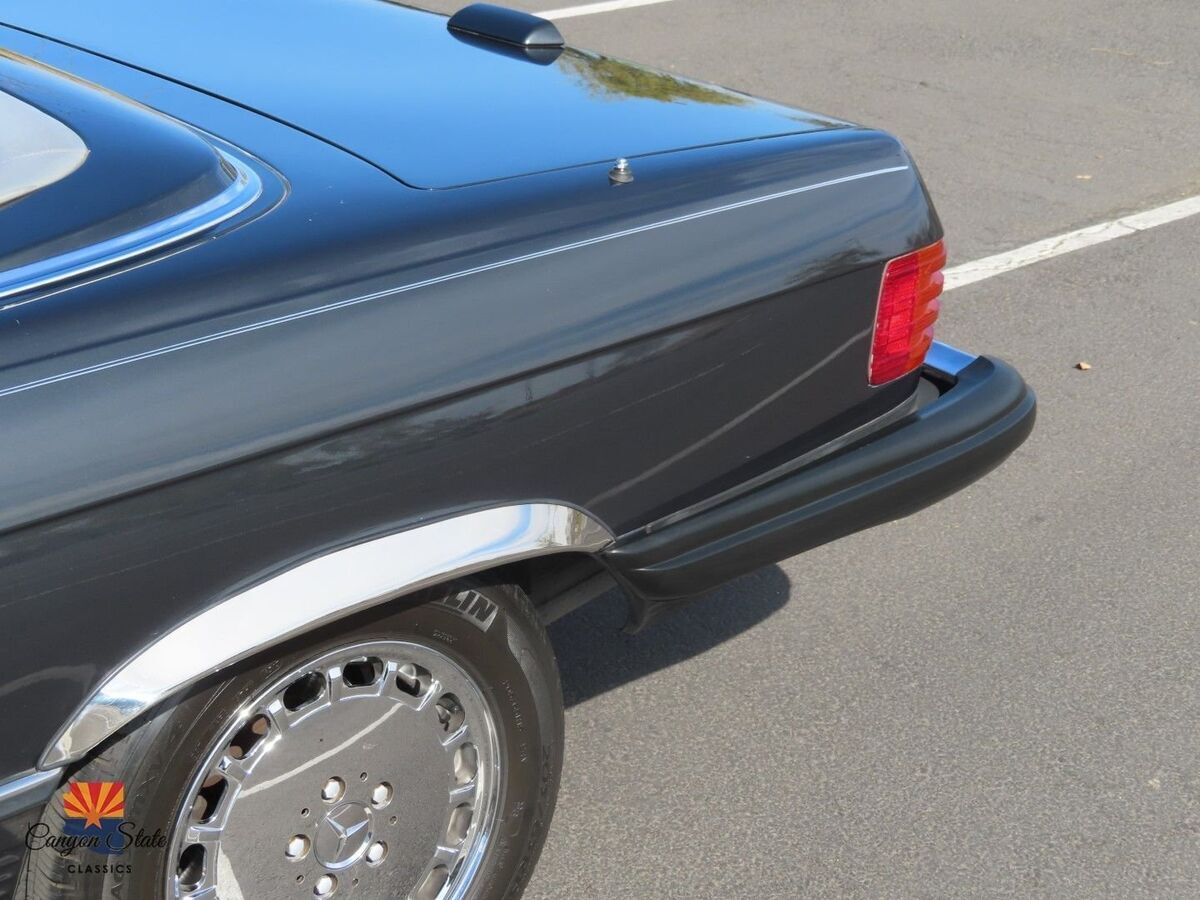The body on the car is in pristine condition and was extremely well maintained. The car is finished in its gorgeous original Mercedes color of Anthracite Gray and is in awesome condition. The car is straight as an arrow and looks spectacular. The car has been completely inspected underneath from front to back and is solid as a rock as any collector car should be. The car is riding on the original 15" wheels with the correct size tires that are older. The windshield is like new with no chips. The black German Cloth soft top is brand new and was just installed. The hard top has good seals and the headliner is in awesome shape.The interior is in great shape all around. The dash and door panels are in like new condition. The supple original gray leather seats are all in very good condition and look very nice with no rips or ware lines, which shows the quality of leather used in this car. The carpets are all very nice are not worn or damaged. All dials and controls function as they should, power windows and antenna also are fully functional. Music is crisp and clear and not overwhelming. The sound system definitely adds to the driving experience of this roadster. All lights, gauges switches, and accessories work as they should. This interior is in immaculate condition.The trunk compartment is clean enough to eat from. The spare tire compartment is clean as a whistle and the original spare tire is present. Original jack is in place and the tool kit is even still in the unopened bag.Mechanically, this SL runs GREAT! The car starts right up and shifts smooth as silk. It drives as good now as the day it rolled of the lot. The V8 engine is surprisingly quick and responsive. It is reliable, easy to fix, and parts are readily available. The car was always regularly serviced and has been well documented SINCE BRAND NEW! Recent inspection upon arrival to AZ yields a clean bill of health. Under the hood is clean as a whistle and looks like new. I just had the oil changed, and brake fluid flushed and the car given a once over and its all ready to hit the road with the top dropped! I will put my personal stamp of approval on the mechanical excellence of the car.All in all, this is one of the cleanest and nicest SL's that I have had the privilege of being associated with. I truly feel it is one of the nicest 560sl's in existence and I will put it next to any of the lower mileage examples and it will hold its own. It has been professionally maintained and truly loved by its previous owner. This Mercedes is a fantastic car for the price and includes every option offered in this car. This is your chance to get an like new classic convertible for a fraction of the cost of its original price. The car has a clean Arizona Title. Any further questions please call Jon at 480-703-2337.