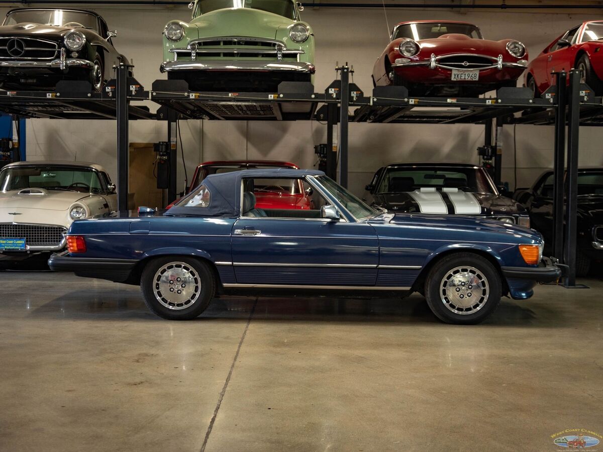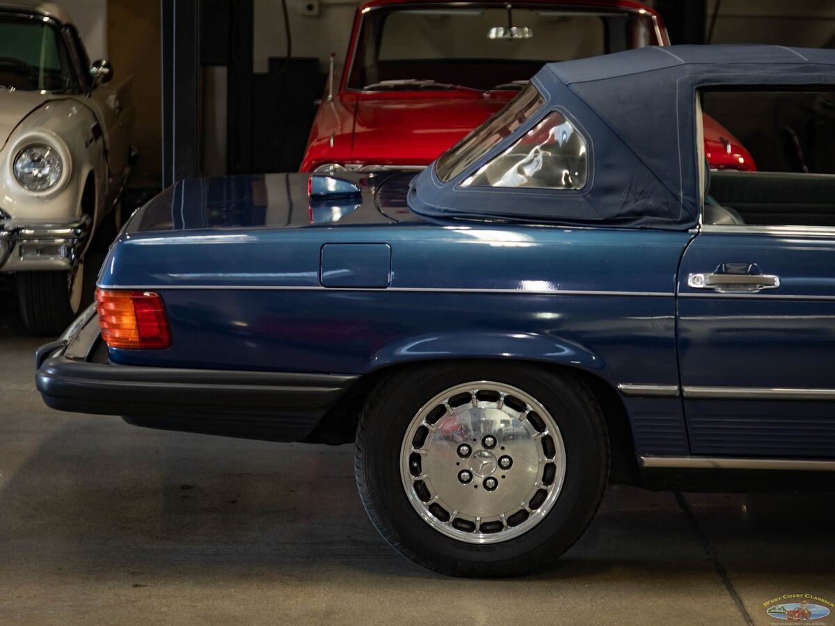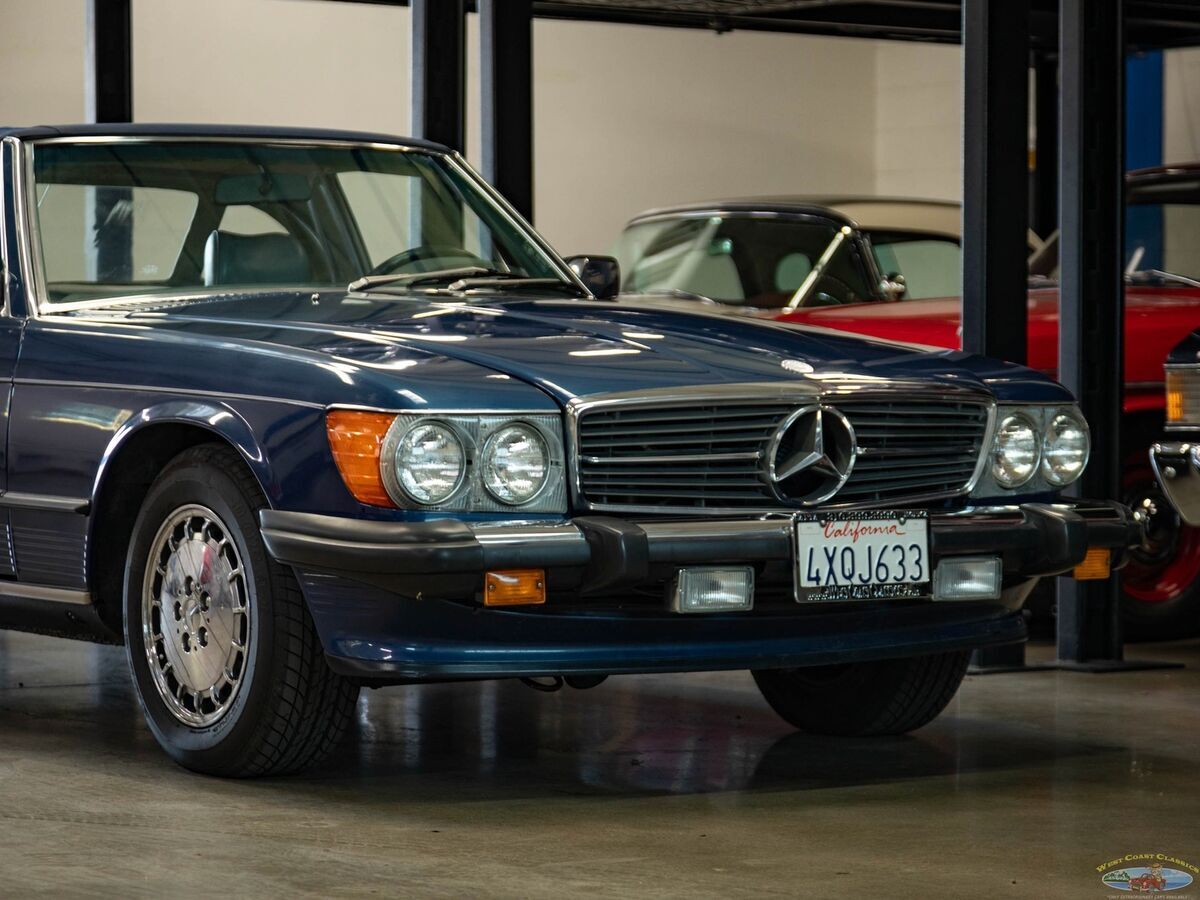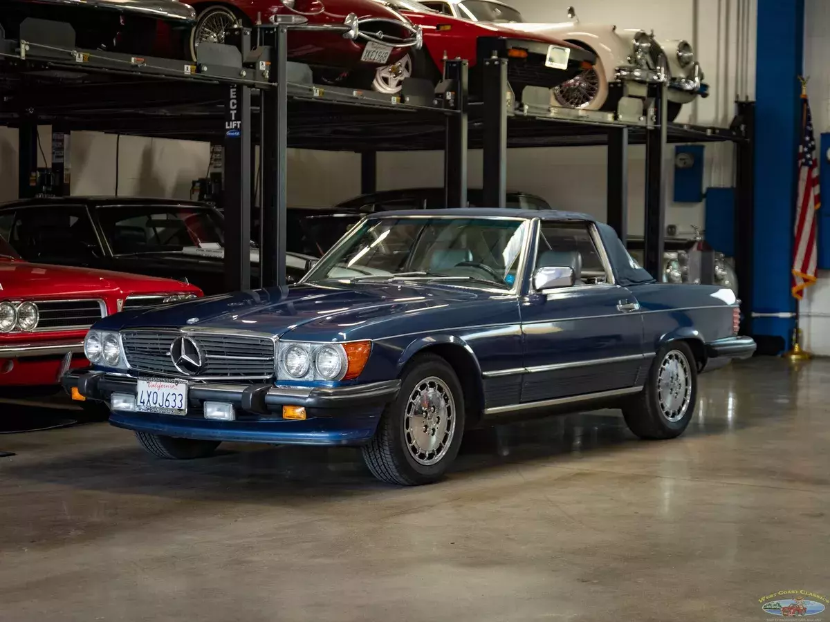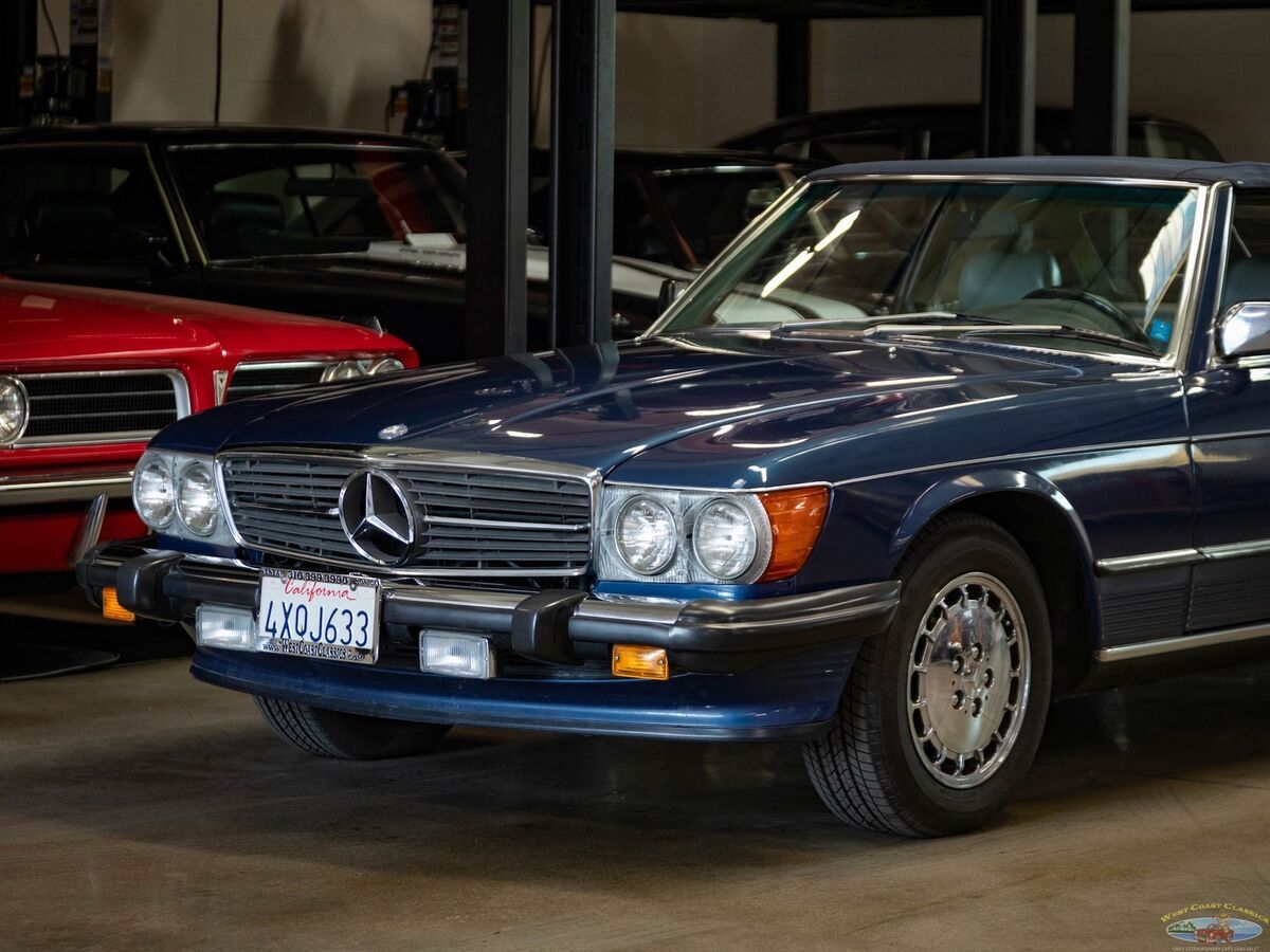 West Coast Classics are proud to present a striking example of this 1987 Mercedes-Benz 560SL roadster in its highly desirable and striking original factory 'Nautical Blue Metallic' (color code 929) paint with a 'Gray' (trim code 278) leather interior, its original 'Blue' German folding canvas soft top, factory chrome alloy wheels, matching factory hard top and only 57K original and actual miles!The car's factory options include: 5.6 liter OHC V8 engine, automatic transmission with torque converter, supplemental restraint system, anti-theft alarm system with radio theft deterrent, power assisted steering, cruise control, tinted glass, electric window lifts, electrically heated rear window on hard top, fully independent suspension, power assisted four wheel disc brakes, anti-lock braking system, light alloy wheels, limited slip differential, leather upholstery, adjustable bucket seats and head restraints, front center folding arm rest, leather covered steering wheel and gear selector, 'Becker' radio/cassette (replaced with aftermarket CD Player) with automatic antenna, Aerodynamic Halogen Head & Fog lamps and air conditioning with automatic climate control and central locking.Obviously always garaged with a clean CARFAX report with the original factory 'Nautical Blue Metallic' color paint and with a 'Gray' leather interior and with the original leather dashboard. The car has its original Blue 'German canvas' soft top which is still in excellent condition. The car also boats its original spare tire.The car drives exactly like such a well maintained and serviced and fully documented Mercedes with only 57K original miles should and must be seen and driven to be truly appreciated! All the options are working except for the A/C which does not blow cold.Without a doubt, this is one of the finest classically beautiful roadster designs built by Mercedes-Benz, probably the last classically beautiful convertible series they built and now becoming more desirable and collectible than ever before - certainly you will look long and hard to find a finer head-turning example with only 57K original miles in this most striking and desirable of color combinations available anywhere else!