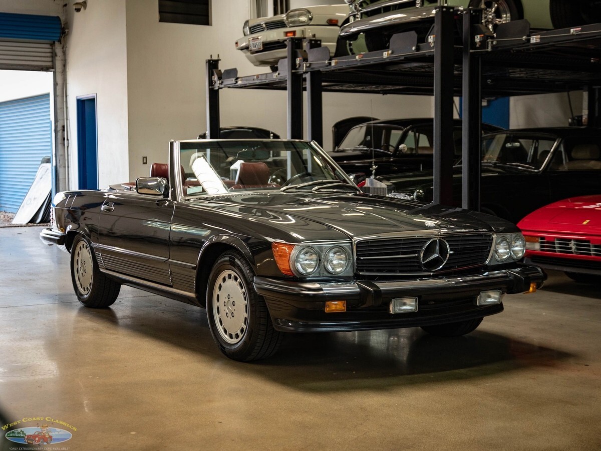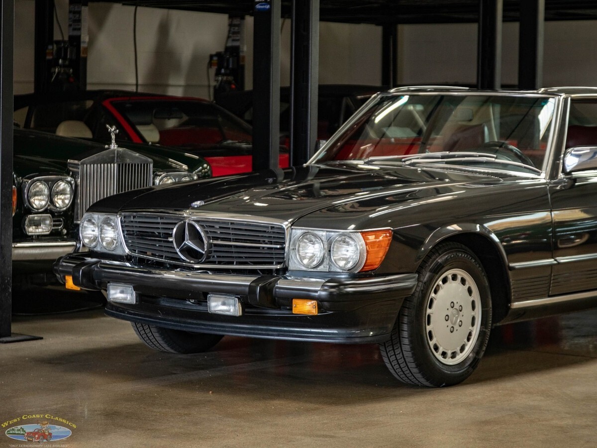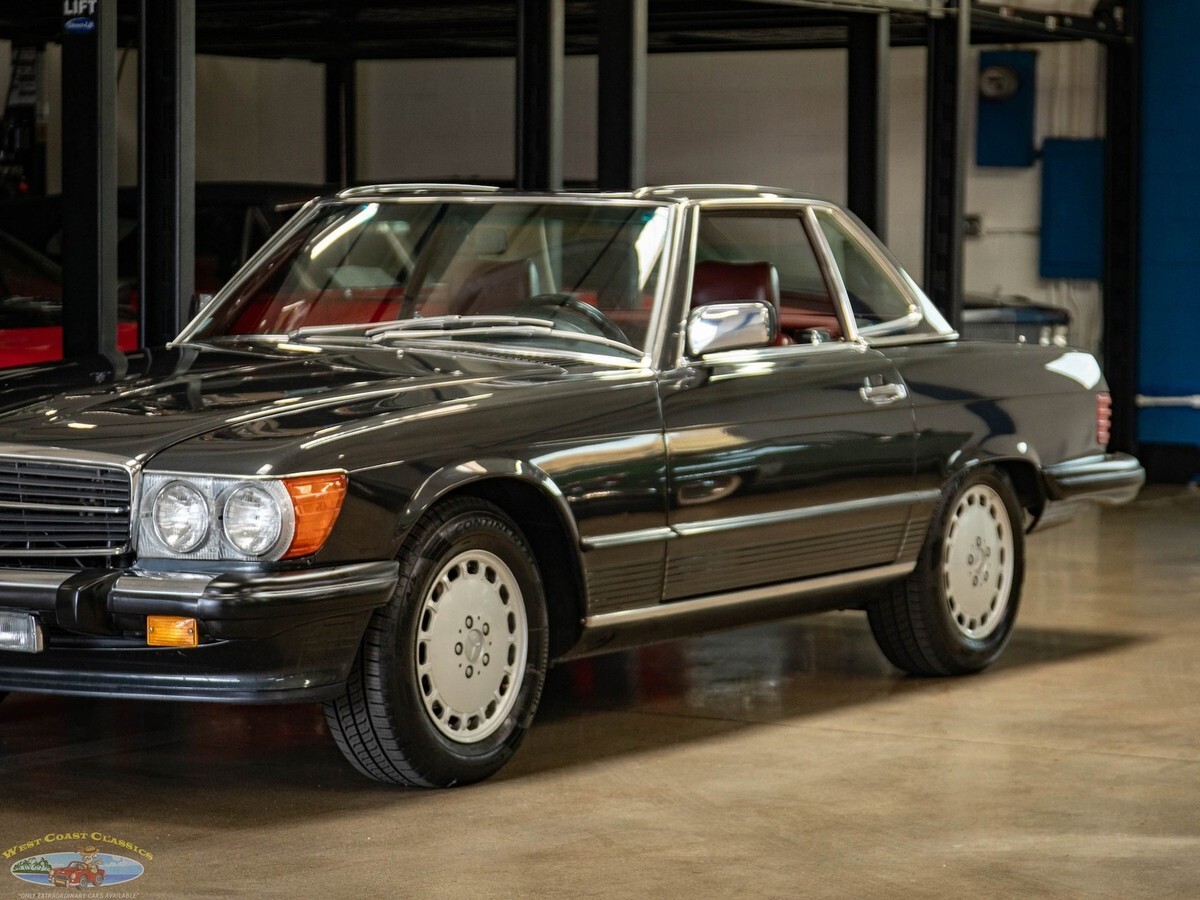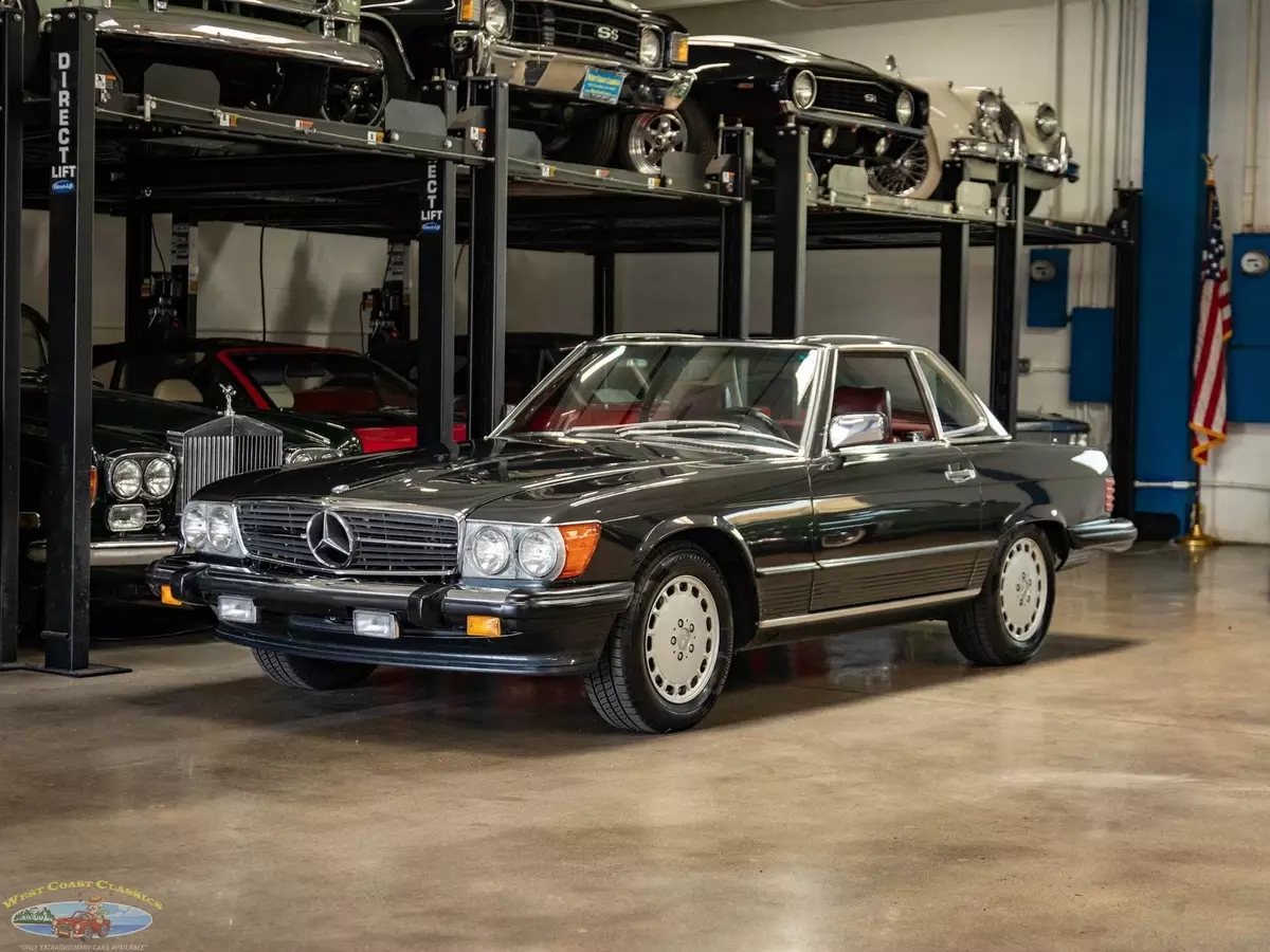 West Coast Classics are proud to present an absolutely exceptional example of this all original 1987 Mercedes-Benz 560SL roadster in its highly desirable and very striking original factory 'Black Pearl Metallic' (color code 199) paint with a gorgeous 'Medium Red' (trim code 277) leather interior, its original and hardly used original 'Black' German (code 740) folding canvas soft top, factory alloy wheels, matching factory hard top and only 21,785 original and actual miles (35,061 kms)! Quite simply, if you want to own one of the very best examples of a 560SL anywhere, you've found it here!ORIGINAL 21K MILESALL SERVICE HISTORY FROM SAME ONE MERCEDES-BENZ DEALERSHIP WHERE SOLD FROM 1987-2025.EVERY SERVICE RECORD SINCE NEW!ORIGINAL 'BLACK PEARL METALLIC PAINT' FACTORY COLOR PAINTORIGINAL 'MEDIUM RED' LEATHER INTERIORALL ORIGINAL OWNERS MANUALS, PORTECTO-PLATE AND SERVICE BOOKLETSORIGINAL FACTORY TOOLS & SPARE WHEELORIGINAL FACTORY HARD TOP & SOFT TOPA/C CONVERTED FROM R12 TO R134AThe car's factory options include: 5.6 liter OHC V8 engine, automatic transmission with torque converter, supplemental restraint system, anti-theft alarm system with radio theft deterrent, power assisted steering, cruise control, tinted glass, electric window lifts, electrically heated rear window on hard top, fully independent suspension, power assisted four wheel disc brakes, anti-lock braking system, light alloy wheels, limited slip differential, leather upholstery, adjustable bucket seats and head restraints, front center folding arm rest, leather covered steering wheel and gear selector, original 'Becker Grand Prix' radio/cassette with automatic antenna, Aerodynamic Halogen Head & Fog lamps and air conditioning with automatic climate control and central locking.Obviously always garaged and covered with no accidents and a clean CARFAX report with the original and very rare factory 'Black Pearl Metallic' color paint still virtually flawless and with an absolutely beautiful condition 'Medium Red' leather interior with virtually no signs of any wear and with the original leather dashboard and the walnut wood veneer interior still like new (obviously always garaged from the sun and elements!) The car has its original Black 'German canvas' soft top which is still in as new condition and was never used and the car has it's original and also factory matching hard top with stand. The car boasts all its original owners manuals, service booklets, protecto-plate, and tools still unwrapped in their original factory canvas pouch.The car boasts a thick file of all its original records and service receipts and all the original selling dealers documentation from 'Lonestar Motors' the Mercedes-Benz dealership of Calgary, Alberta, Canada where the car was regularly serviced on schedule since new until 2023! The car also boats its original spare tire and wrapped factory tools still in its compartment in the trunk. The car has 4 brand new tires.The car drives exactly like such a well maintained and serviced and fully documented Mercedes with only 21K original miles should and must be seen and driven to be truly appreciated! All the options are working as they should including the A/C.Without a doubt, this is one of the finest classically beautiful roadster designs built by Mercedes-Benz, probably the last classically beautiful convertible series they built and now becoming more desirable and collectible than ever before - certainly you will look long and hard to find a finer head-turning example with full documentation and with only 21K original miles in this most striking and desirable of color combinations available anywhere else!