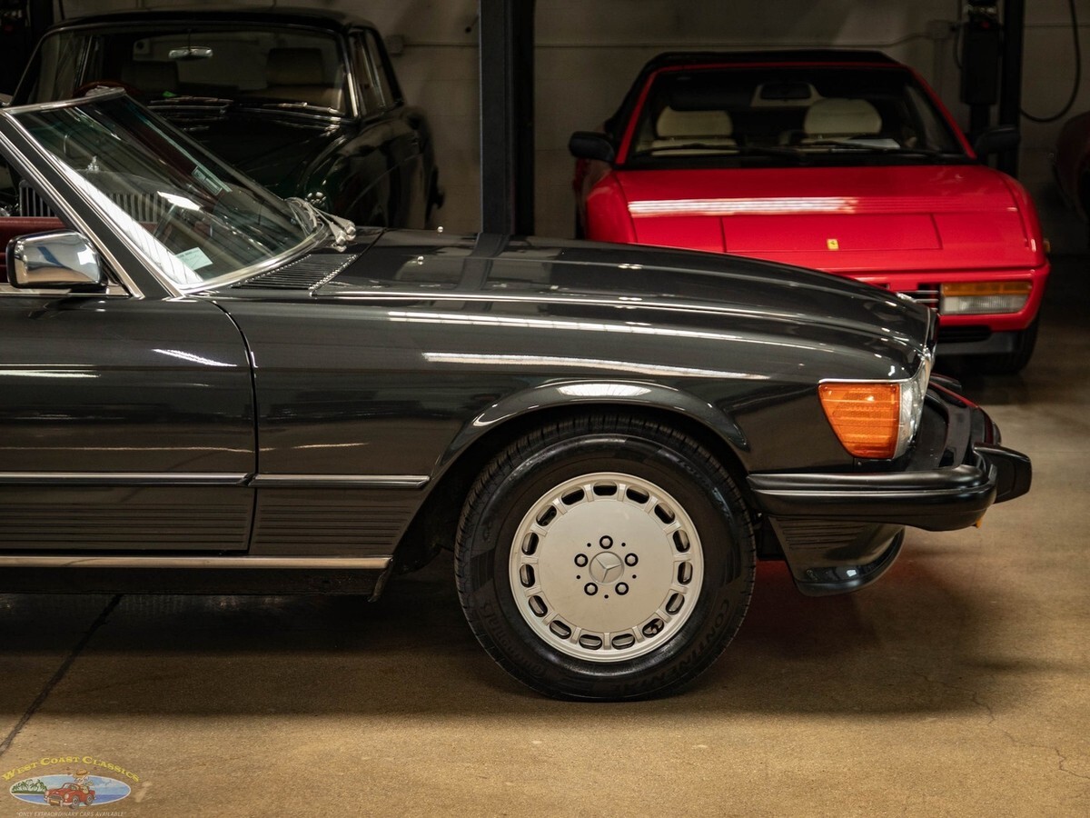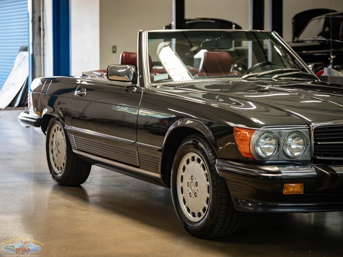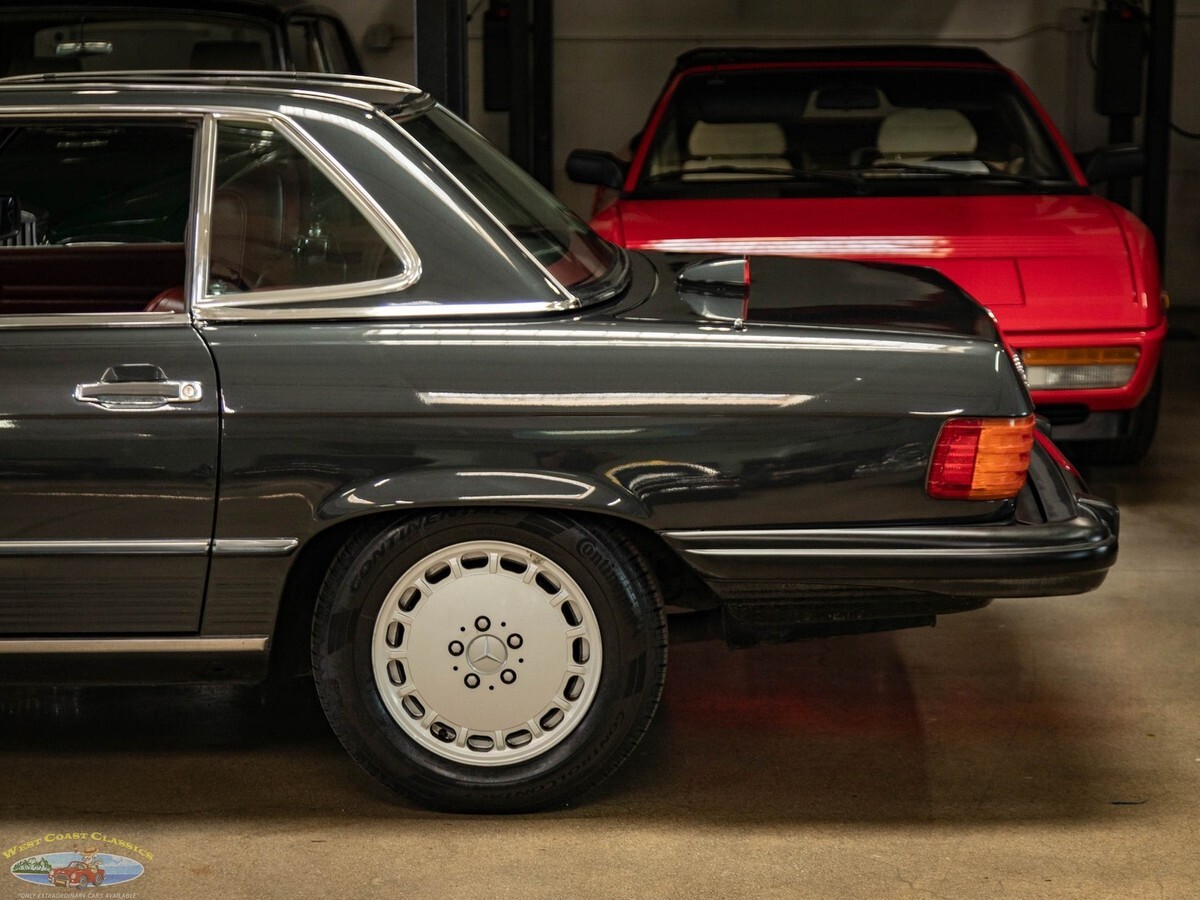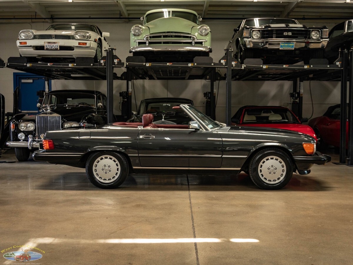 West Coast Classics are proud to present an absolutely exceptional example of this all original 1987 Mercedes-Benz 560SL roadster in its highly desirable and very striking original factory 'Black Pearl Metallic' (color code 199) paint with a gorgeous 'Medium Red' (trim code 277) leather interior, its original and hardly used original 'Black' German (code 740) folding canvas soft top, factory alloy wheels, matching factory hard top and only 21,785 original and actual miles (35,061 kms)! Quite simply, if you want to own one of the very best examples of a 560SL anywhere, you've found it here!ORIGINAL 21K MILESALL SERVICE HISTORY FROM SAME ONE MERCEDES-BENZ DEALERSHIP WHERE SOLD FROM 1987-2025.EVERY SERVICE RECORD SINCE NEW!ORIGINAL 'BLACK PEARL METALLIC PAINT' FACTORY COLOR PAINTORIGINAL 'MEDIUM RED' LEATHER INTERIORALL ORIGINAL OWNERS MANUALS, PORTECTO-PLATE AND SERVICE BOOKLETSORIGINAL FACTORY TOOLS & SPARE WHEELORIGINAL FACTORY HARD TOP & SOFT TOPA/C CONVERTED FROM R12 TO R134AThe car's factory options include: 5.6 liter OHC V8 engine, automatic transmission with torque converter, supplemental restraint system, anti-theft alarm system with radio theft deterrent, power assisted steering, cruise control, tinted glass, electric window lifts, electrically heated rear window on hard top, fully independent suspension, power assisted four wheel disc brakes, anti-lock braking system, light alloy wheels, limited slip differential, leather upholstery, adjustable bucket seats and head restraints, front center folding arm rest, leather covered steering wheel and gear selector, original 'Becker Grand Prix' radio/cassette with automatic antenna, Aerodynamic Halogen Head & Fog lamps and air conditioning with automatic climate control and central locking.Obviously always garaged and covered with no accidents and a clean CARFAX report with the original and very rare factory 'Black Pearl Metallic' color paint still virtually flawless and with an absolutely beautiful condition 'Medium Red' leather interior with virtually no signs of any wear and with the original leather dashboard and the walnut wood veneer interior still like new (obviously always garaged from the sun and elements!) The car has its original Black 'German canvas' soft top which is still in as new condition and was never used and the car has it's original and also factory matching hard top with stand. The car boasts all its original owners manuals, service booklets, protecto-plate, and tools still unwrapped in their original factory canvas pouch.The car boasts a thick file of all its original records and service receipts and all the original selling dealers documentation from 'Lonestar Motors' the Mercedes-Benz dealership of Calgary, Alberta, Canada where the car was regularly serviced on schedule since new until 2023! The car also boats its original spare tire and wrapped factory tools still in its compartment in the trunk. The car has 4 brand new tires.The car drives exactly like such a well maintained and serviced and fully documented Mercedes with only 21K original miles should and must be seen and driven to be truly appreciated! All the options are working as they should including the A/C.Without a doubt, this is one of the finest classically beautiful roadster designs built by Mercedes-Benz, probably the last classically beautiful convertible series they built and now becoming more desirable and collectible than ever before - certainly you will look long and hard to find a finer head-turning example with full documentation and with only 21K original miles in this most striking and desirable of color combinations available anywhere else!