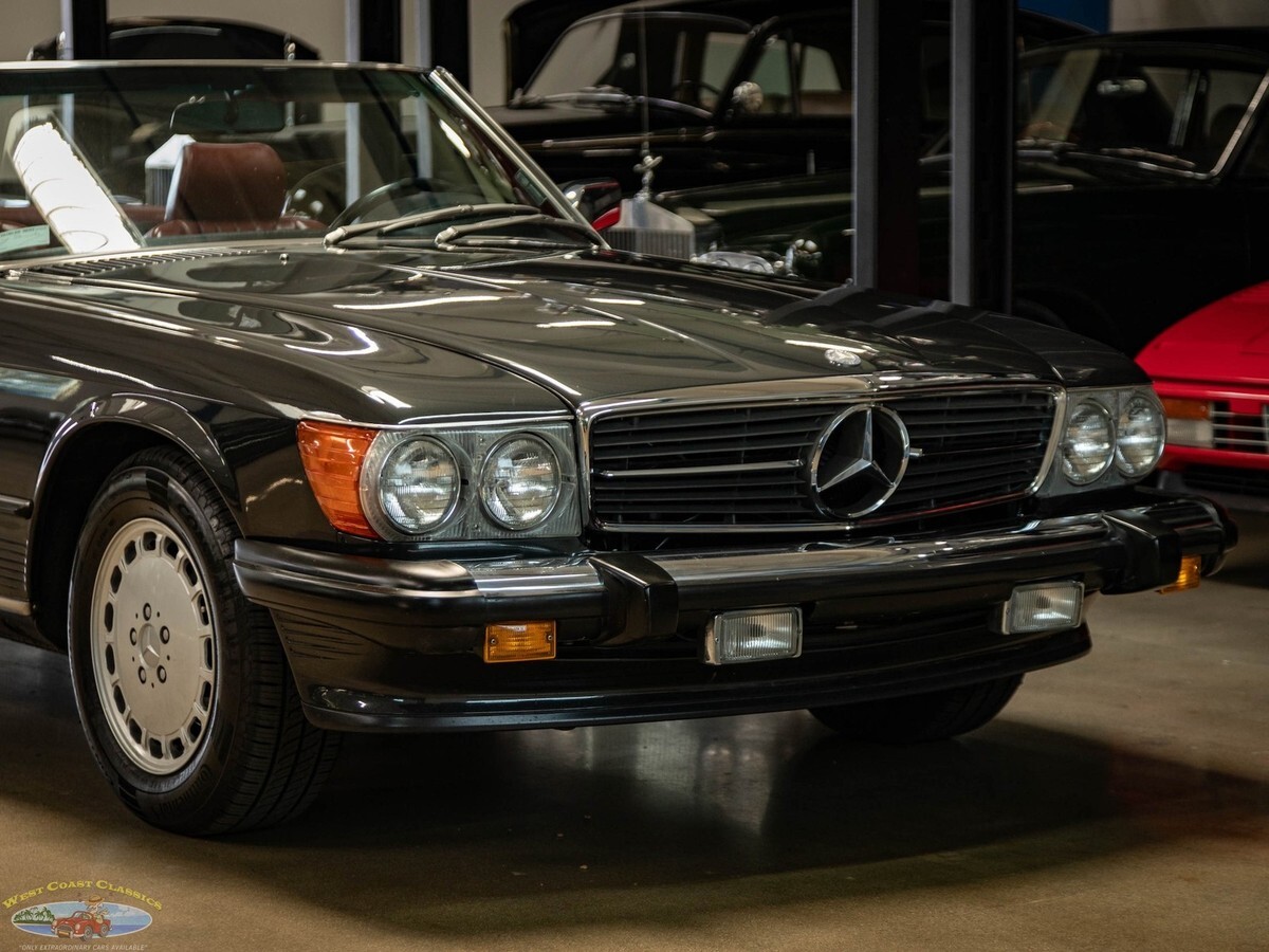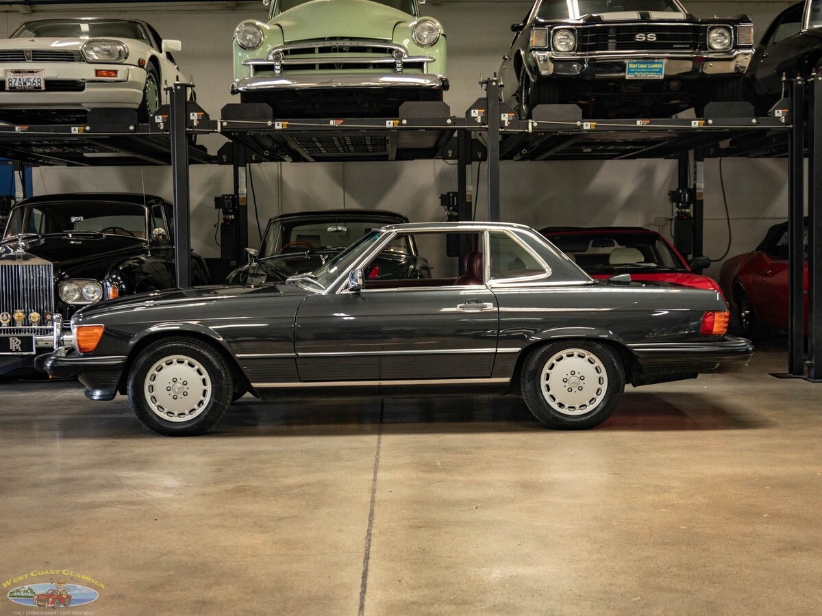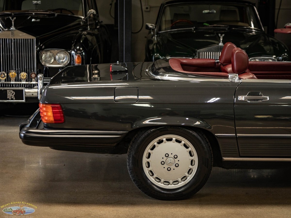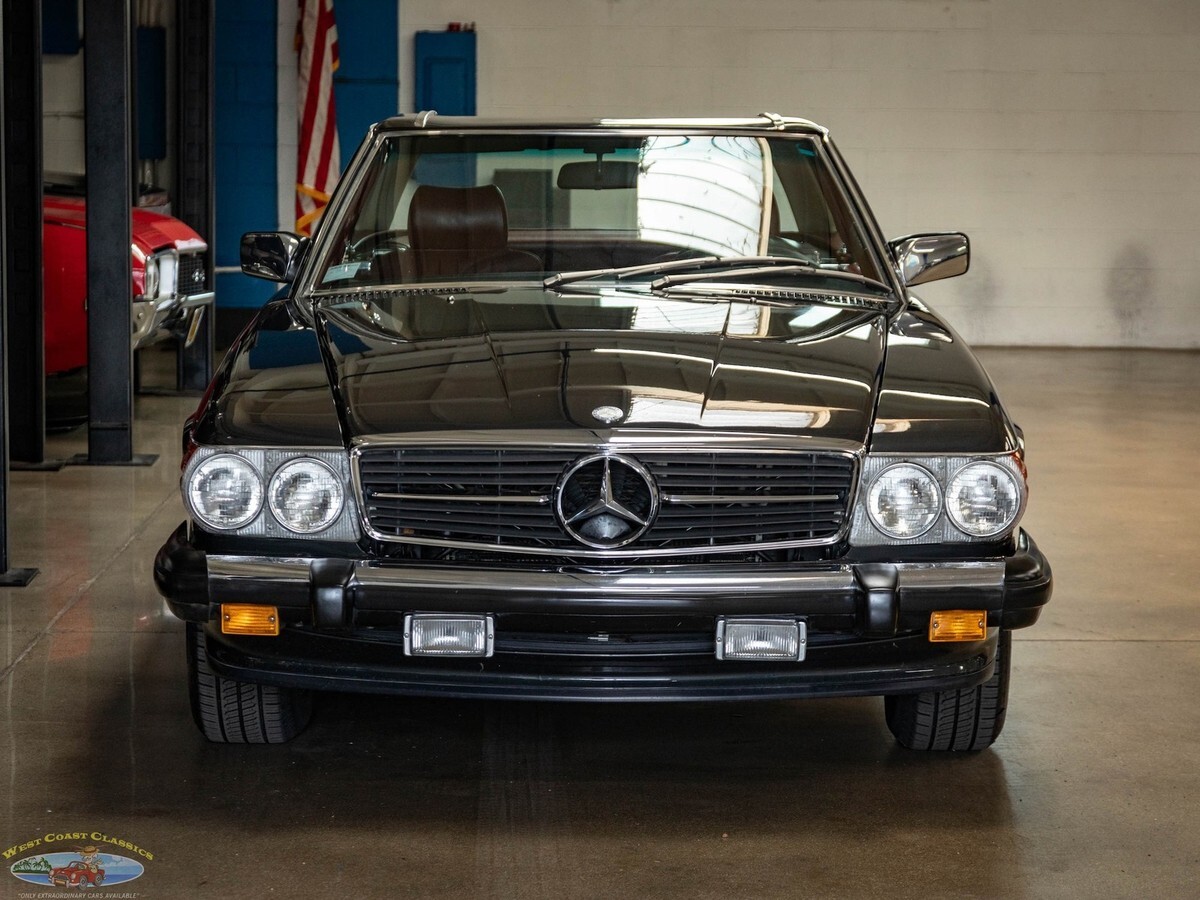 West Coast Classics are proud to present an absolutely exceptional example of this all original 1987 Mercedes-Benz 560SL roadster in its highly desirable and very striking original factory 'Black Pearl Metallic' (color code 199) paint with a gorgeous 'Medium Red' (trim code 277) leather interior, its original and hardly used original 'Black' German (code 740) folding canvas soft top, factory alloy wheels, matching factory hard top and only 21,785 original and actual miles (35,061 kms)! Quite simply, if you want to own one of the very best examples of a 560SL anywhere, you've found it here!ORIGINAL 21K MILESALL SERVICE HISTORY FROM SAME ONE MERCEDES-BENZ DEALERSHIP WHERE SOLD FROM 1987-2025.EVERY SERVICE RECORD SINCE NEW!ORIGINAL 'BLACK PEARL METALLIC PAINT' FACTORY COLOR PAINTORIGINAL 'MEDIUM RED' LEATHER INTERIORALL ORIGINAL OWNERS MANUALS, PORTECTO-PLATE AND SERVICE BOOKLETSORIGINAL FACTORY TOOLS & SPARE WHEELORIGINAL FACTORY HARD TOP & SOFT TOPA/C CONVERTED FROM R12 TO R134AThe car's factory options include: 5.6 liter OHC V8 engine, automatic transmission with torque converter, supplemental restraint system, anti-theft alarm system with radio theft deterrent, power assisted steering, cruise control, tinted glass, electric window lifts, electrically heated rear window on hard top, fully independent suspension, power assisted four wheel disc brakes, anti-lock braking system, light alloy wheels, limited slip differential, leather upholstery, adjustable bucket seats and head restraints, front center folding arm rest, leather covered steering wheel and gear selector, original 'Becker Grand Prix' radio/cassette with automatic antenna, Aerodynamic Halogen Head & Fog lamps and air conditioning with automatic climate control and central locking.Obviously always garaged and covered with no accidents and a clean CARFAX report with the original and very rare factory 'Black Pearl Metallic' color paint still virtually flawless and with an absolutely beautiful condition 'Medium Red' leather interior with virtually no signs of any wear and with the original leather dashboard and the walnut wood veneer interior still like new (obviously always garaged from the sun and elements!) The car has its original Black 'German canvas' soft top which is still in as new condition and was never used and the car has it's original and also factory matching hard top with stand. The car boasts all its original owners manuals, service booklets, protecto-plate, and tools still unwrapped in their original factory canvas pouch.The car boasts a thick file of all its original records and service receipts and all the original selling dealers documentation from 'Lonestar Motors' the Mercedes-Benz dealership of Calgary, Alberta, Canada where the car was regularly serviced on schedule since new until 2023! The car also boats its original spare tire and wrapped factory tools still in its compartment in the trunk. The car has 4 brand new tires.The car drives exactly like such a well maintained and serviced and fully documented Mercedes with only 21K original miles should and must be seen and driven to be truly appreciated! All the options are working as they should including the A/C.Without a doubt, this is one of the finest classically beautiful roadster designs built by Mercedes-Benz, probably the last classically beautiful convertible series they built and now becoming more desirable and collectible than ever before - certainly you will look long and hard to find a finer head-turning example with full documentation and with only 21K original miles in this most striking and desirable of color combinations available anywhere else!