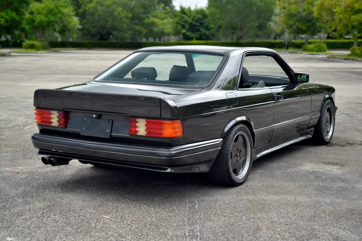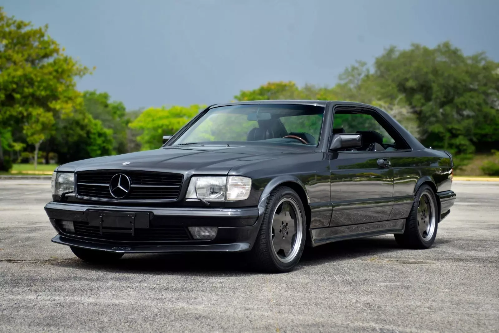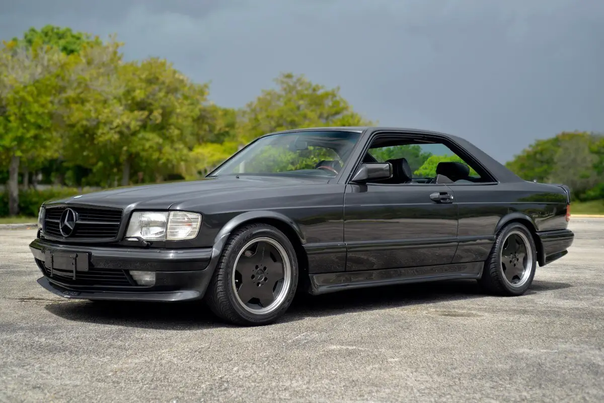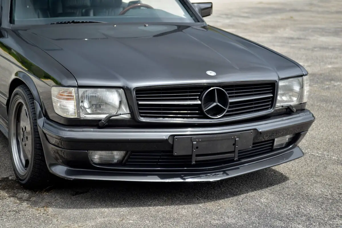 Available now this amazing German Market Mercedes-Benz 560SEC finished in Blue Black Metallic (199U) over black leather (261) and equipped with pre-merger AMG kit.