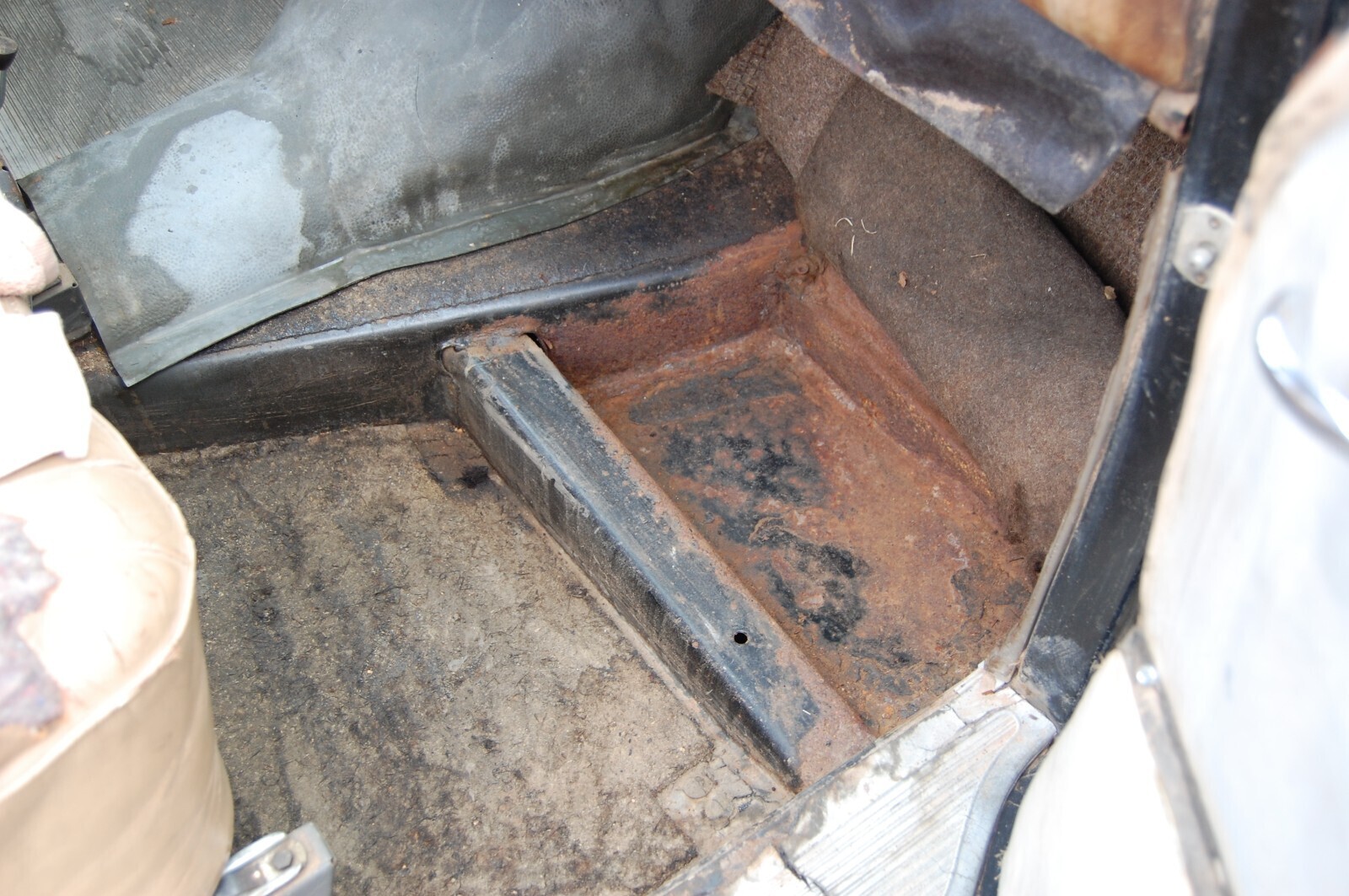 Removing the carpet, pad, and wood floor panel reveals -solid floors. So this car escaped water runoff from rain and snow entering the cabin. No evidence of rodents.The interior is sundamaged but shows original cowhide leather seats, and door panels. The interior chrome embelishments are all still intact, instrument panel all intact, door handles, window cranks, even the dashboard trim is all there. German handcrafted beech hardwood dashboard and window trim with rear ashtrays! Headliner long gone.