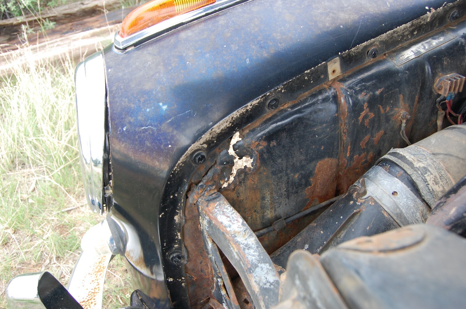 The exterior is sunbleached, a different hood was installed, will need a windshield. Possible areas of hail damage to the roof only. There are 2 areas of concern with rust. The engine bay wall (left side) has an area the size of an adult palm that is rusted through. And the battery tray has a small amount of rust under it. The trunk amazingly has no rust through. These are usually the first to rust out due to a failed seal. Spare tire wells still have factory paint!