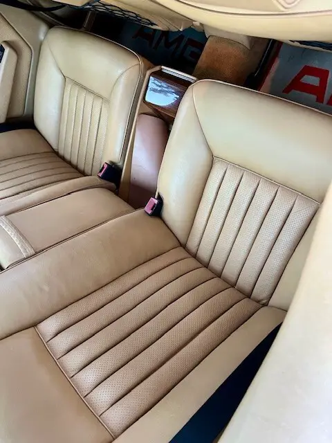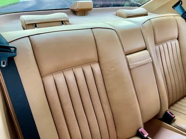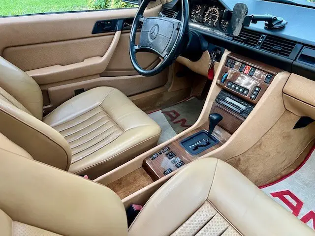 The interior is finished in leather with four-place seating. The color code is 274, which is usually known as Palomino; the color has also been referred to by Mercedes in different markets as Light Brown, Java, Date or Saffron. The leather shows virtually no signs of aging, just a few character lines on the driver seat bolster. Both front seats are power-operated, including the head restraints; the driver’s seat has two-position memory which includes the telescoping steering wheel. Every feature inside the car works, even the seat belt presenters which hand the belt to you. The climate control system functions correctly in all settings, and still uses the original R12 Freon refrigerant; it stayed comfortable even with the few trips I have taken in the Florida heat (with outside temperatures around 100F). All of the gauges and warning lights work as expected. All four power windows work, as does the power tilt-and-slide sunroof. The vacuum door locks work from all three key openings (both doors and the trunk) and the vacuum seat back locks stay in place. The cruise control keeps a steady speed. Even the original Becker BE780 Grand Prix cassette deck still plays, great for those 80's throwback jams. The antenna was replaced with another Hirschmann unit by the last owner.