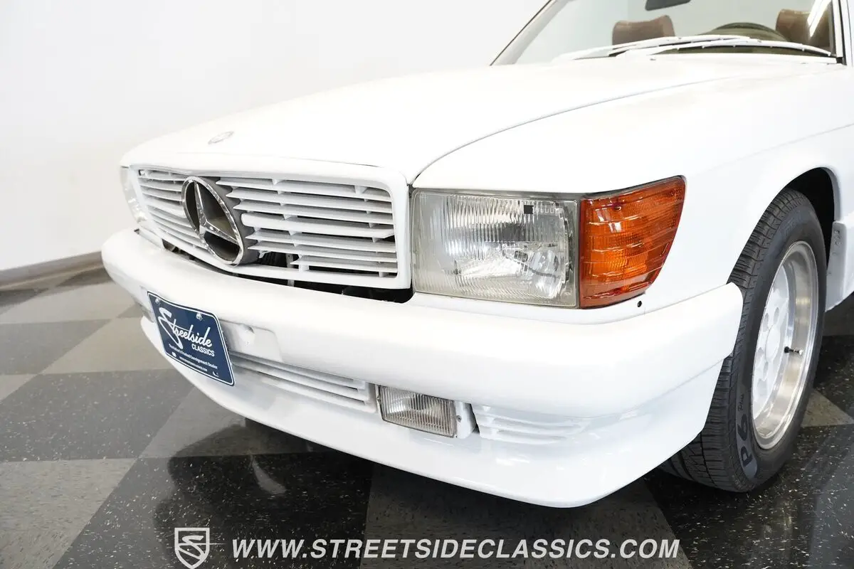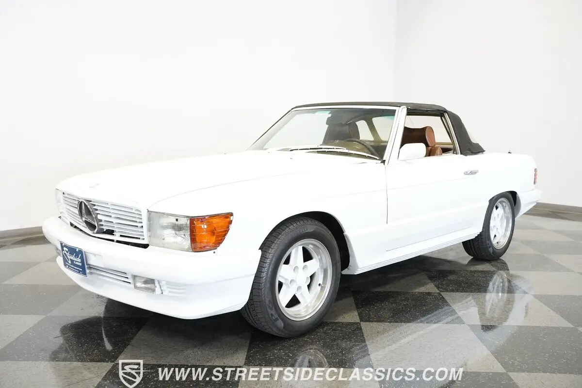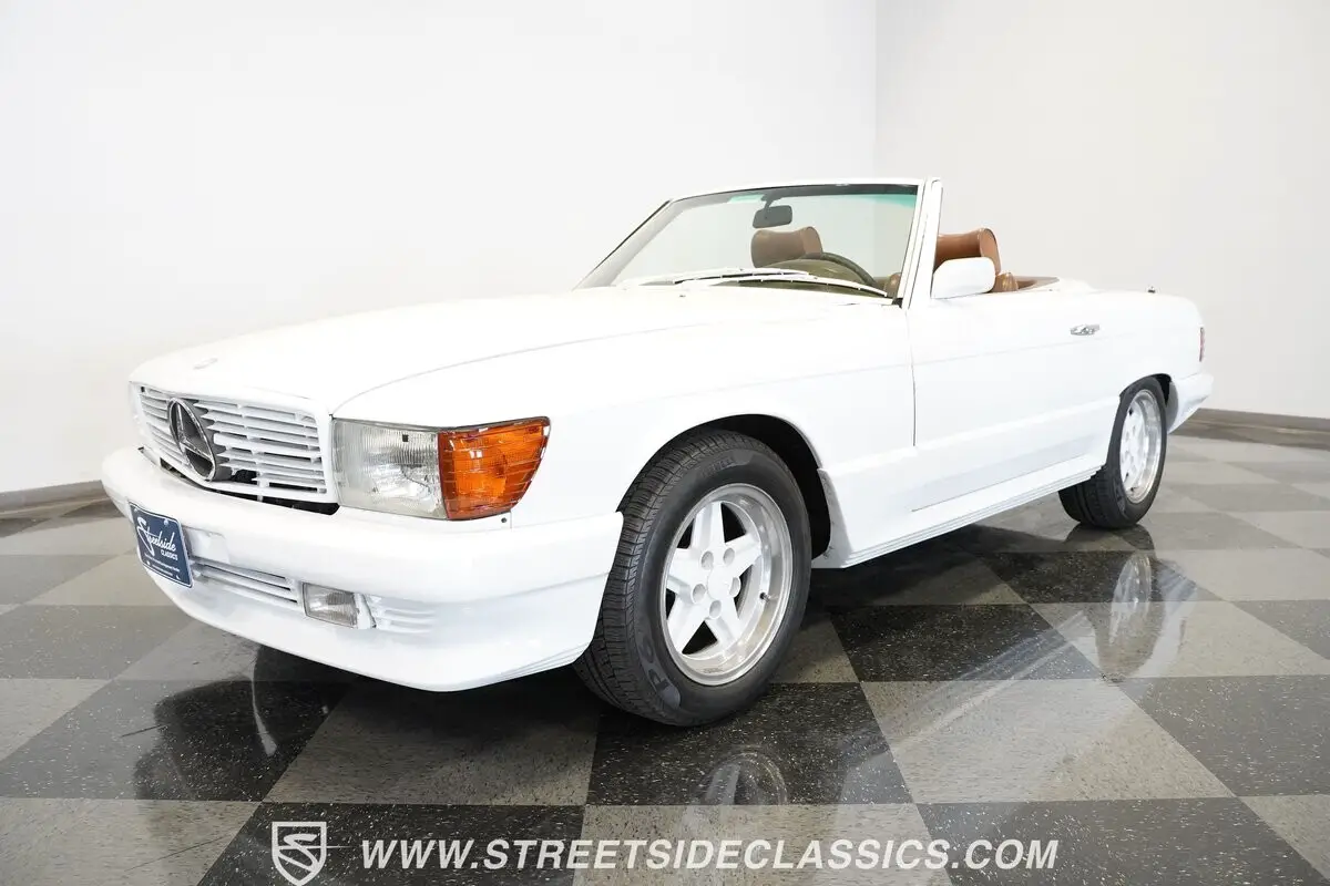 Distinctive and timeless, this 1973 Mercedes-Benz 450SL wears crisp white paint that highlights its clean, sculpted body lines. The Euro-style front end and color-matched bumpers give it a tailored appearance, while the AMG Penta-style 16" aluminum wheels with white painted centers and polished rings add a custom touch. Black canvas top folds away for open-air driving, with a white removable hardtop included for cooler weather options. The Pirelli P6 tires in 225/55R16 sizing sit at all four corners, completing the visual package and providing good road contact for improved handling.