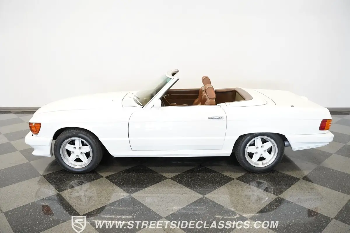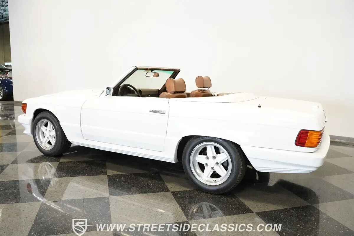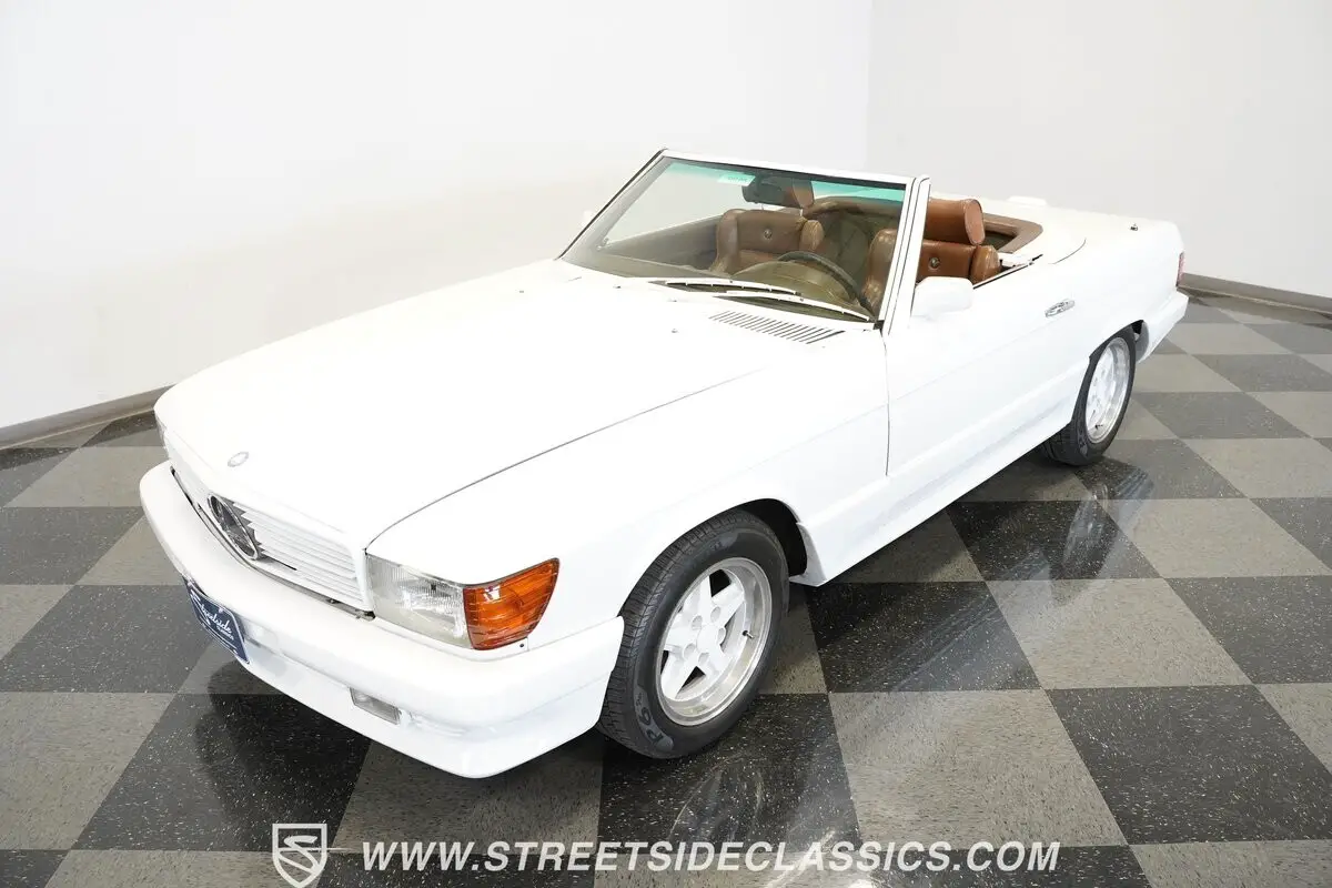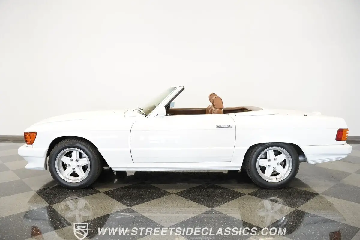 Distinctive and timeless, this 1973 Mercedes-Benz 450SL wears crisp white paint that highlights its clean, sculpted body lines. The Euro-style front end and color-matched bumpers give it a tailored appearance, while the AMG Penta-style 16" aluminum wheels with white painted centers and polished rings add a custom touch. Black canvas top folds away for open-air driving, with a white removable hardtop included for cooler weather options. The Pirelli P6 tires in 225/55R16 sizing sit at all four corners, completing the visual package and providing good road contact for improved handling.