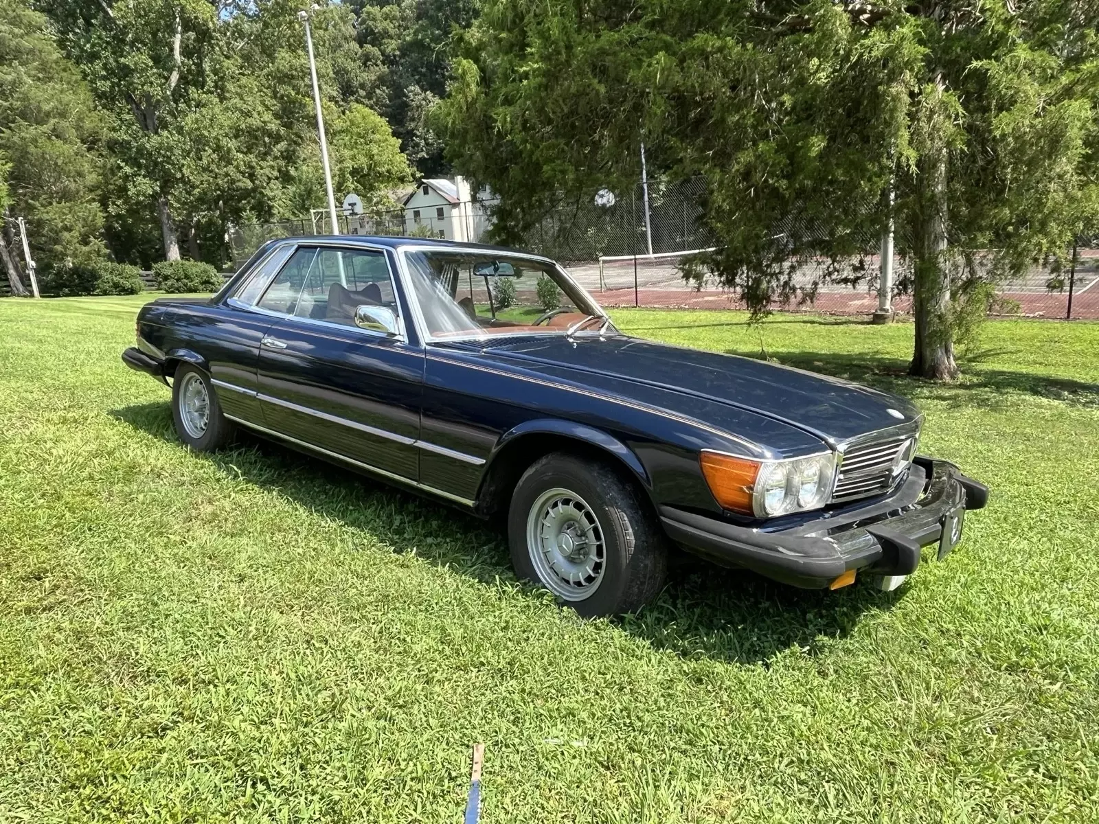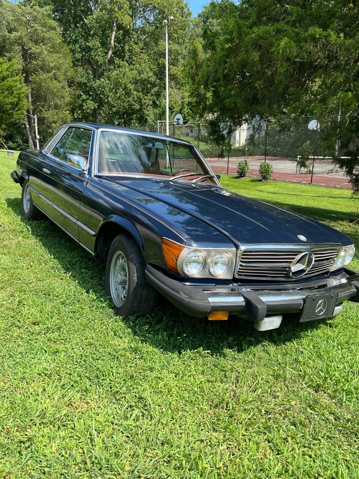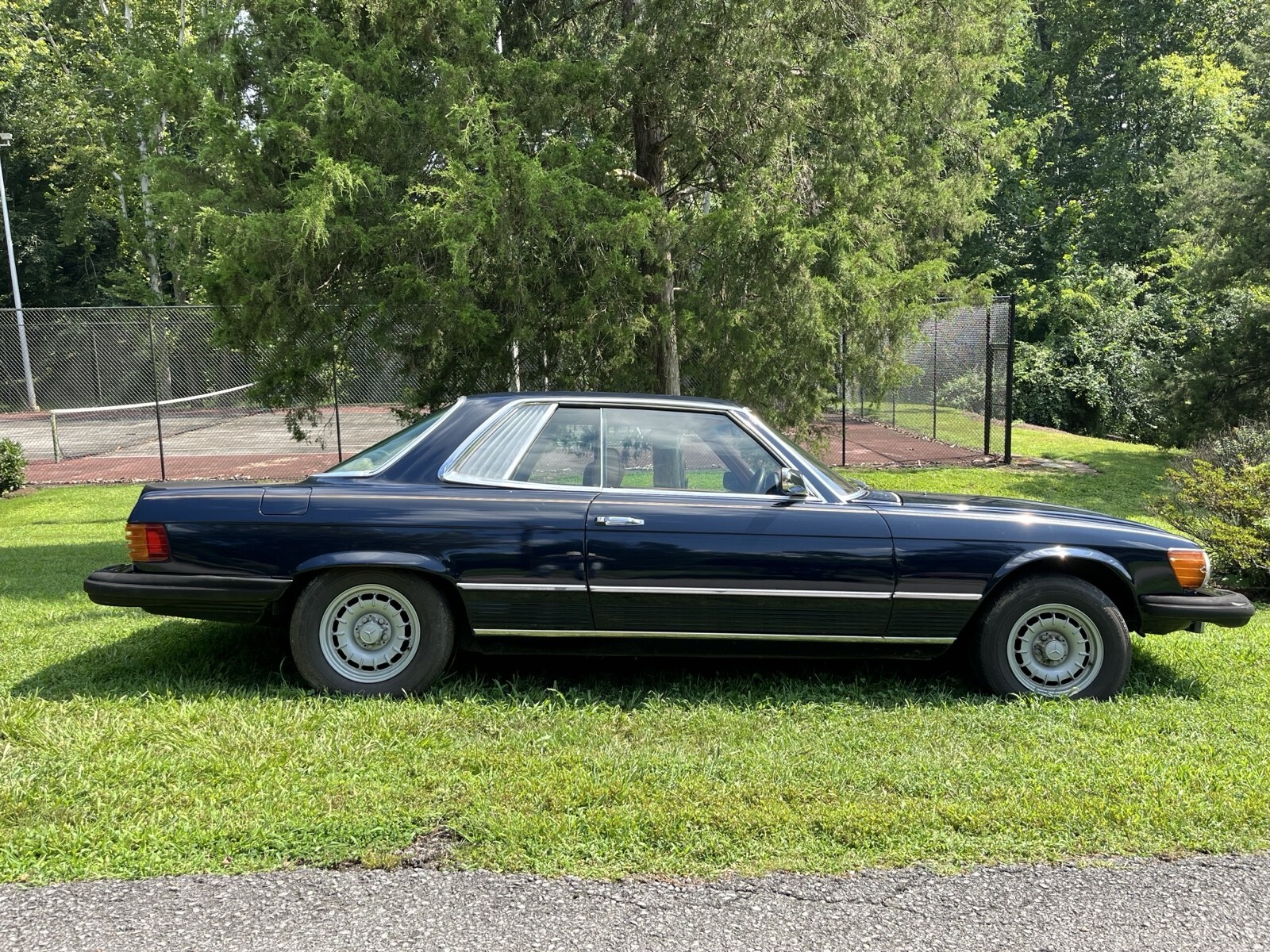 1974 Mercedes-Benz 450 SLC Coupe, two-owner car showing 159,812 miles. Finished in dark blue with tan leather interior. Equipped with the original 4.5L V8, automatic transmission, and rear-wheel drive.