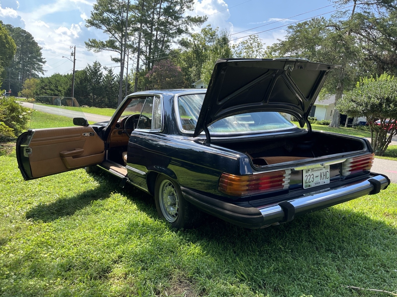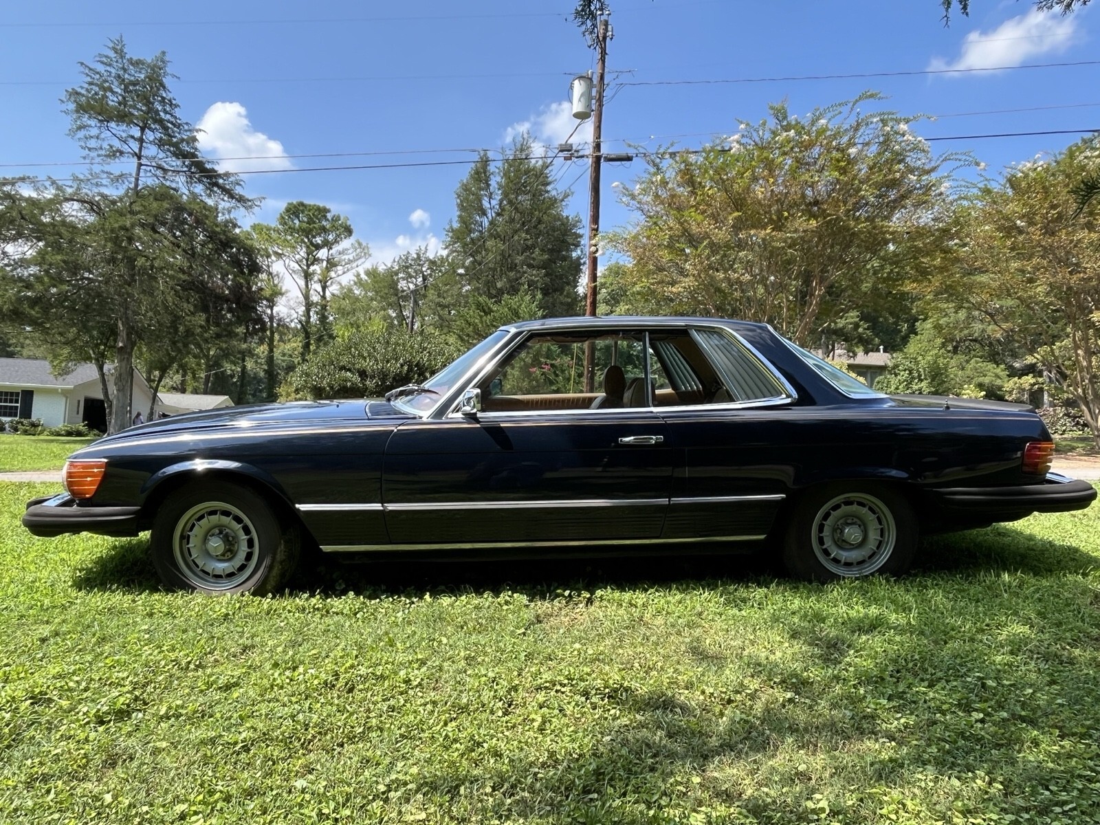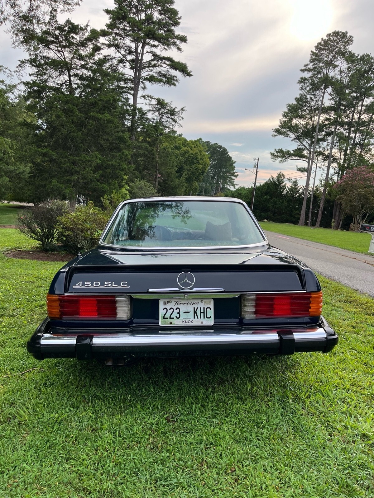 1974 Mercedes-Benz 450 SLC Coupe, two-owner car showing 159,812 miles. Finished in dark blue with tan leather interior. Equipped with the original 4.5L V8, automatic transmission, and rear-wheel drive.