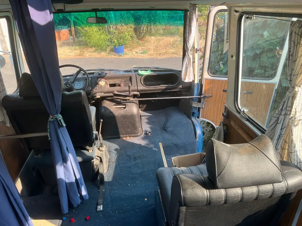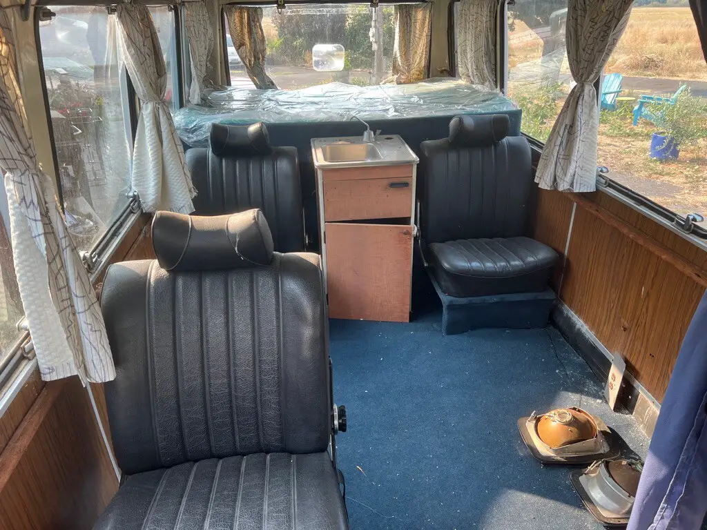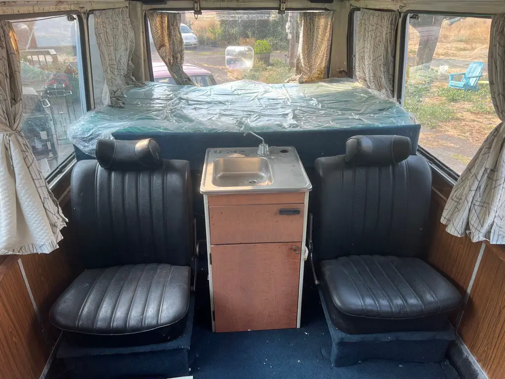 Previously used as a church bus, but last owner gutted (more or less) and added Mercedes Sedan seats and some Westfalia items, and a bed platform. Used as a camper after that.